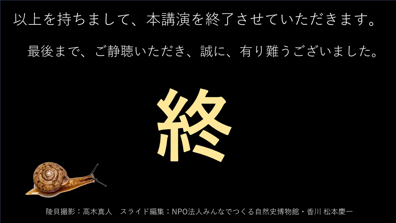 まあ、なんかちょっと時間オーバーしましたけど、こんな喋ったらね、私、好きなんです。カタツムリの話だったら。一晩でも、二晩でも、ずっと続けて話しているので、また、いつでも、退屈したら呼んでください。