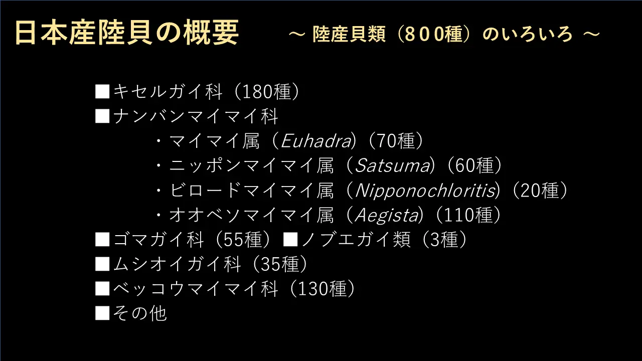 日本にある日本にはどれぐらいカタツムリが住んでるかと言いますと、だいたい800種類です。キセルガイ科が180と。で、あとナンバンマイマイ科というのがあります。それからゴマガイ科、ノブエガイ科というのが、これをまたちょっと後で私に関係があるので言います。ムシオイガイ科が35種で、ベッコウマイマイ科・・全部で800種類ですけれども、ほとんどが右巻きです。