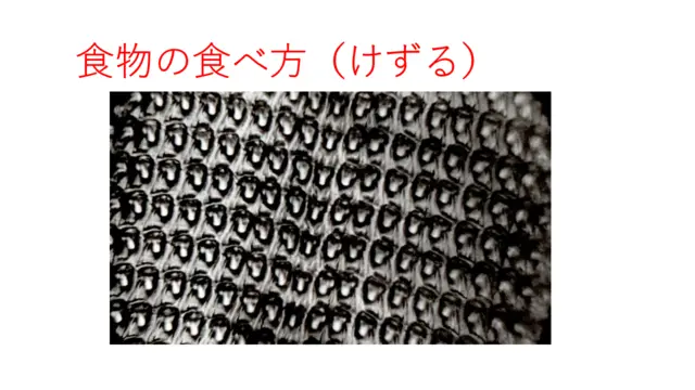 で、この上、これが一つ一つの歯で、なんかこう、削って、食べて栄養にしております。まあ、植物性のものがほとんどで、あとでも出てきますが、ナメクジの中にはカタツムリ食べるのってね、ちょっと例外はあります。もう例外は生物にはもういい、普通にあることですけど、まあ一般的には、こういうヤスリで削ってものを食べる。だから人参を、人参を食べたら人参の色をした糞をします。それから葡萄と、なんかスイカ食べたらスイカの糞が出ます。新聞紙食べさせたら新聞紙の糞をします。ここに持ってきとったんやけど、こんな本が出てます。
