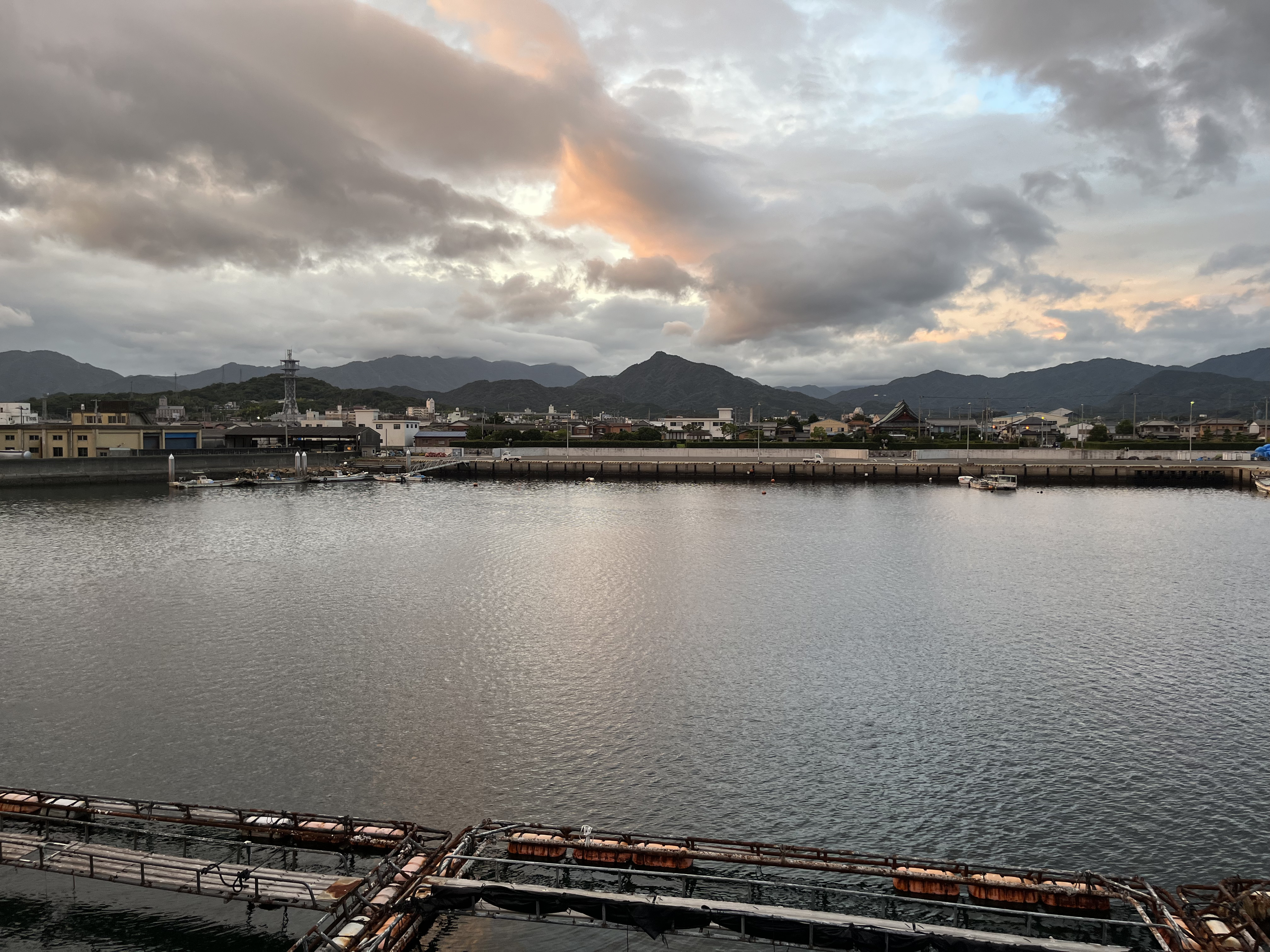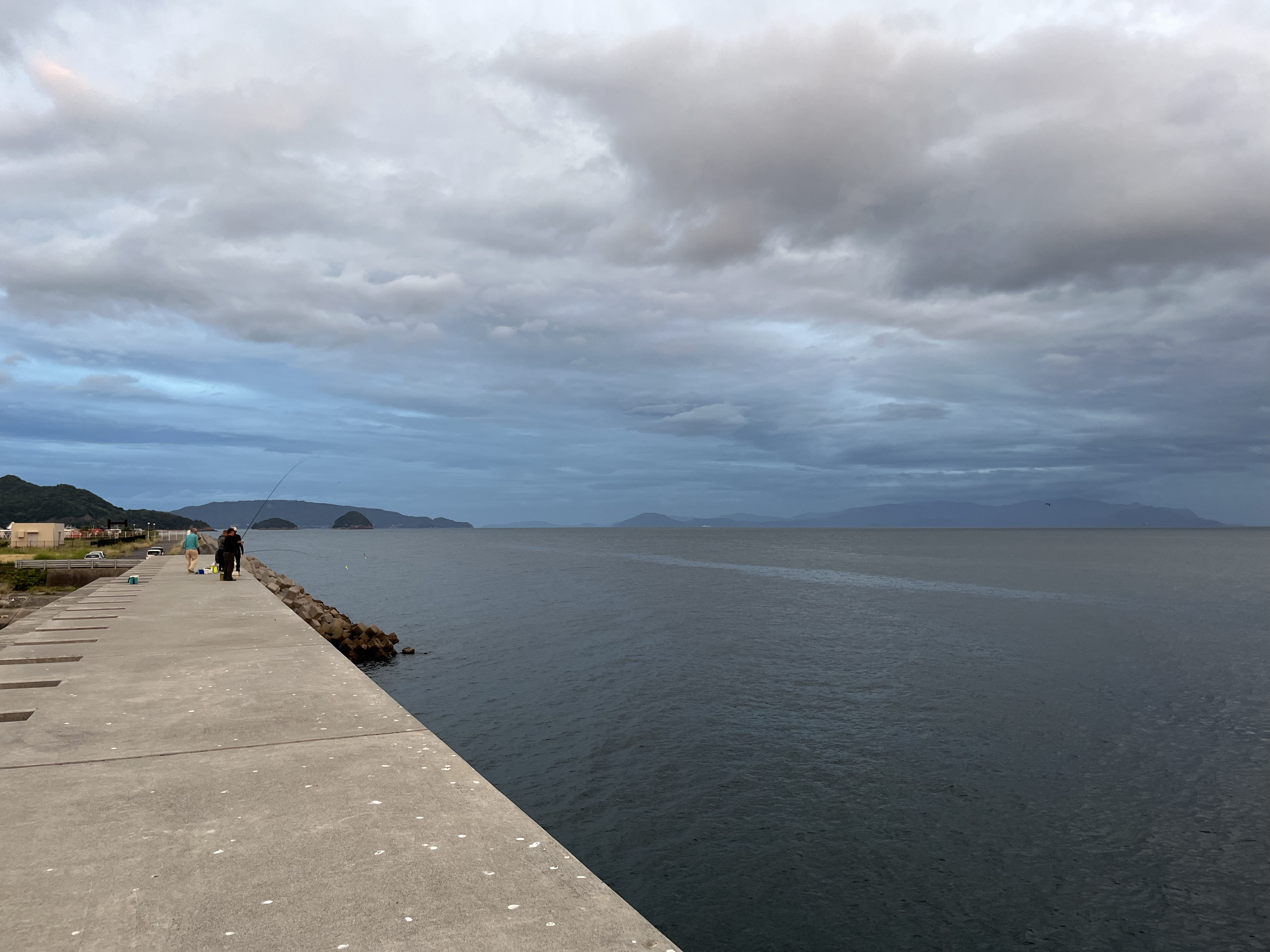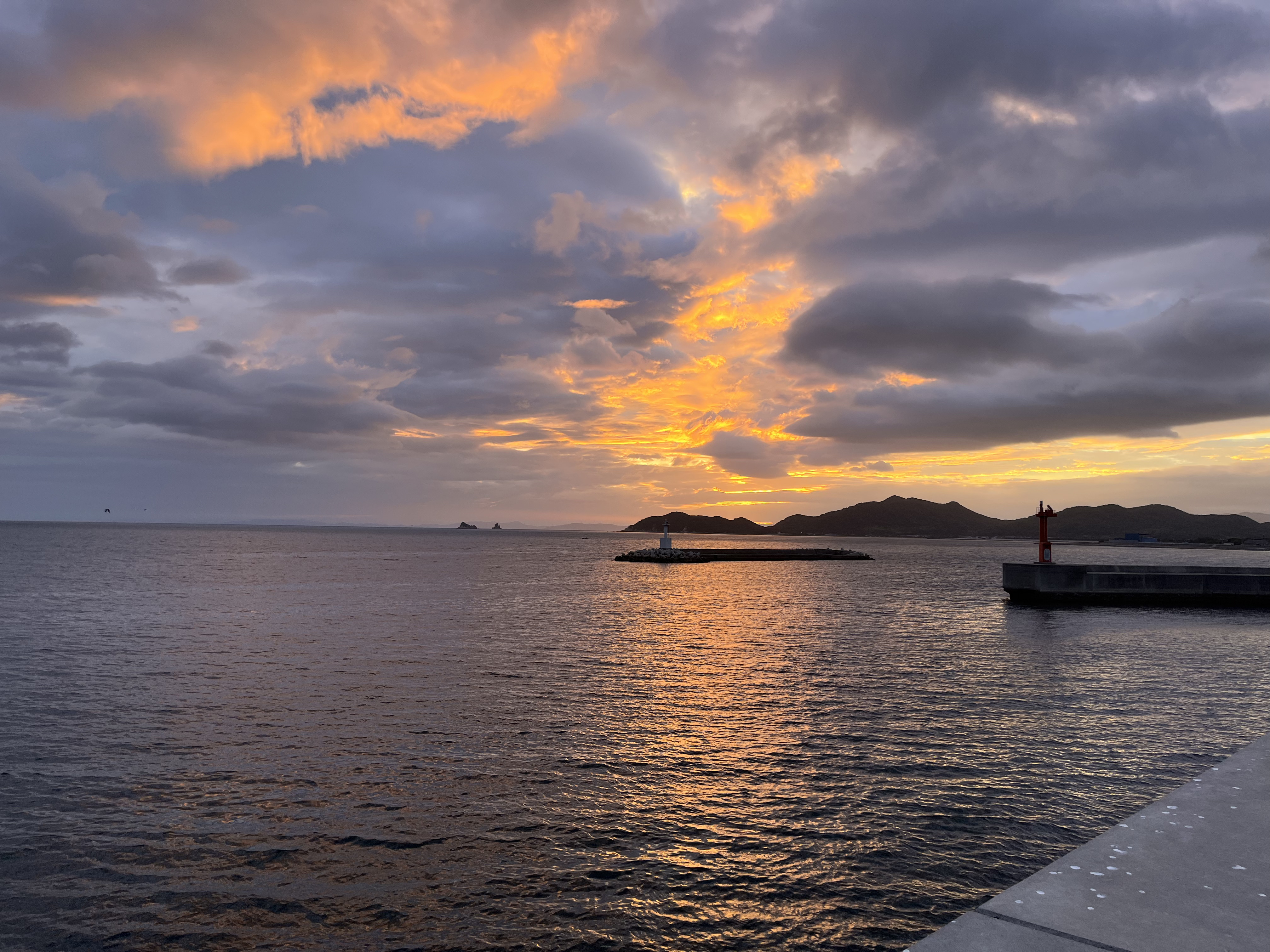 気温24℃、西の風が吹き流し角度80°くらいでやや強く吹いています。空は曇り、雨雲らしき雲があちこちに見えます。ランプロファイヤー山塊と与治山山塊の上空の雲が紅く染まり、束の間、太陽が姿を見せました。小豆島の南航路には真っ白の阪九フェリー「いずみ」が東に向かっています。釣り客はこの波止に4人と取巻き、港に1人です。