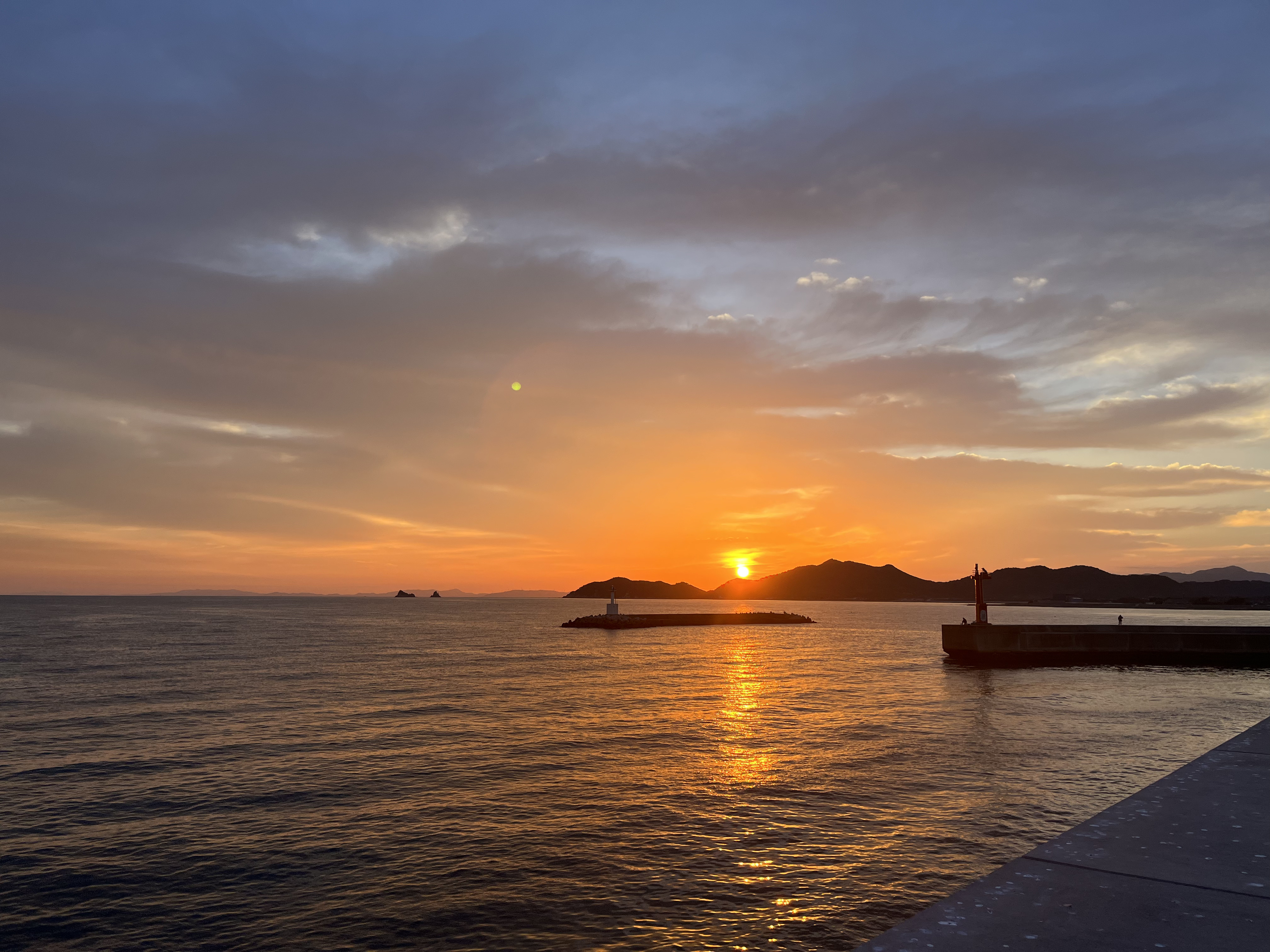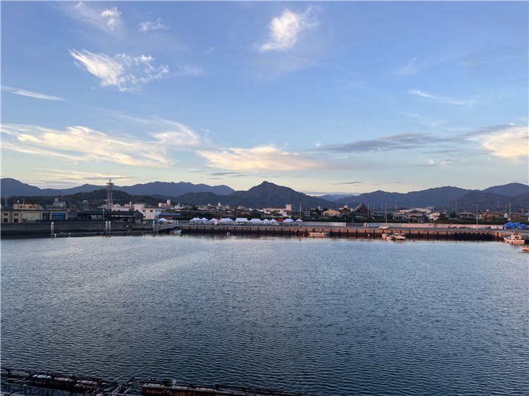 気温21℃、風が穏やかに吹いています。晴れ。淡路島や対岸の山々、小豆島もよく見えます。太陽が与治山山塊の北の端の山の端から出て来ました。釣り客は赤灯台に2~3人、この波止に4~5人、テトラに2人です。今日はこの港で「ほんのもり号寄港記念フェスタin三本松港」が開催されます。港の岸壁にはテントが立ち並んで、ほんのもり号の入校を待っています。