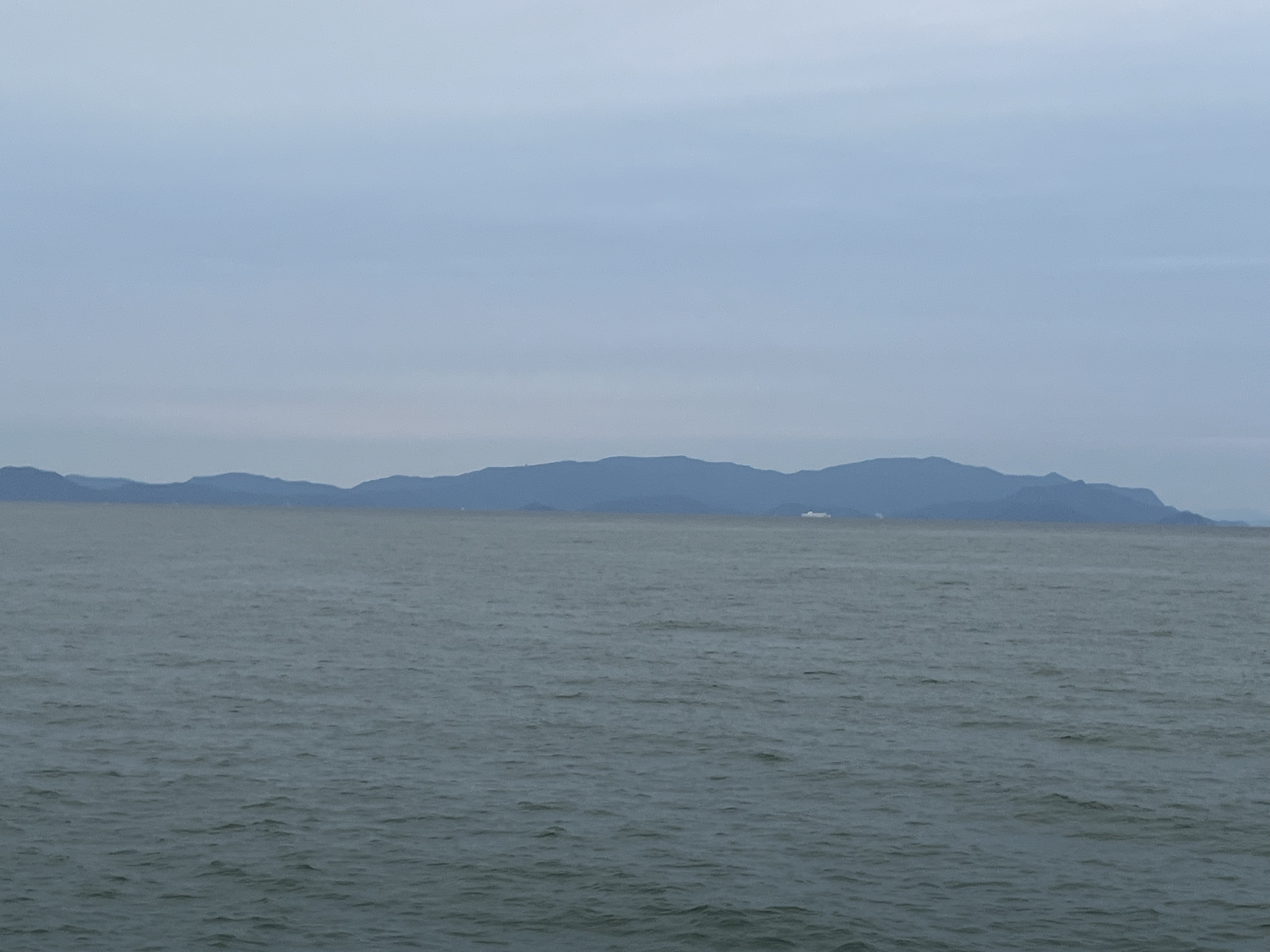 気温22℃、曇り。空一面を雲が覆っています。対岸の中国地方の山並みが見え、北の空が少し明るくなって来ました。小豆島の南の航路を真っ白の大型客船いずみが東に向かっています。太陽は結局姿を見せませんでした。海は少しうねりがあります。釣り客は東波止に1人、赤灯台に1人、この波止に3人と取巻き客3~4人です。