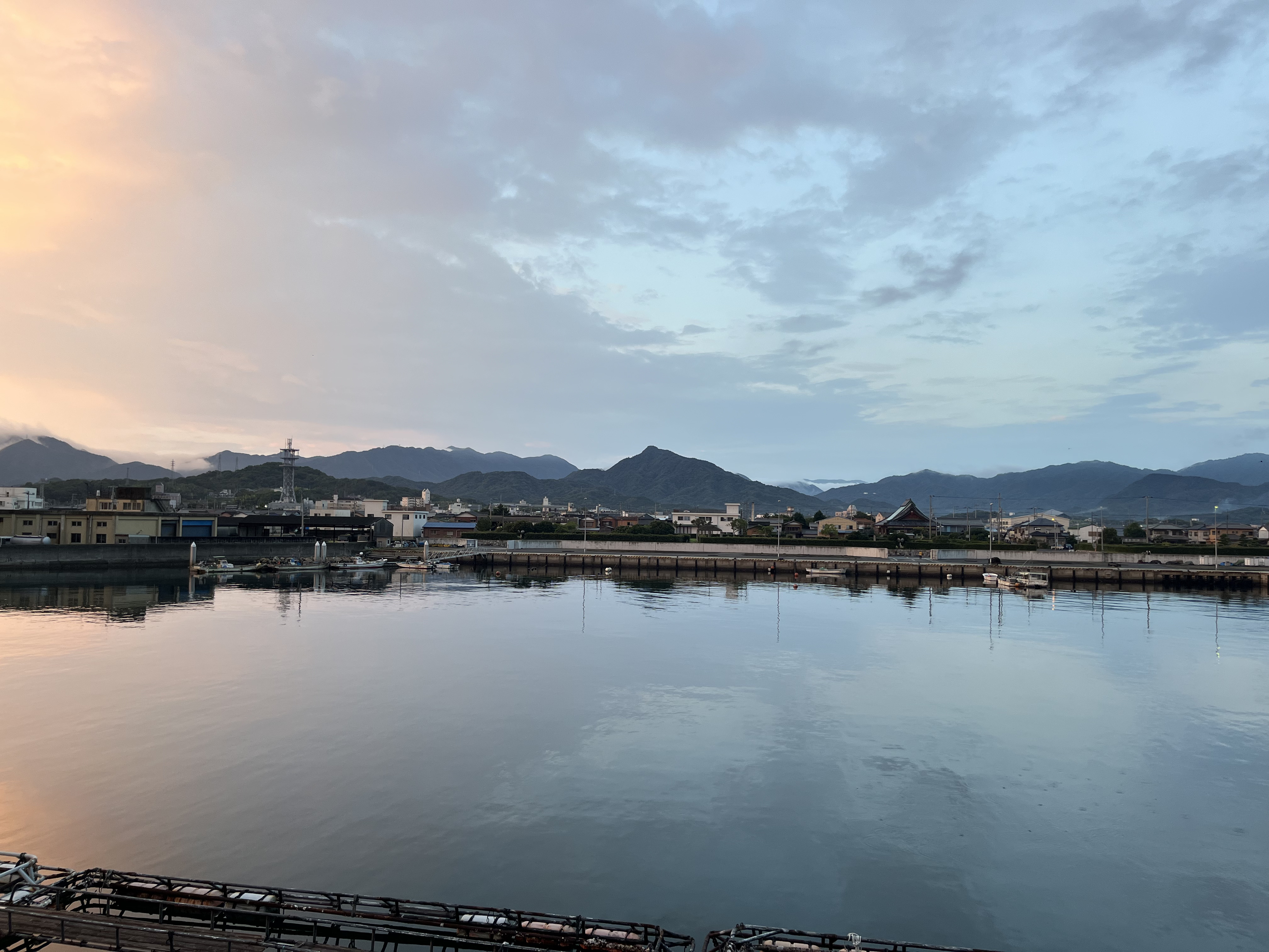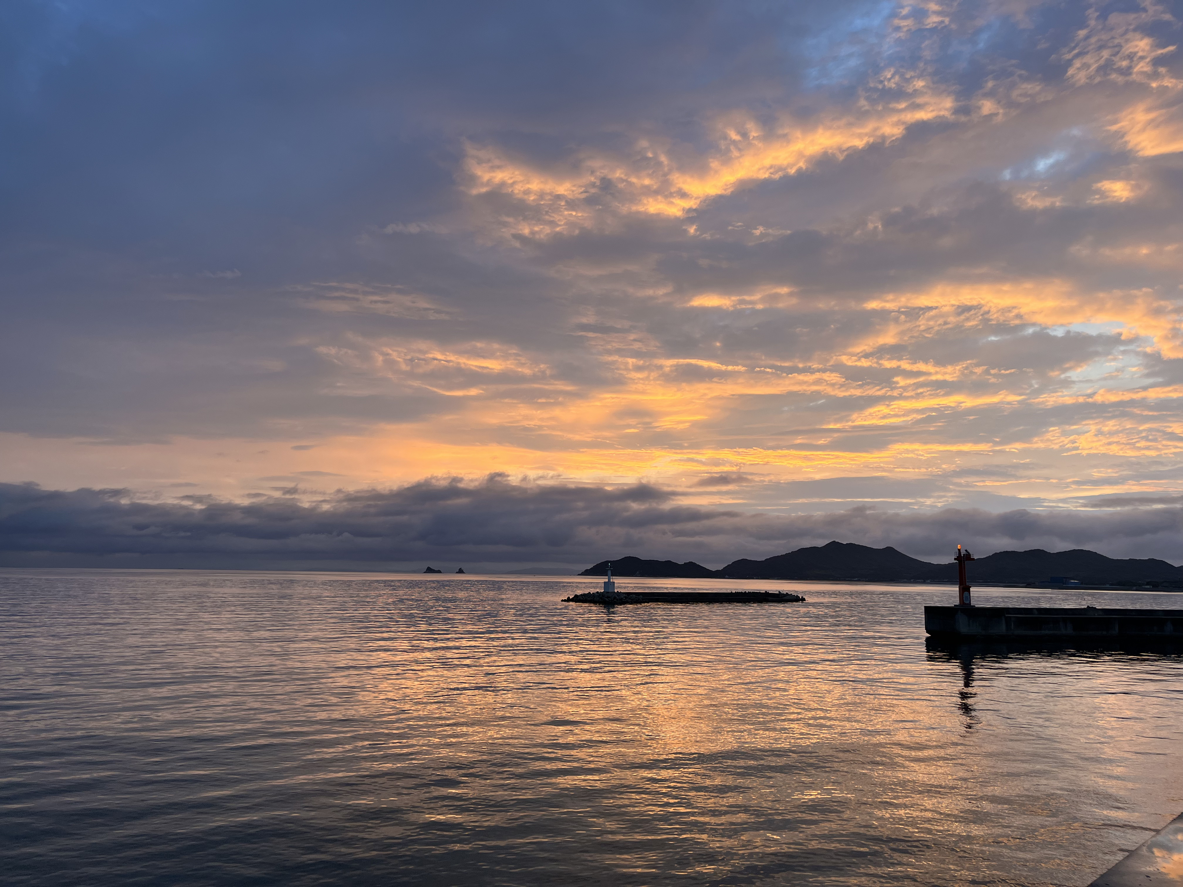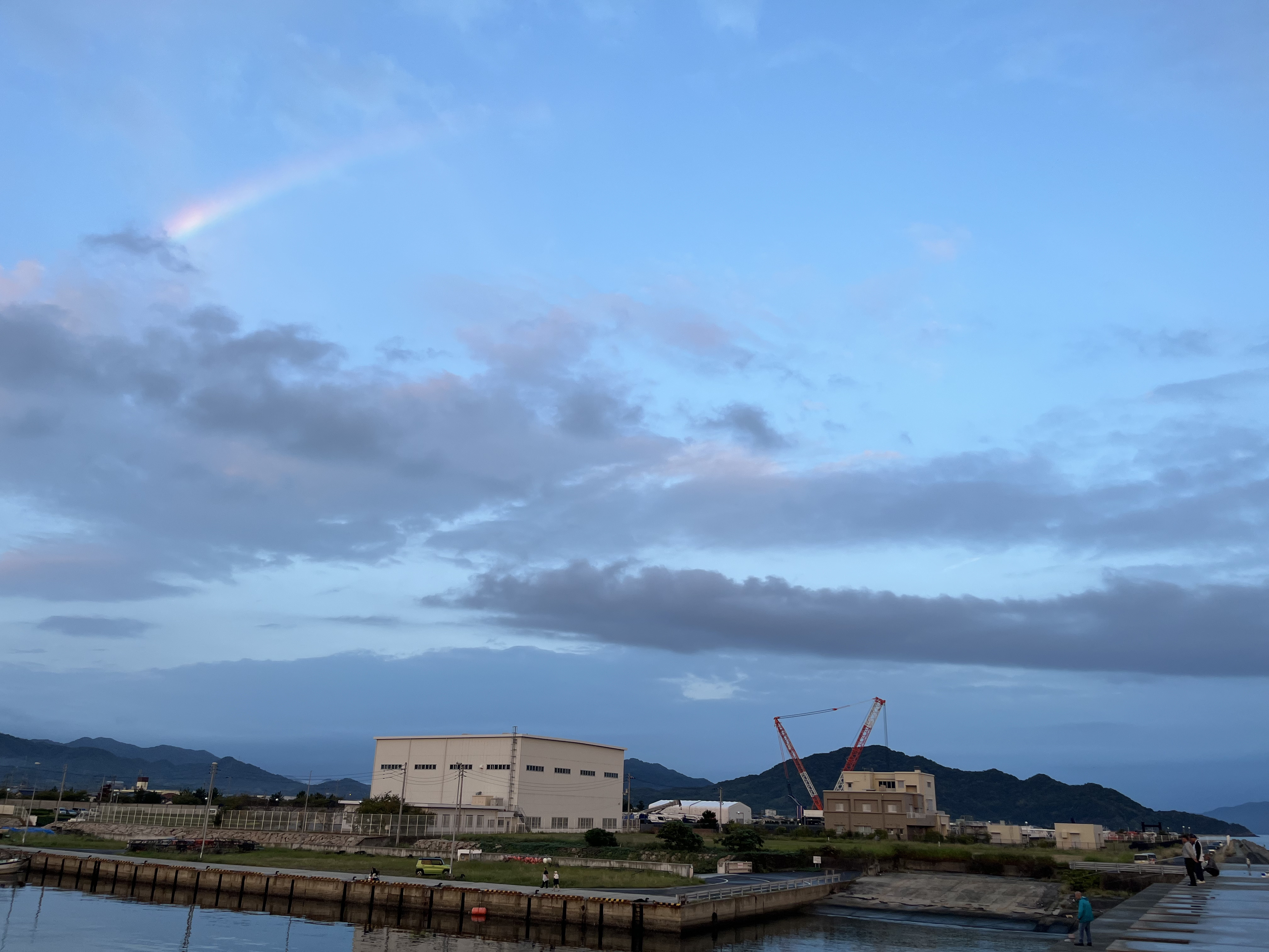 気温23℃、曇り空、風はほとんどありません。阿讃山脈の尾根筋にも雲が懸り、与治山上空の雲の合間が紅くなっています。太陽は姿を見せません。釣り客は東波止に1人、赤灯台に1人、この波止に3人、テトラに2~3人、港に1人です。西の空に久しぶりに大きな切れ切れの虹が掛かっています。暫くして、太陽が雲の上に姿を見せました。