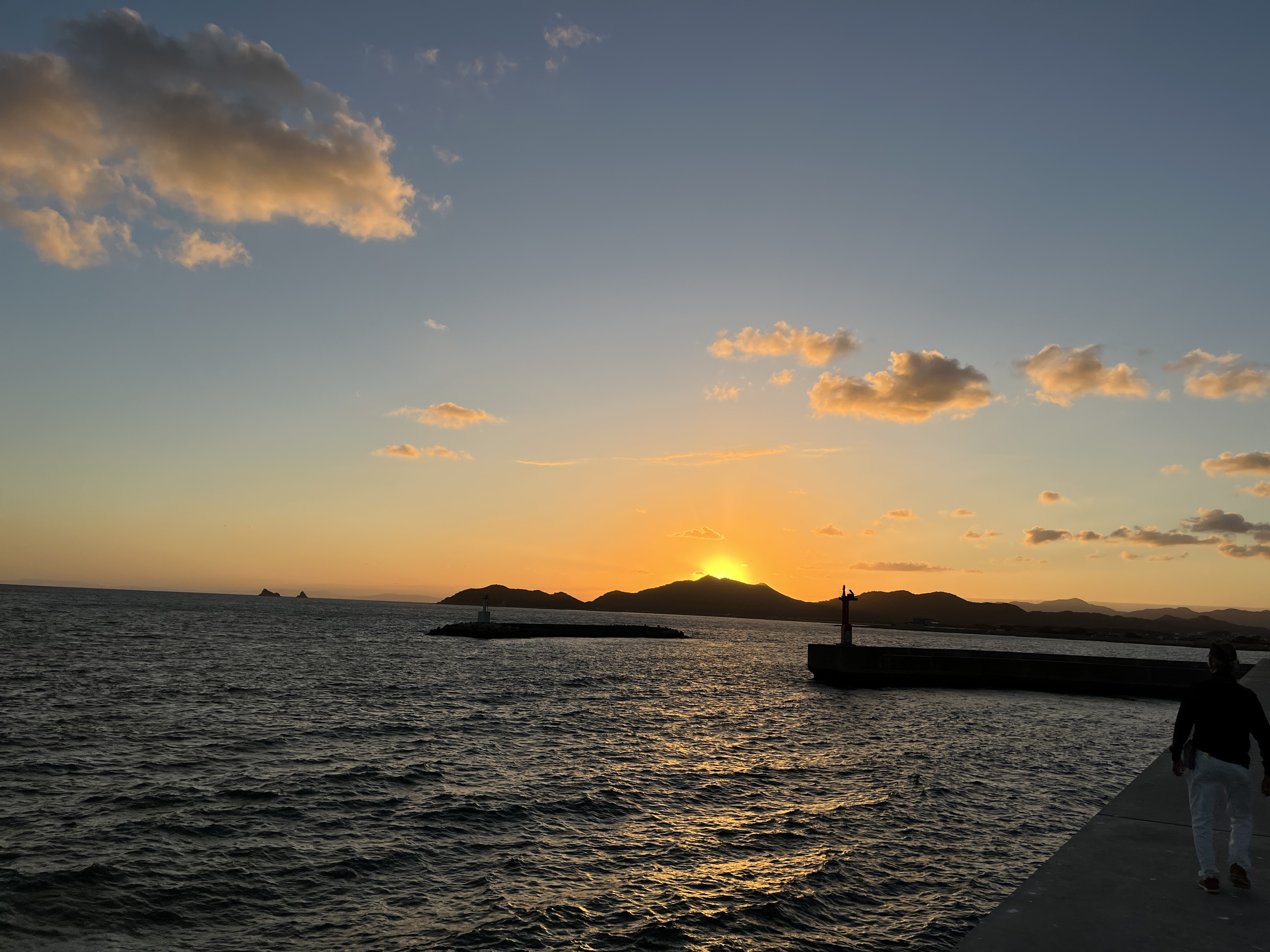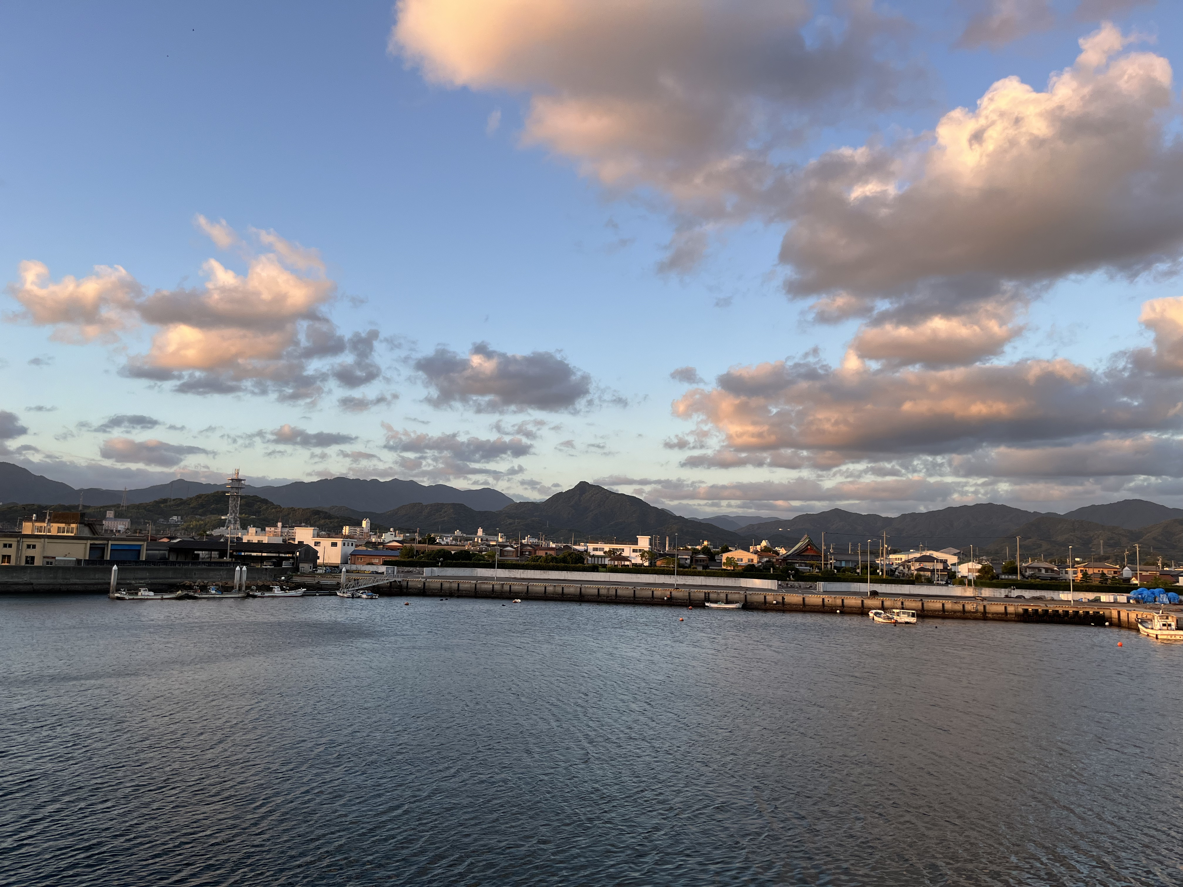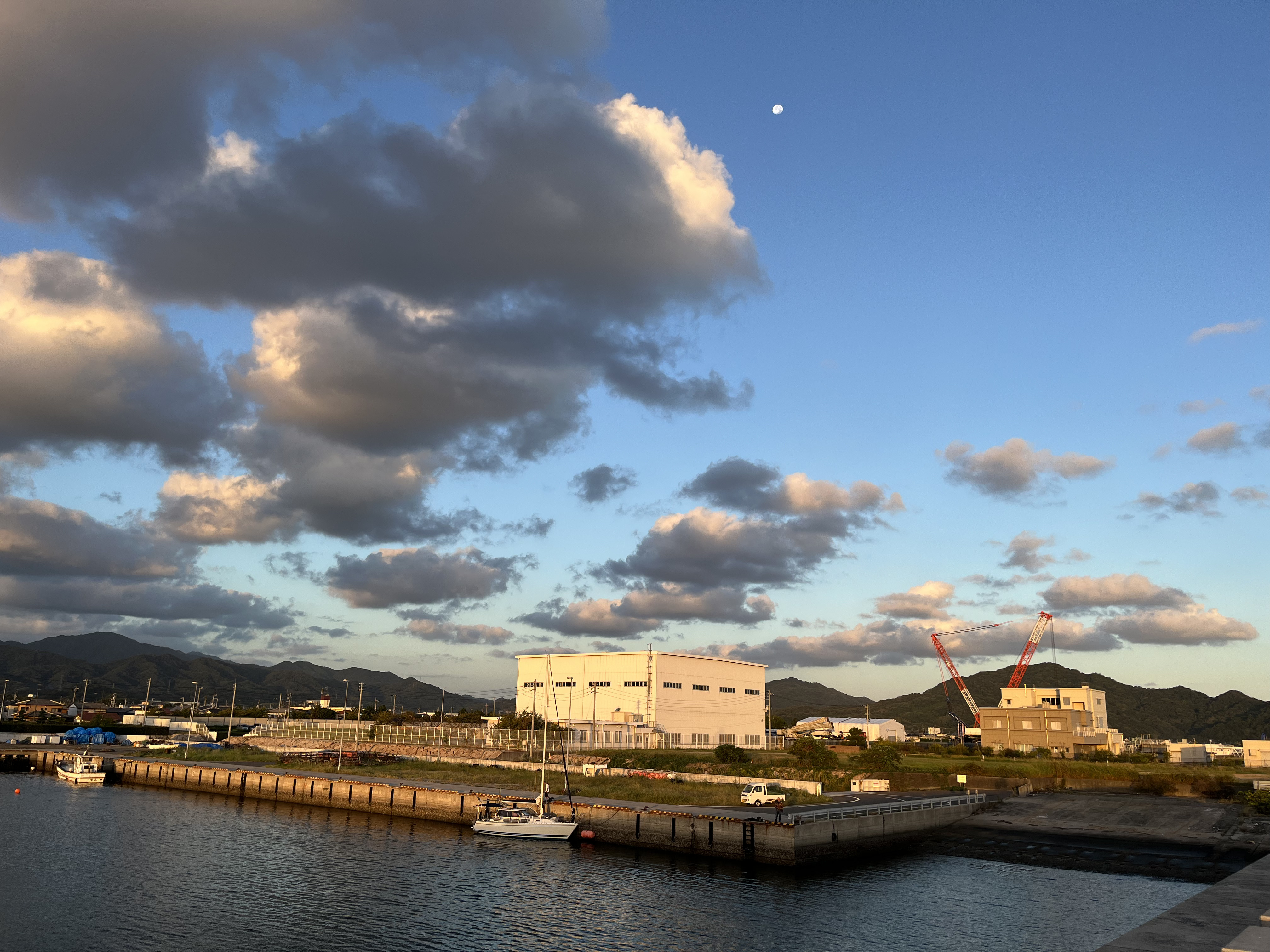 気温20℃、晴れ、雲があちこちに浮かび、西の空に少し細くなった十七日の残月が見え隠れしています。波止の上は東寄りの風が強く吹き、海には白波も見えます。6時15分39秒、輝く太陽が与治山山頂の南の斜面に出て来ました。釣り客はこの波止に2人、テトラに1人、港に1人です。波は高くても釣果はまあまあ。港に白いヨットが1艘、寄港してくれています。小豆島の南の航路に船長300mの白い貨物船(Cape Brolga, FindShipから)が西に向かっています。