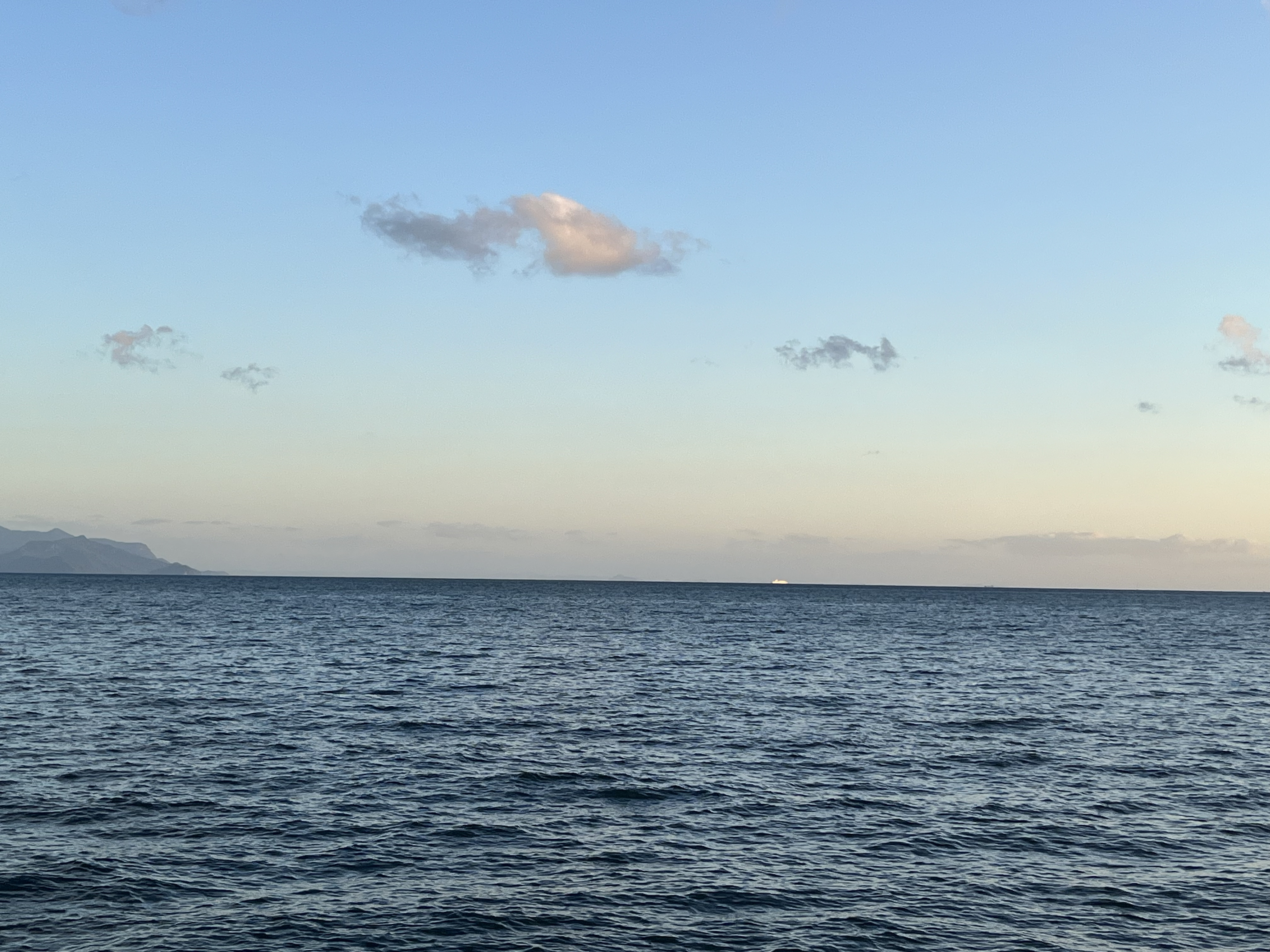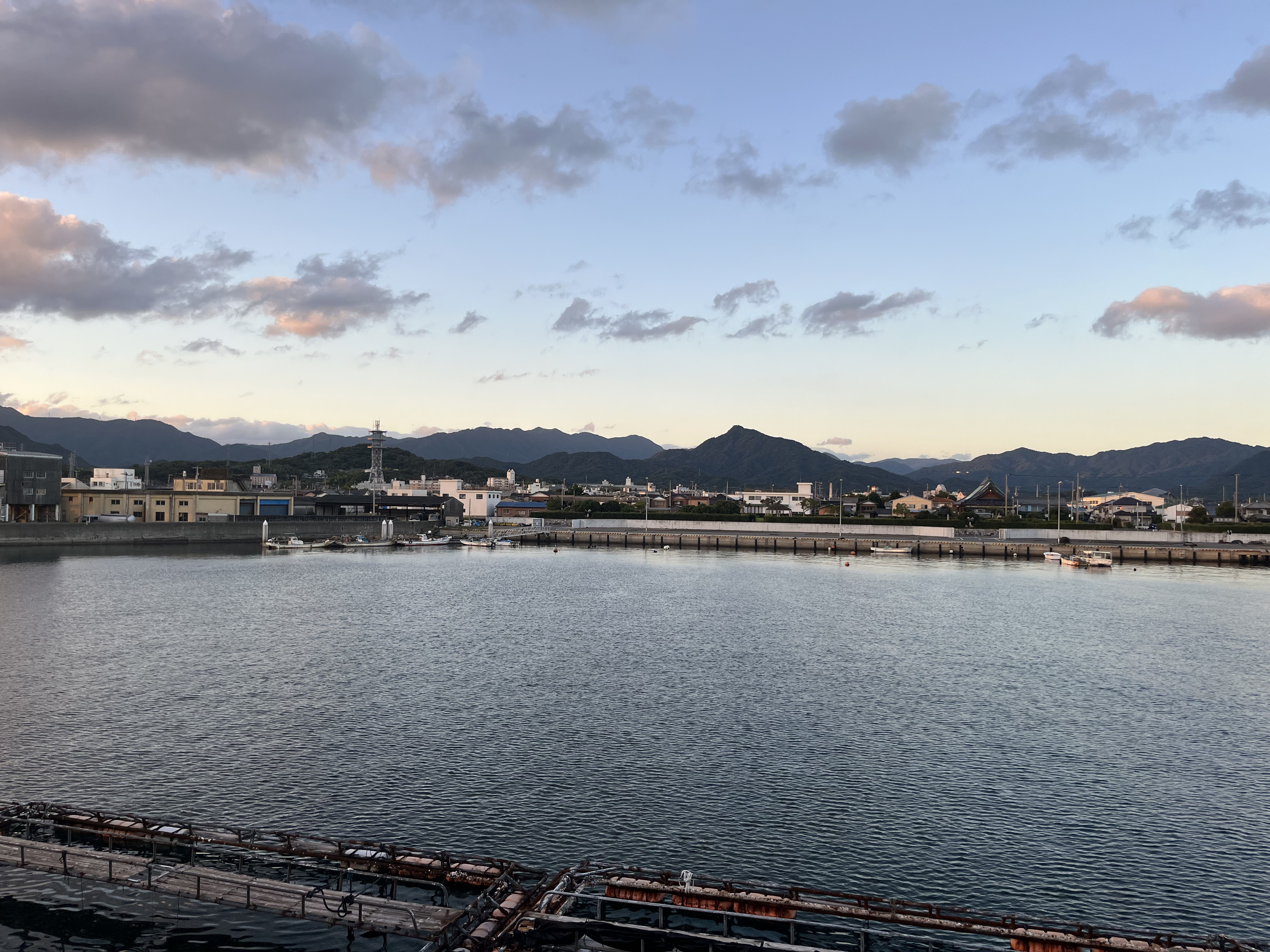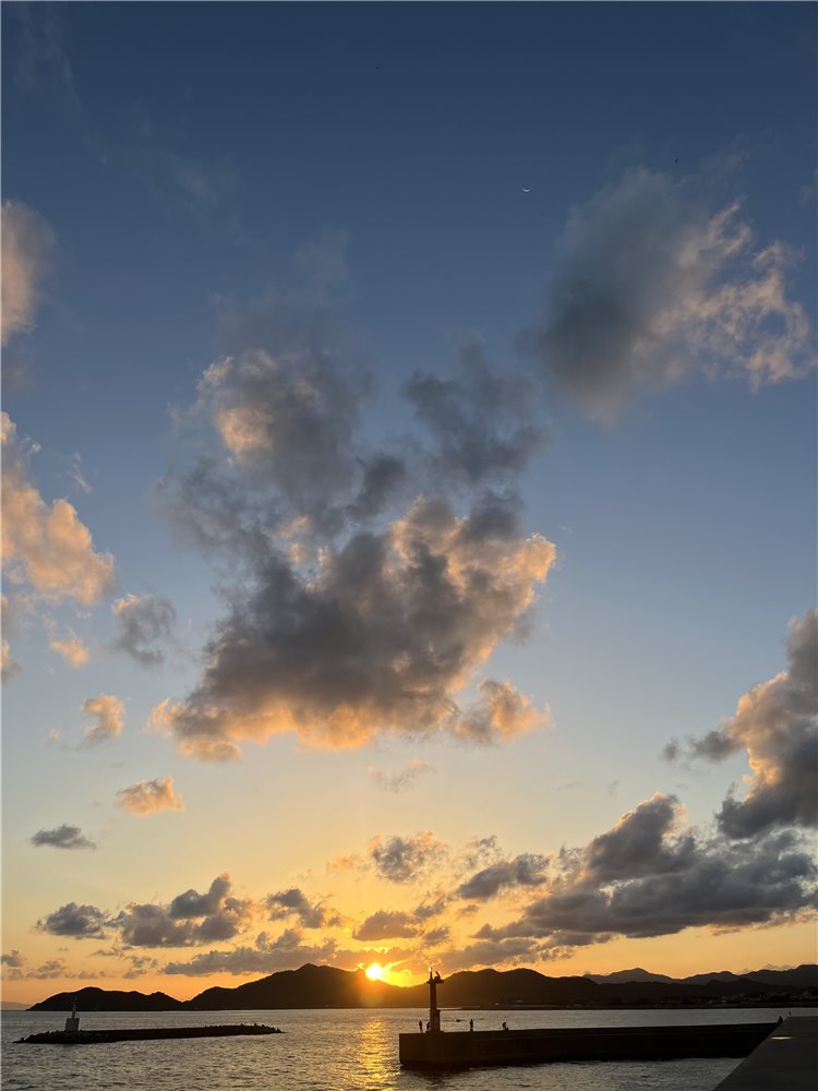 気温21℃、西の風が吹き流し角度45°で吹いています。空は晴れ、雲があちこちに浮かんでいます。細くなった下弦の月がその雲に見え隠れしています。輝く太陽が与治山の南のスロープの高い所に出て来ました。釣り客は赤灯台に5人、この波止は先ほどまで3人、港に1人です。阪九フェリーのいずみ号が朝の光を受けて白く輝いています。