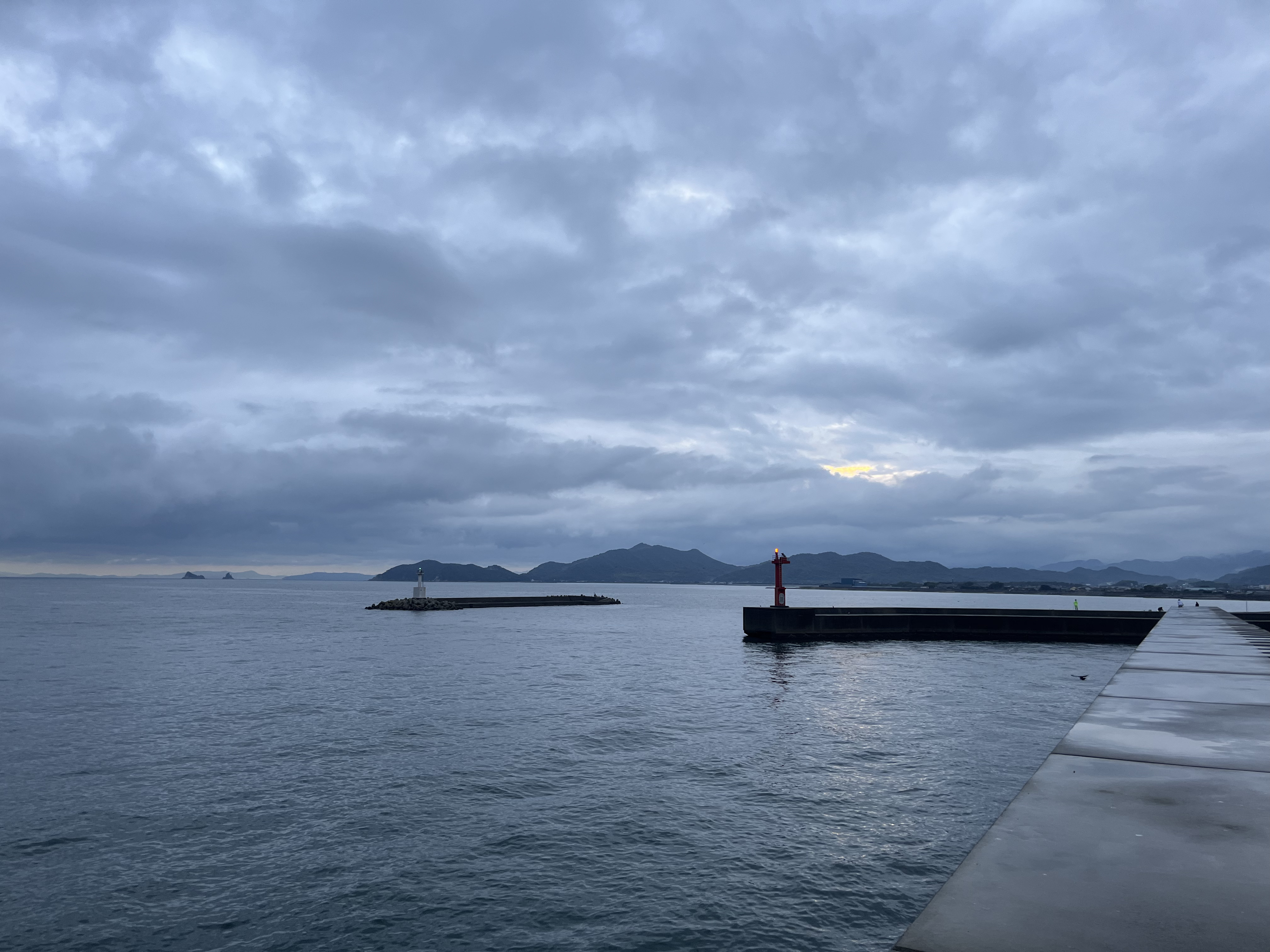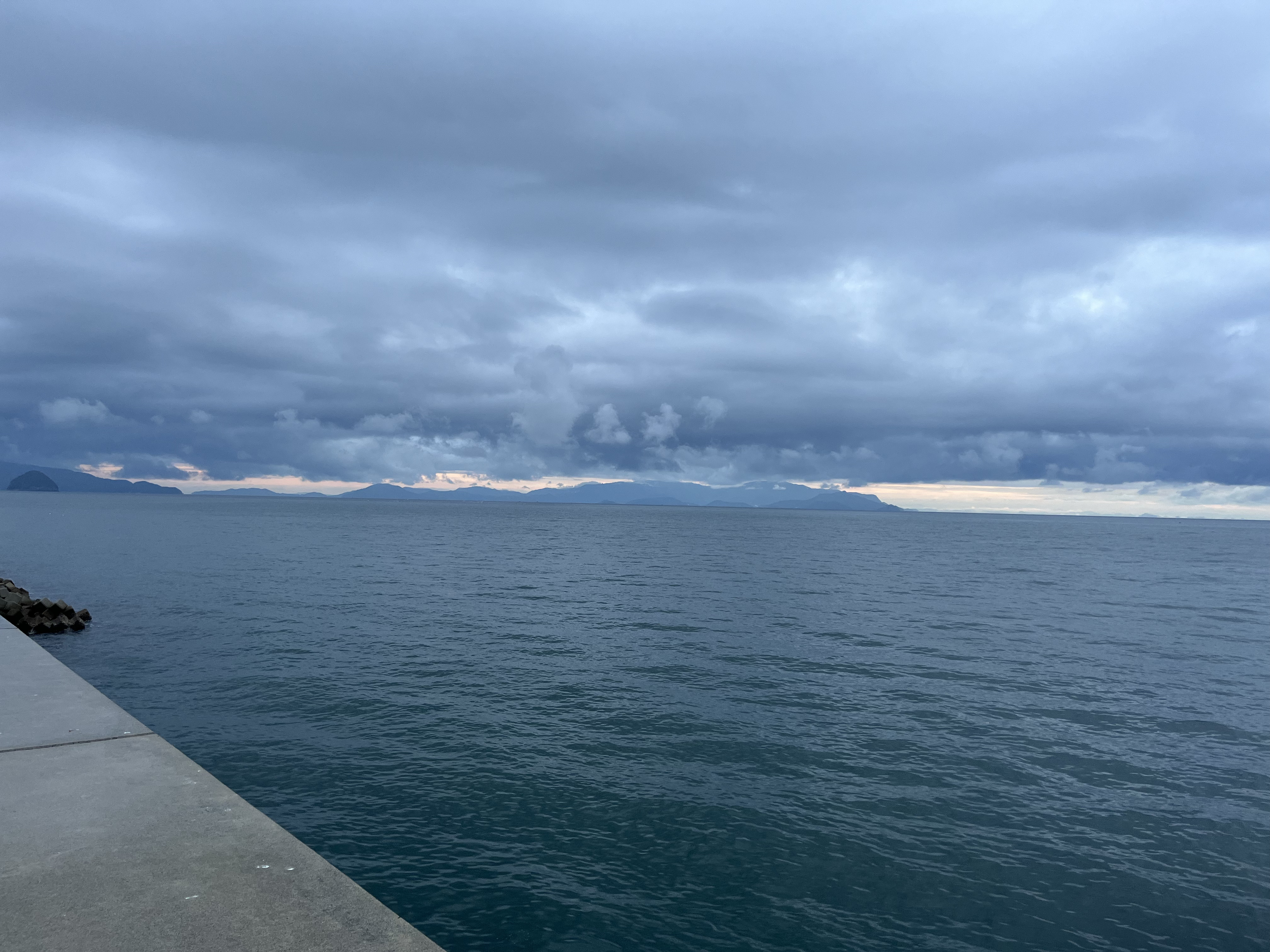 気温20℃、西の風が穏やかに吹いています。空は雨雲に覆われ、水平線も灰色です。阿讃の峰々、虎丸山も頂上は雲に隠れています。太陽も雲の向こうで姿を見せませんでした。与治山の右上空の雲が明るくなっています。波止の東端からオカリナの音色が聞こえて来ます。釣り客は赤灯台に4人、この波止に3人です。西の空が少し明るくなって来ました。