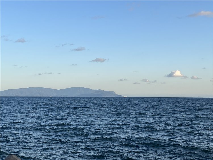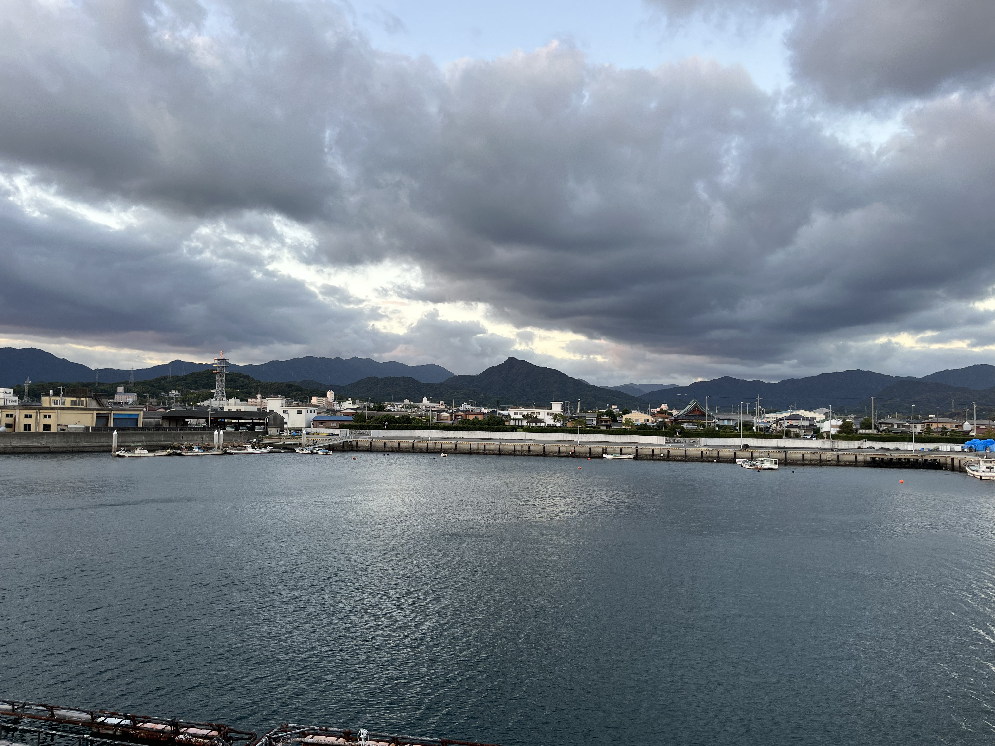 気温15℃、北東の風が引き流し角度70°くらいで吹いています。空は晴れ、雲があちこちに浮かんでいます。与治山と伊座山の大きな半円形の谷間に見える幾筋もの雲が紅く輝き、谷間の一番低い所から太陽が姿を見せました。釣り客は赤灯台に1人、この波止に2人、港に1人です。小豆島の南の航路を大型貨物船Verde Heraldo号(船長299m、幅50m、FindShipから)が西に向かっていました。