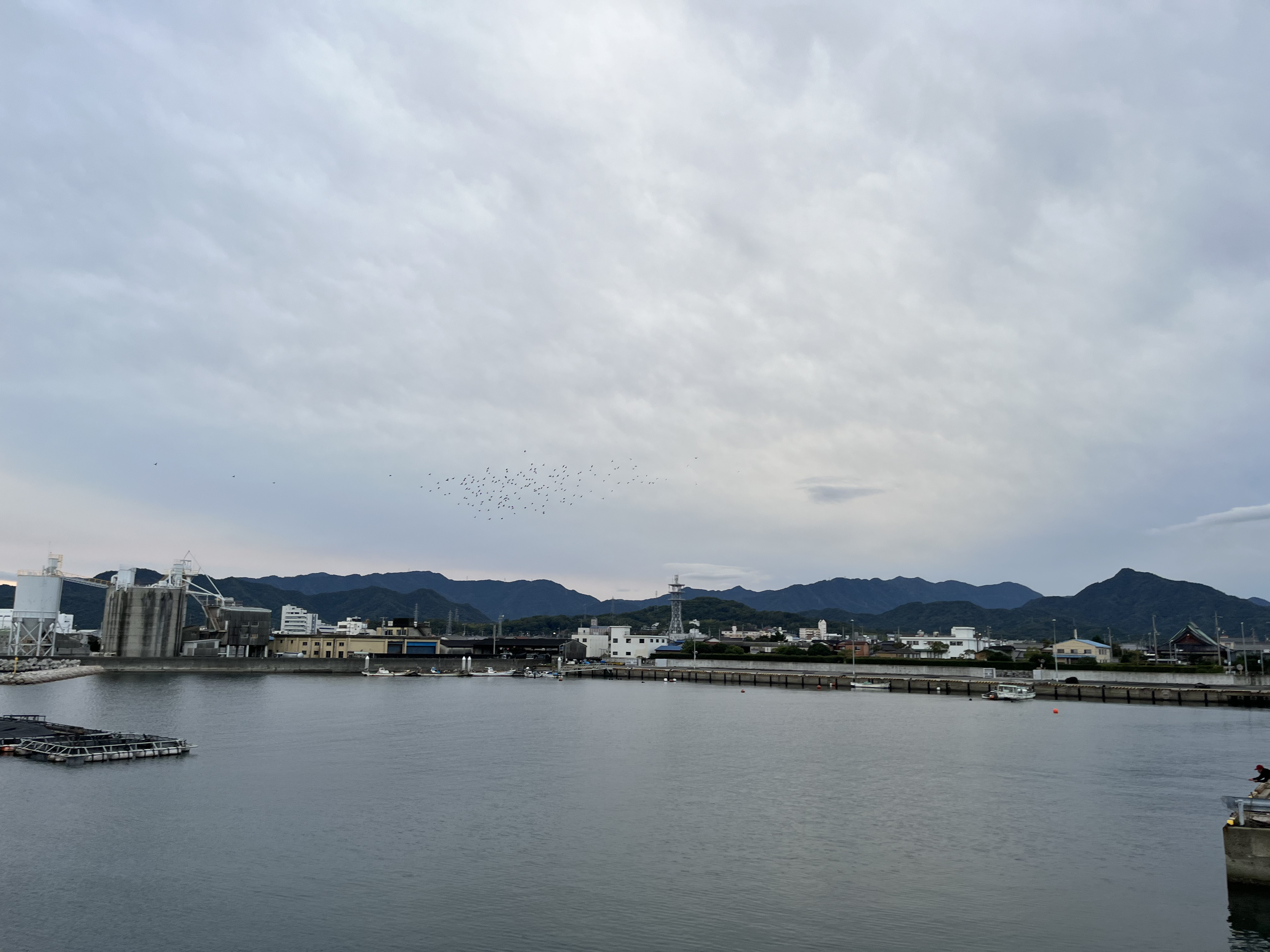 気温13℃、昨日の雨は上がり、朝早くから釣り客で賑わっています。東波止に2人、赤灯台に6人、この波止に3人、港に1人、大物狙いのルアー釣り客が多そうです。空全体に薄く雲が残り、しばらく前に真っ赤の朝焼けだった東の空にも太陽は姿を見せませんでした。鳩の群れが一斉に飛び立ち、港の上空を旋回してくれました。