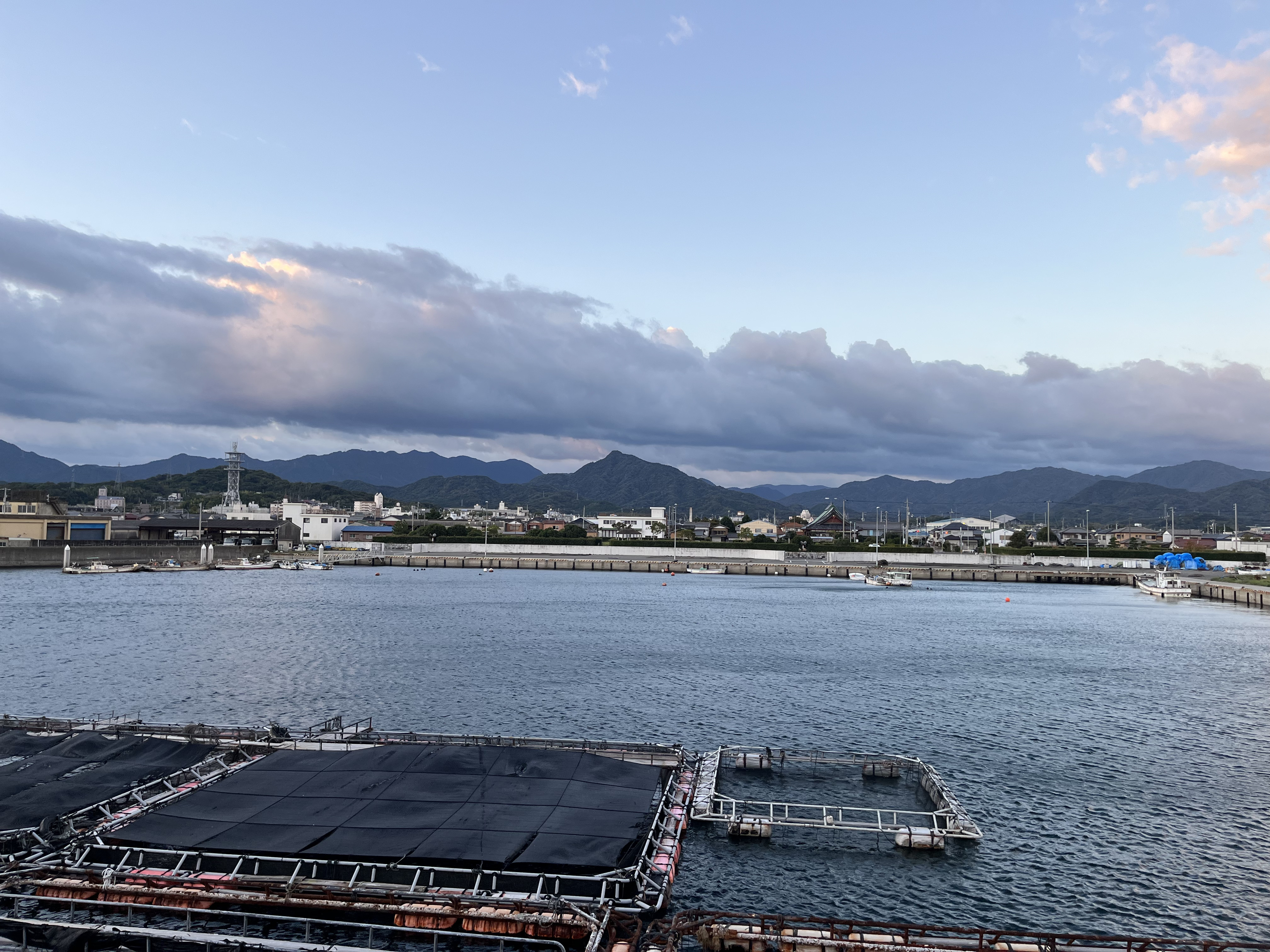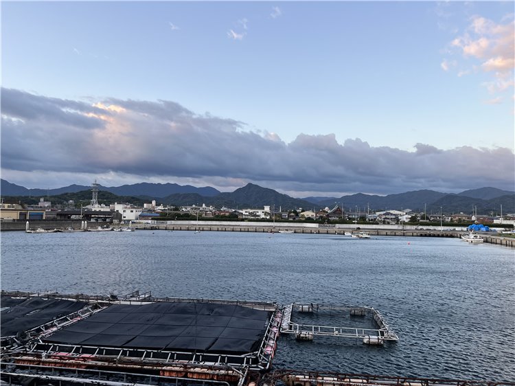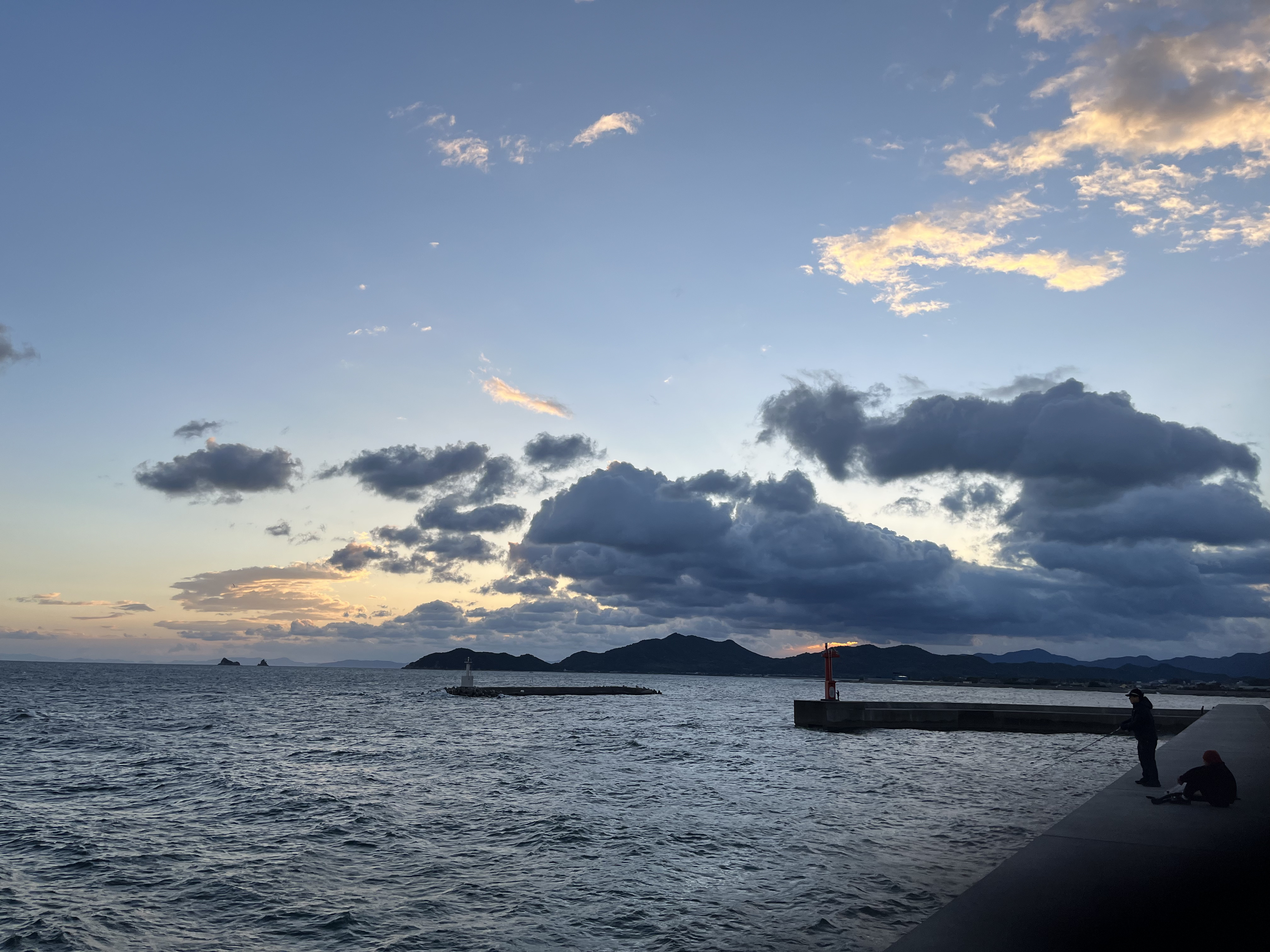 気温13℃、北西の風が強き、東の伊座山塊の上に集まる雲は黒く暗く、西の空の雲が紅く染まっています。海には大きな白波が立ち、スマホでは体感温度6℃の表示です。太陽は雲の僅かの切れ目を赤く染め、日矢を放っています。釣り客は東波止に2人、赤灯台に1人、この波止に4~5人、テトラに1~2人、港に2人です。養殖フグの出荷準備も始まっているようです。