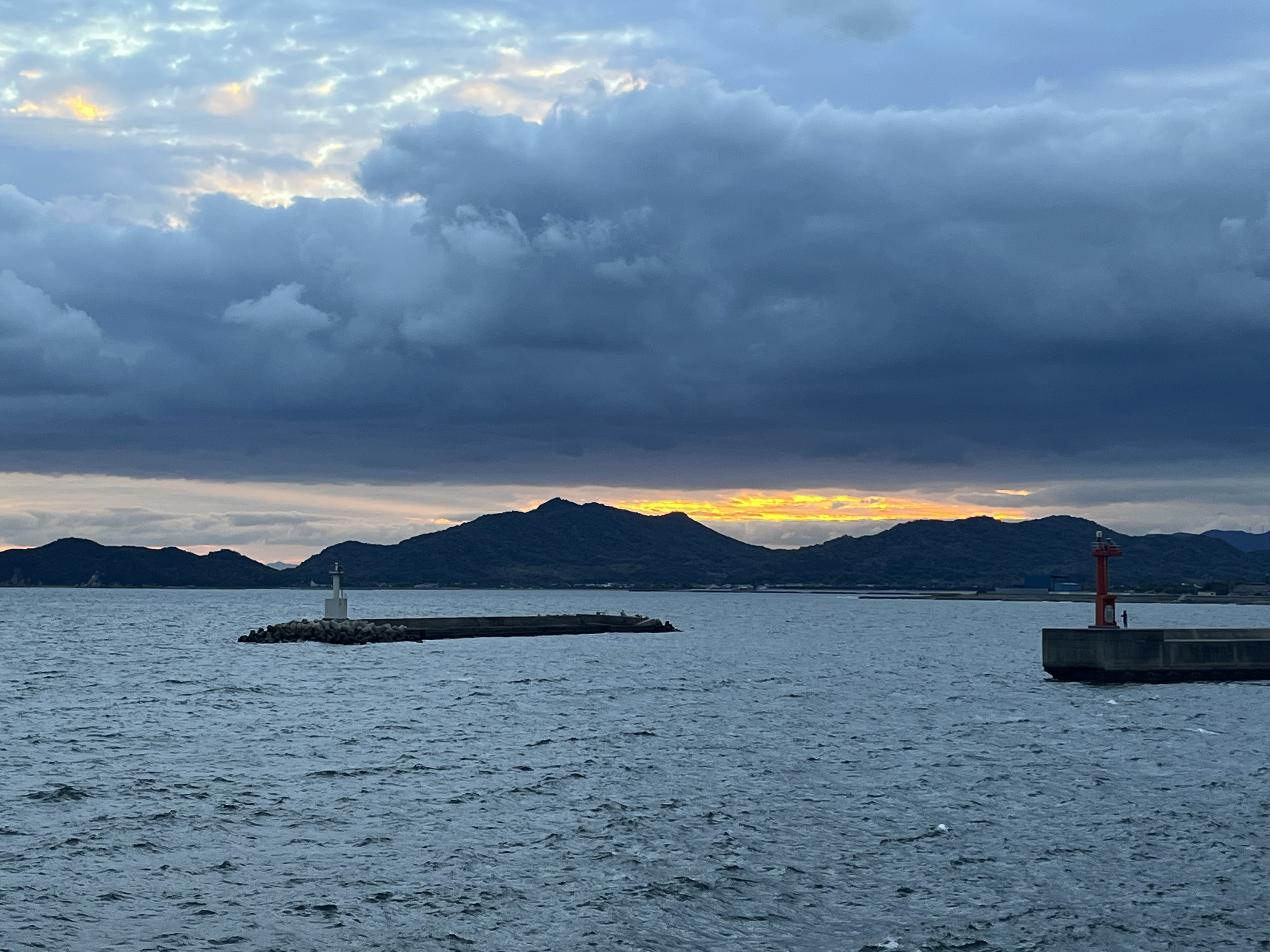 気温13℃、北の風、吹き流し角度80°、尾っぽが垂れることもある強さです。小豆島の南の航路を真っ白の巨大タンカー越州丸(LNG船、全長288m、幅49m、13.8万t)が西に向かっています。空には雲があって、時々に二十日の月(更待月)が顔を見せています。東の空も稜線の向こうの雲が紅く染まり、結局太陽は姿を見せませんでした。釣り客は東波止と赤灯台にそれぞれ2人です。