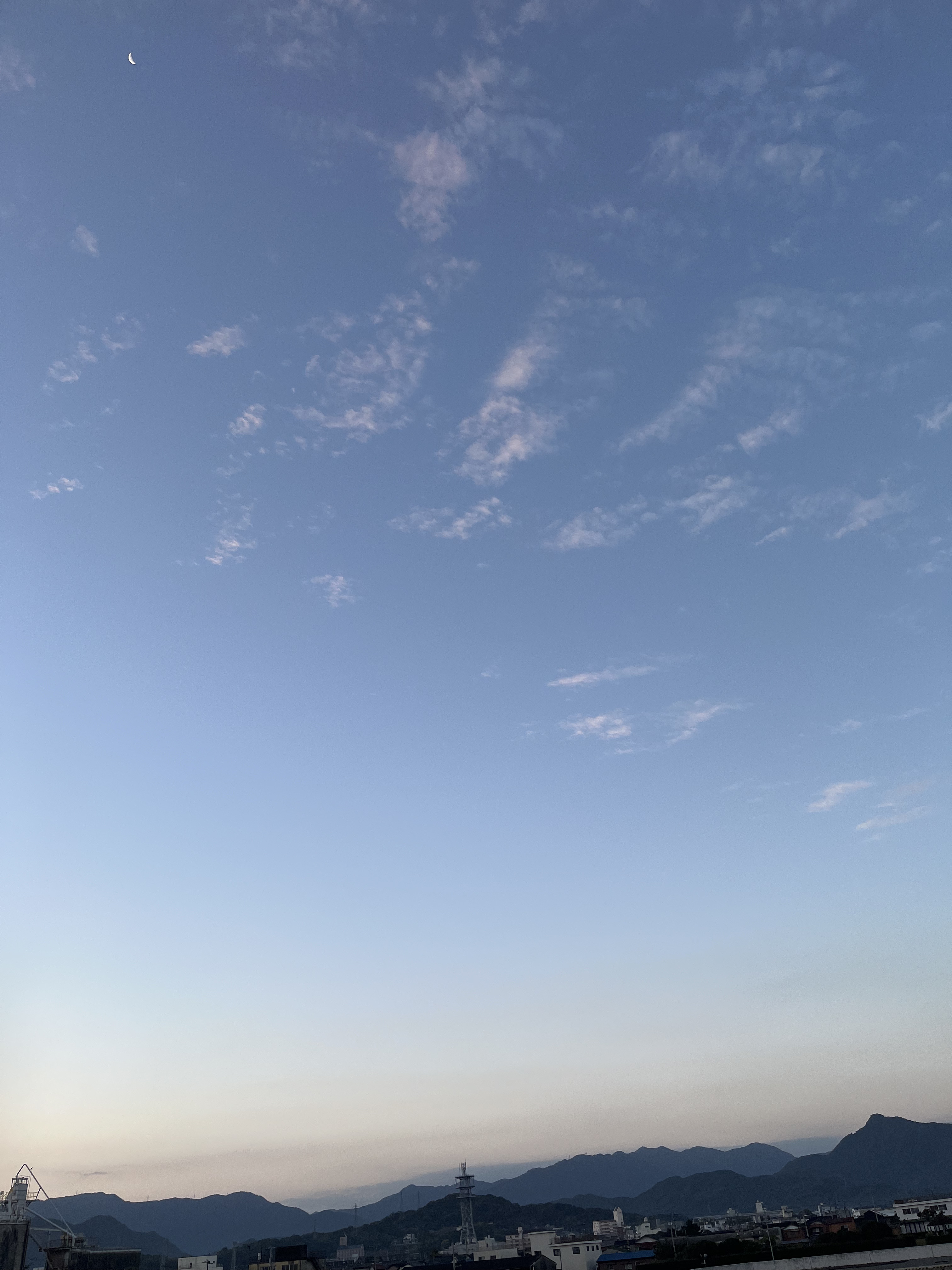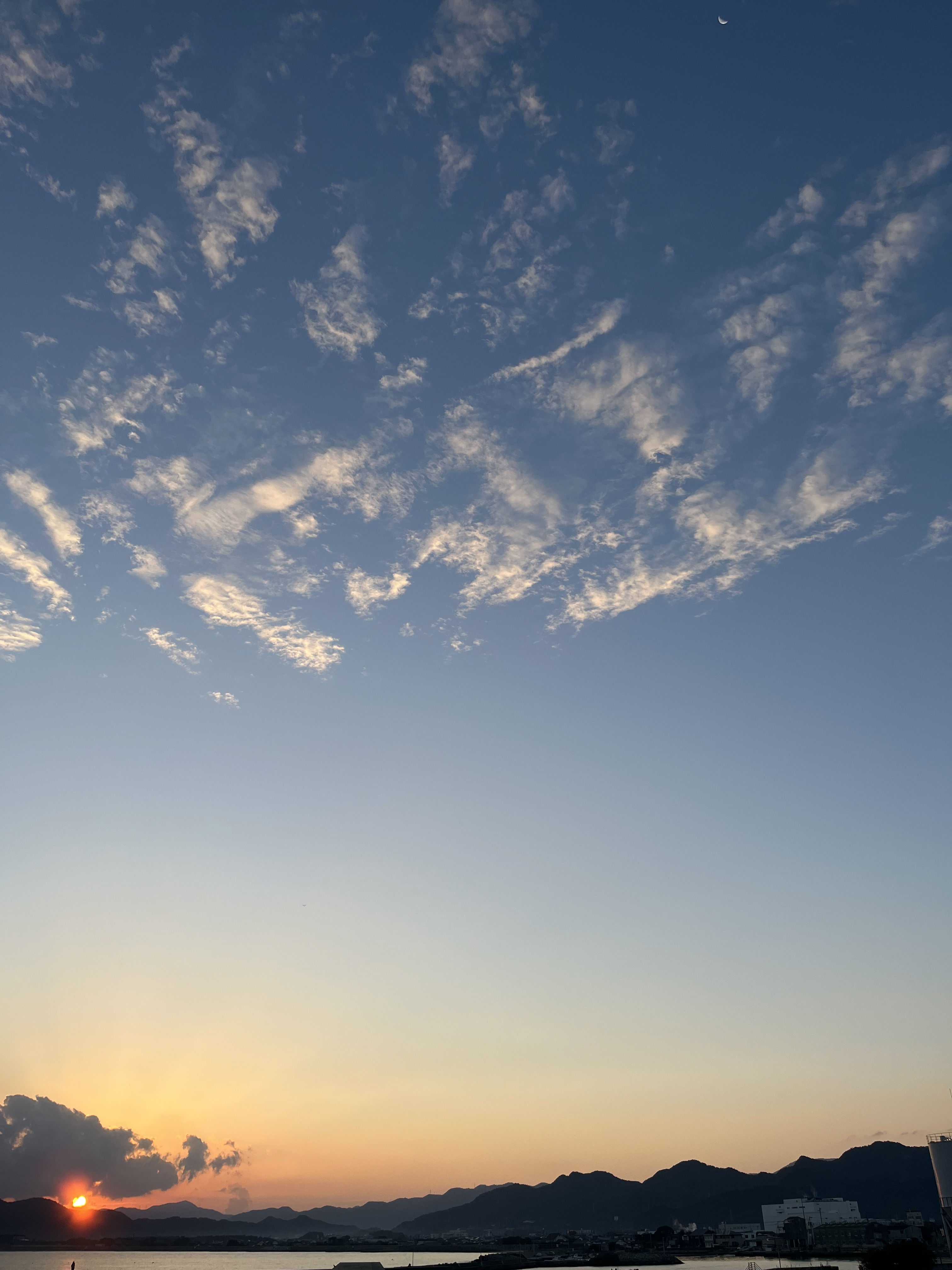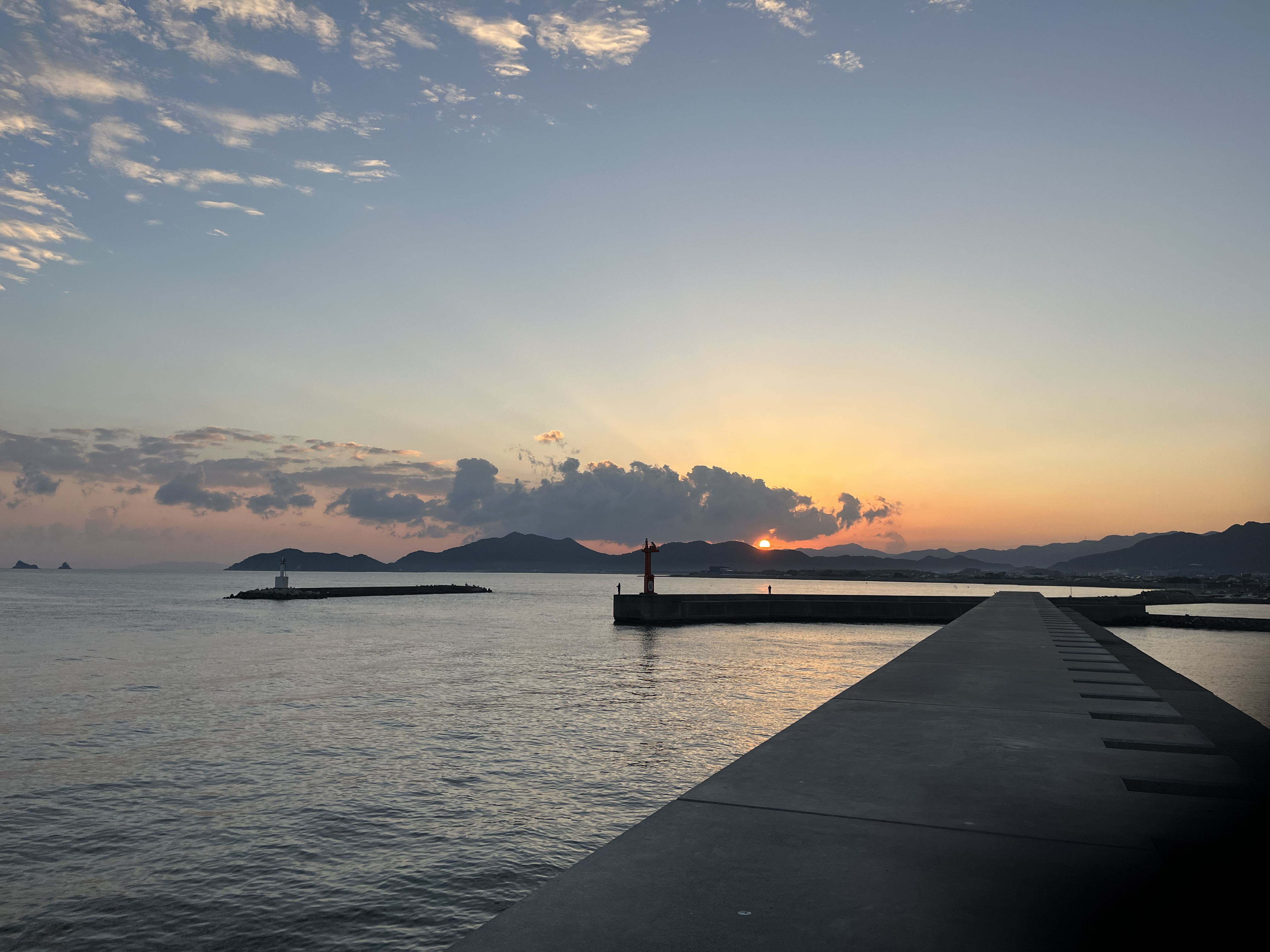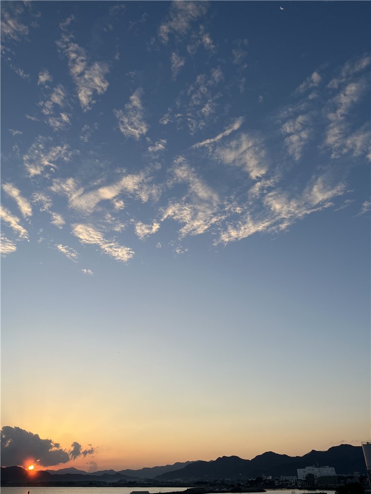 気温13℃、快晴です。西の風が緩く吹いています。海上ではシラサギの群れが遊び、天空には少しスリムになった二十二日の下弦の月が残っています。太陽が伊座山塊の向こうの紅く染まった雲間に姿を見せました。釣り客は赤灯台に2人です。太陽と月、虎丸山と月の2枚のツーショットが撮れました。