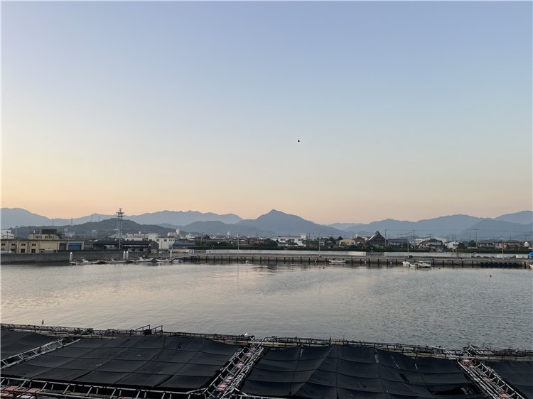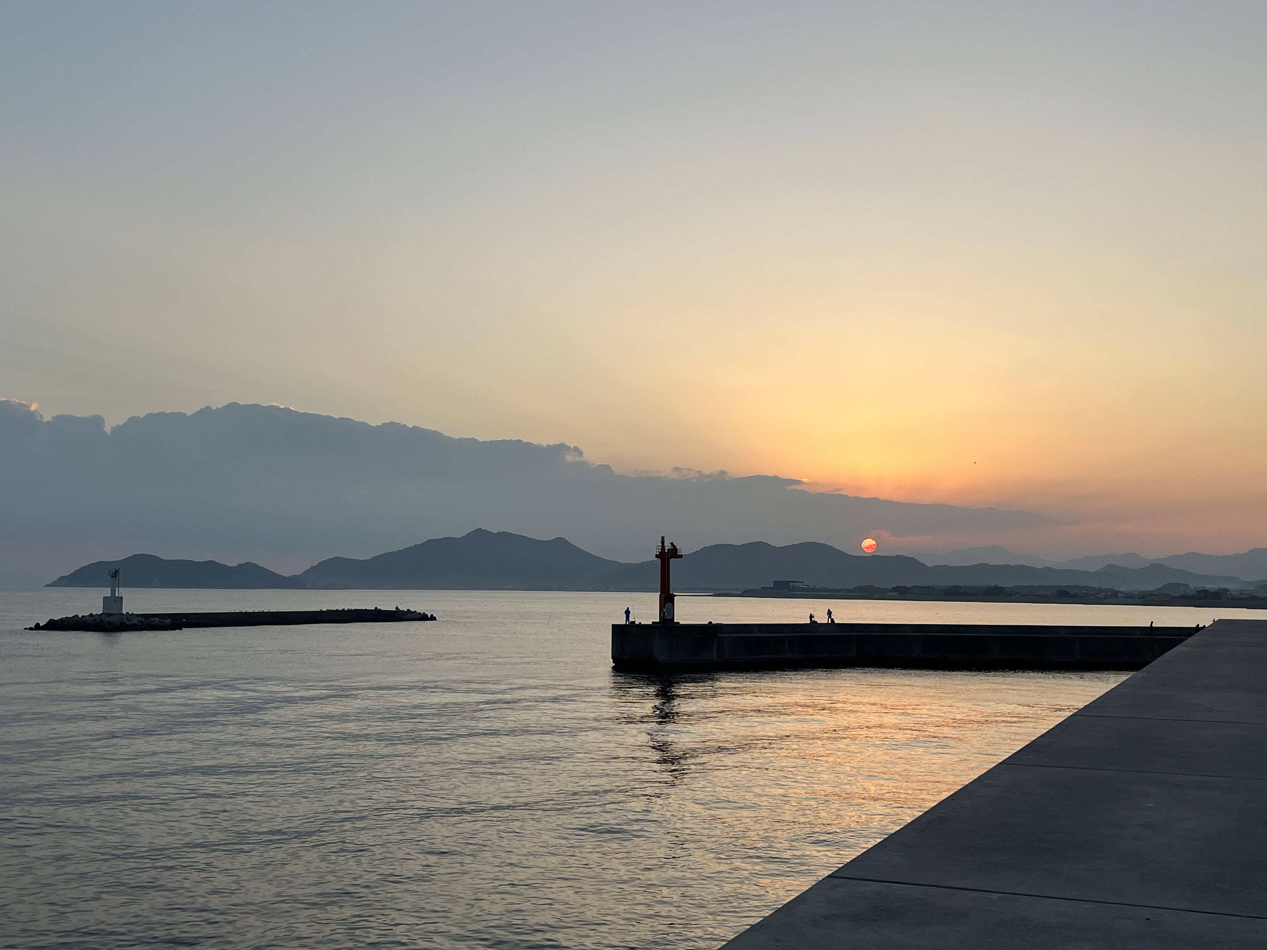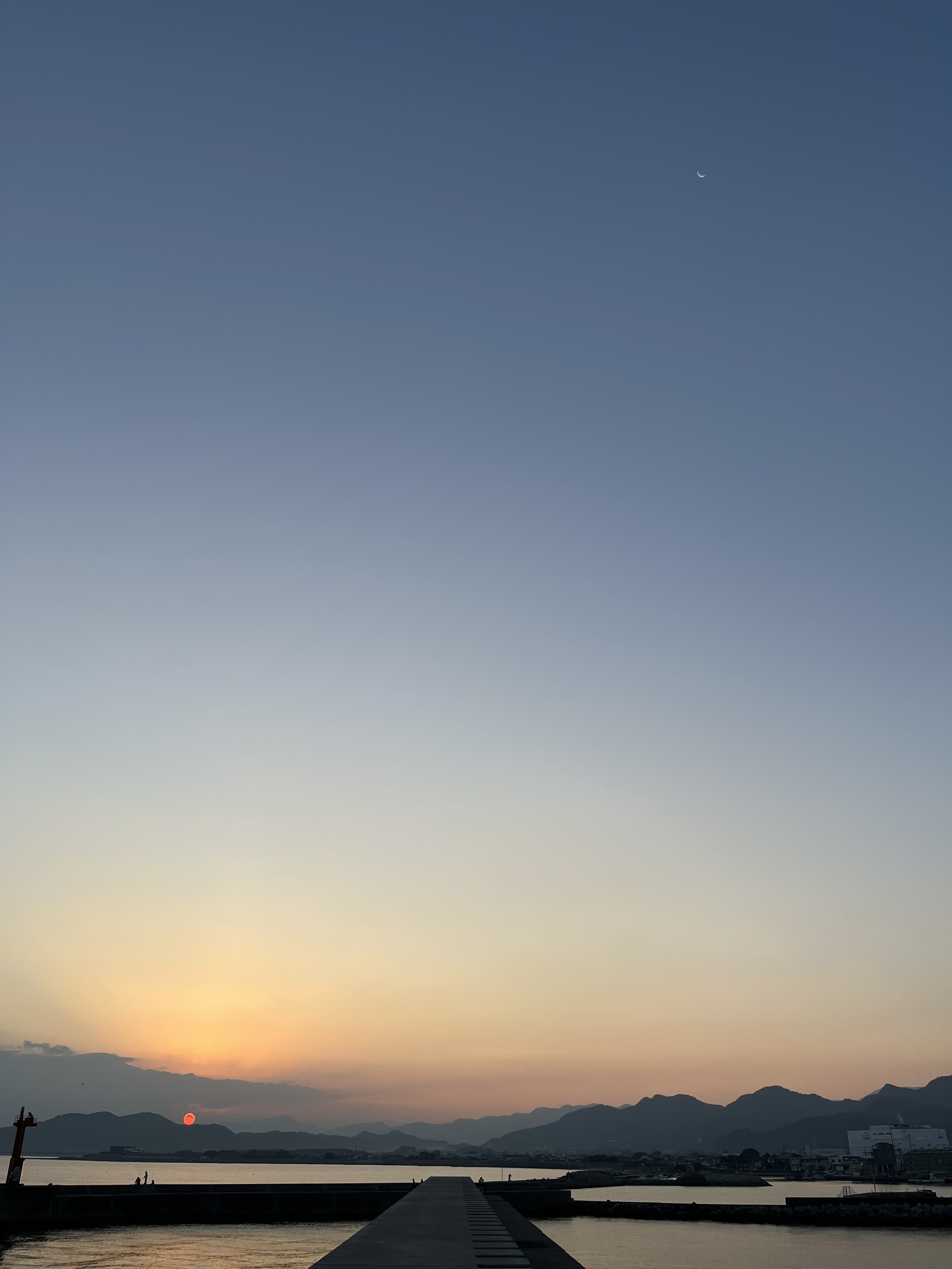 気温12℃、快晴、西寄りの風が軽く吹き、東の空に薄く雲が集まっています。天空やや東寄りに二十三夜の月が昇り、追いかけるように、紅い太陽が伊座山塊の南の峰から姿を見せました。百羽を超える鳩の群れが一斉に飛び立ち祝福です。釣り客は東波止に1人、赤灯台に7人、この波止に1人、テトラに2人です。