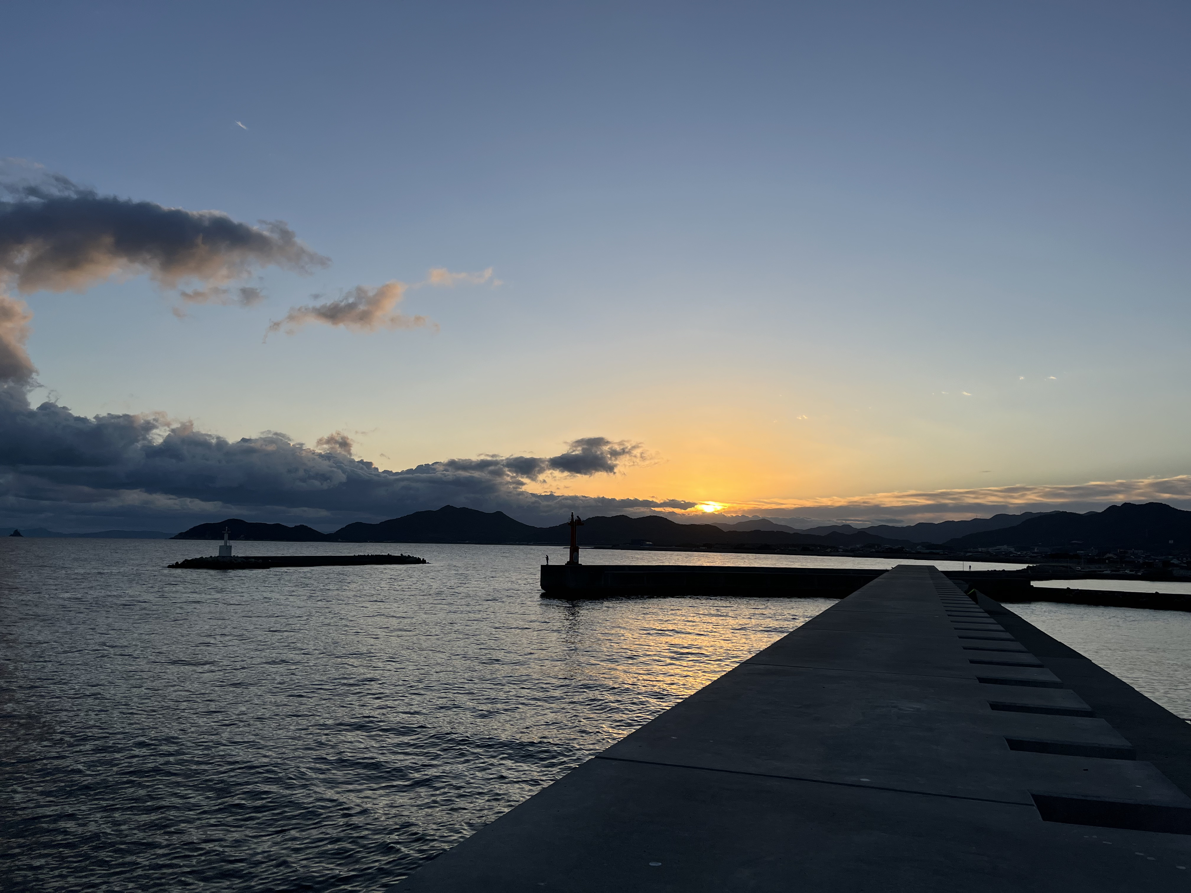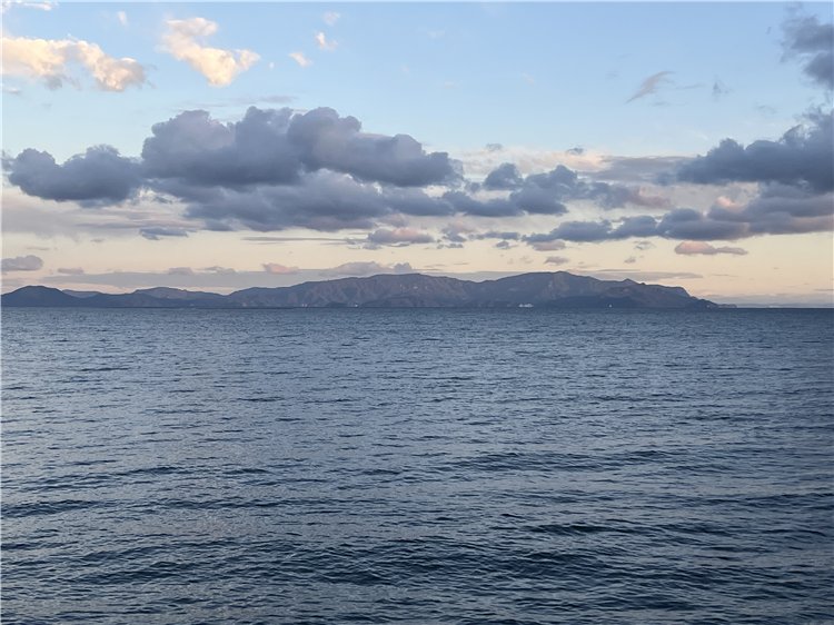 気温8℃、晴れ、風はほとんどなく、冷え込んでいます。東の空には雲があって、太陽の姿は見えません。釣り客は東波止に2人、赤灯台に1人、テトラに2人です。暫くして雲が明るく輝いて太陽が出て来ました。虎丸山や里山も少し紅葉が進んでいるようです。小豆島の南の航路を飛鳥Ⅲ(全長230m、船幅34m)が西に向かっています。