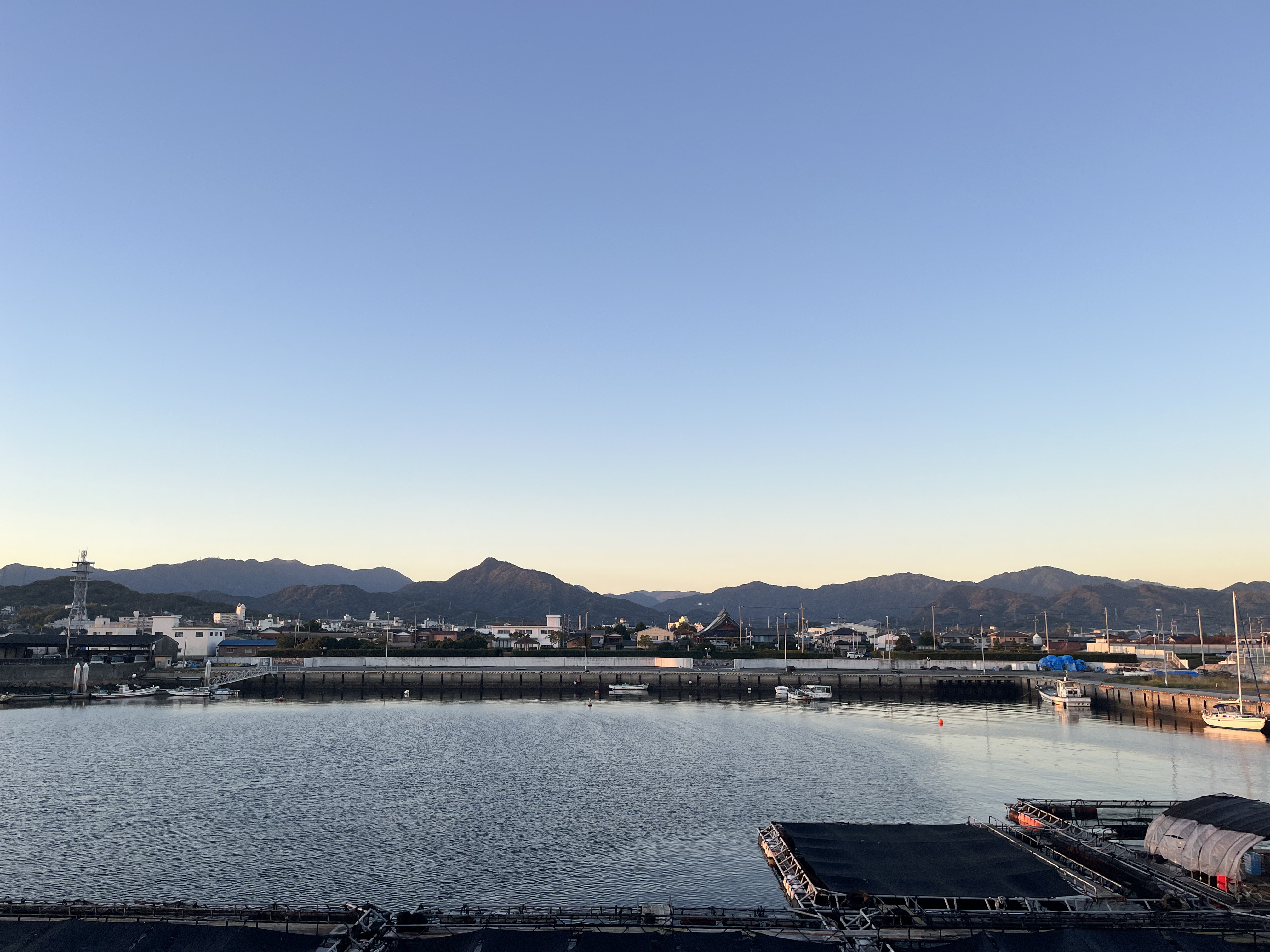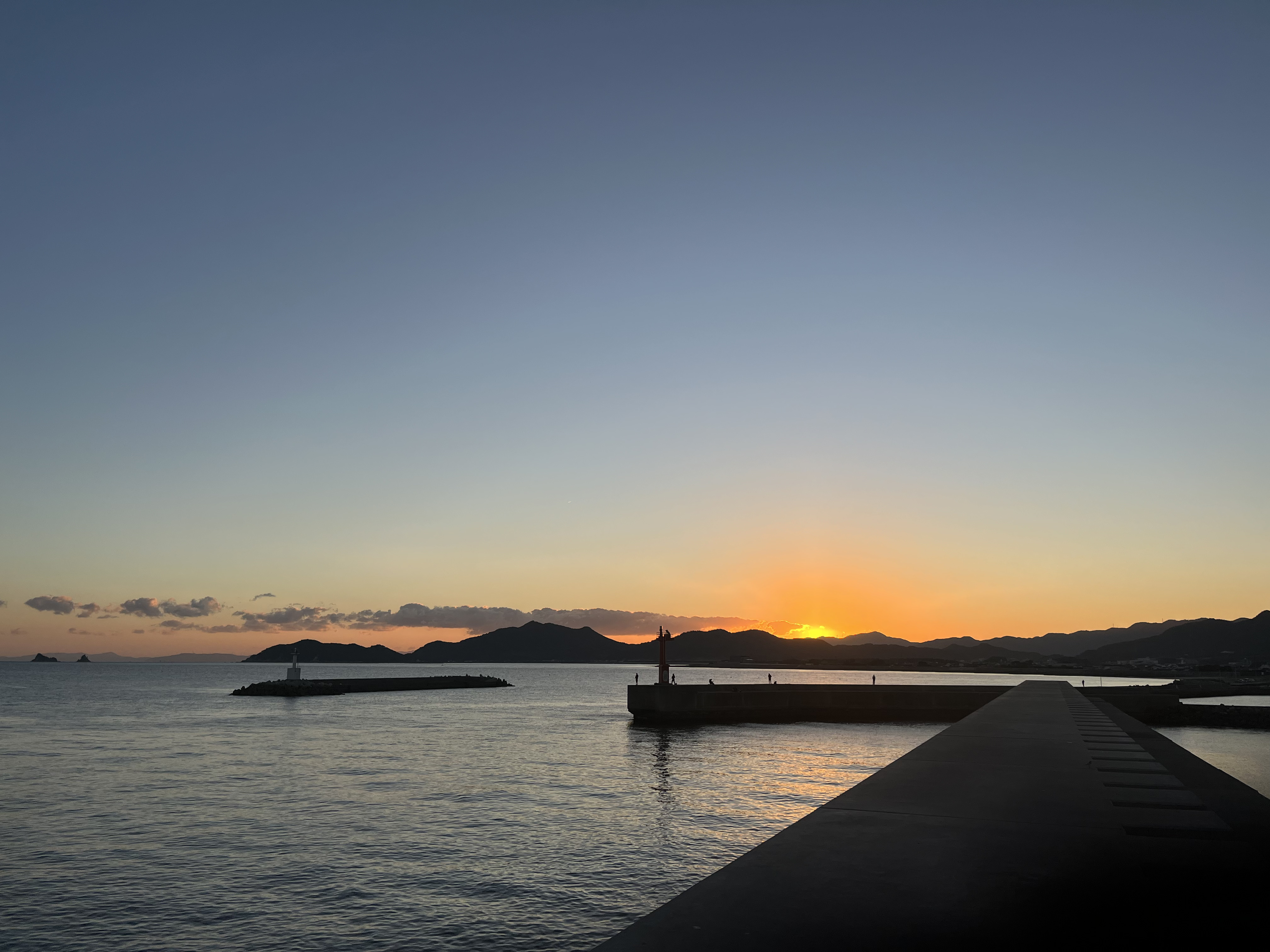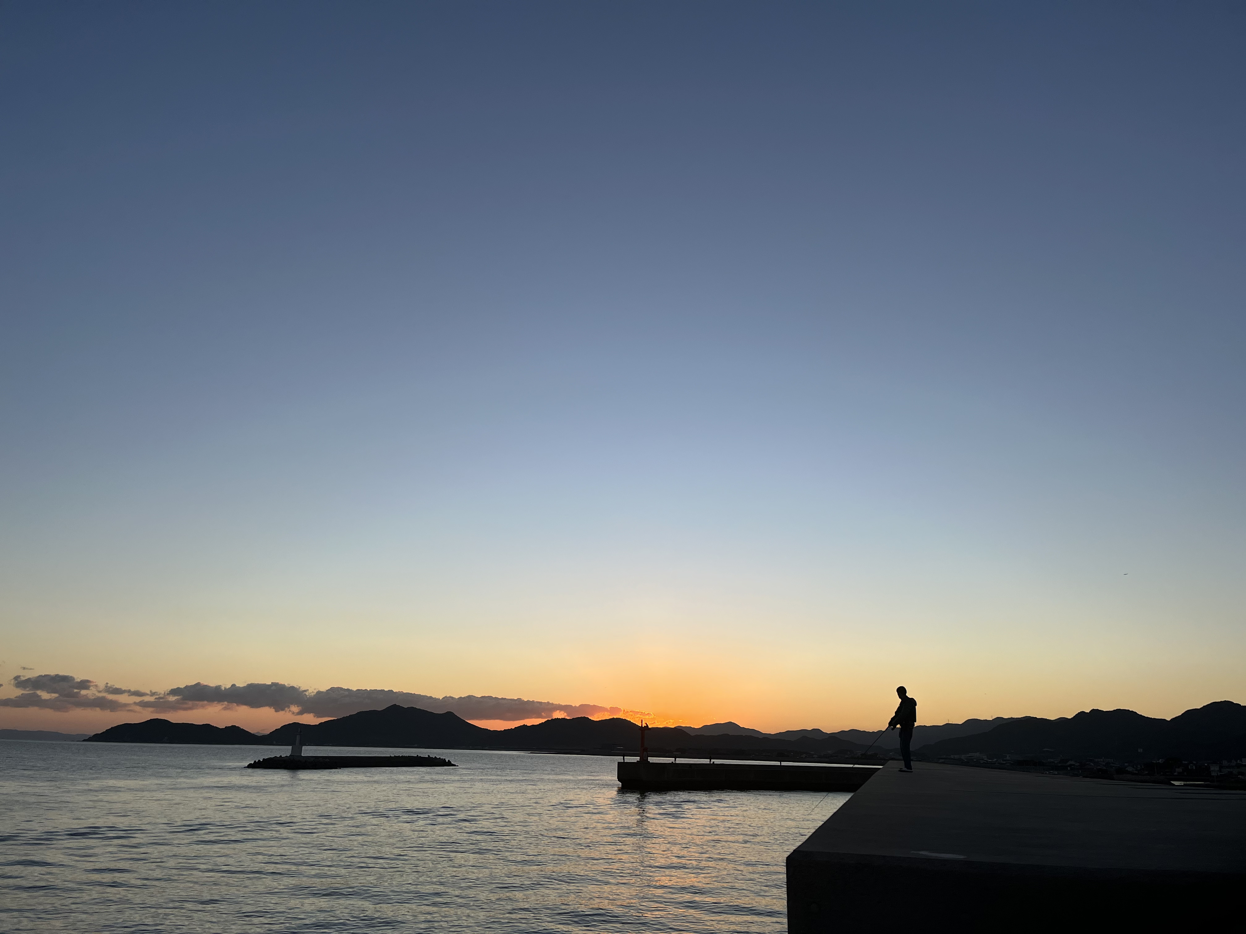 気温8℃、西の風が吹いて少し冷え込んでいます。空は快晴、雲は東の山上だけです。飛行機が未明の橙色の空に短いジェット雲を残しながら東に向かっています。阿讃山脈の上空にも2機が関空に向かっています。釣り客は東波止2人、赤灯台5人、この波止1人、テトラに5人です。港にはヨットが1艘停泊しています。6時49分27秒、太陽が大麻山山塊の山の端に出て来ました。