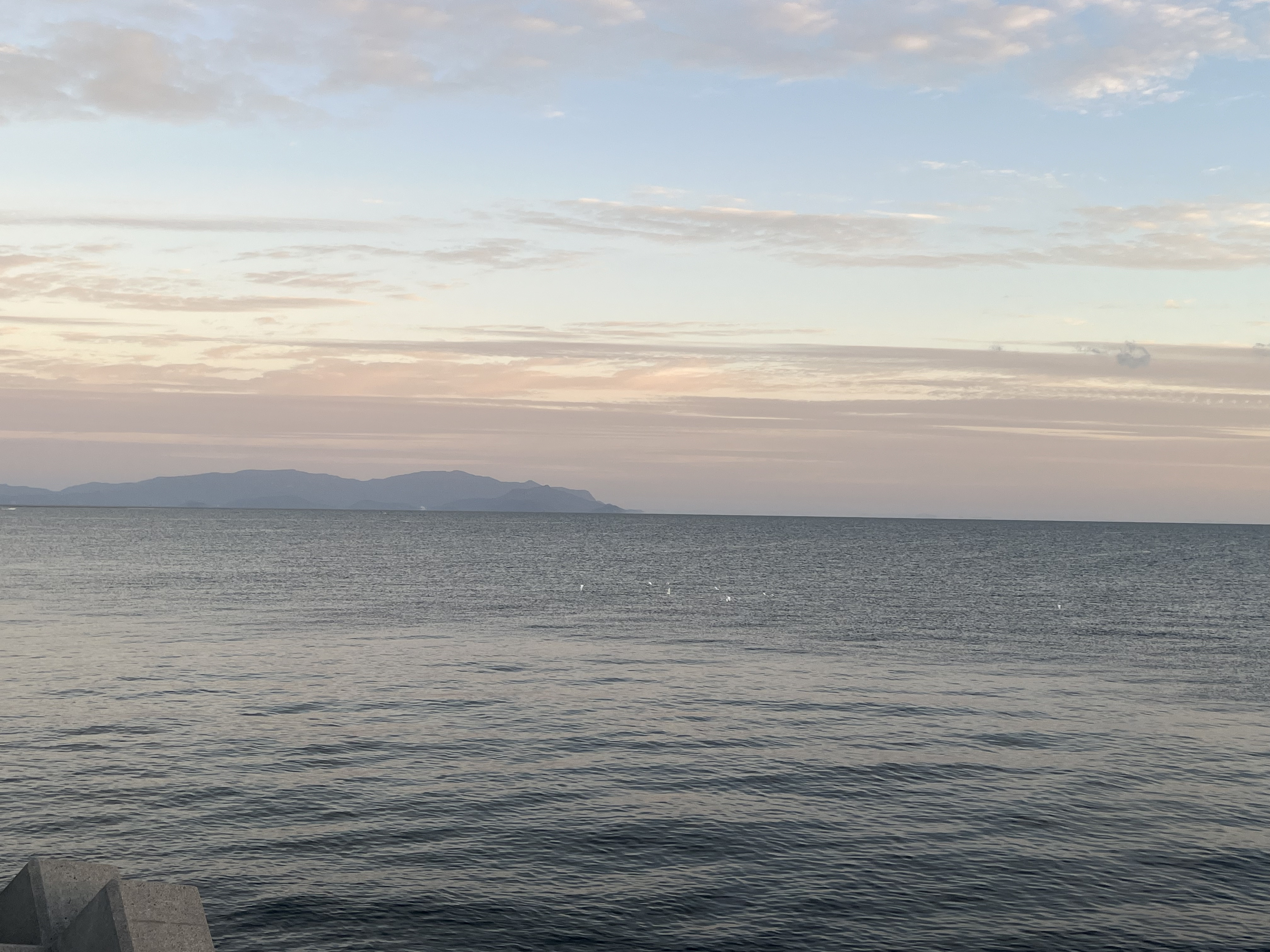 気温11℃、晴れ、少し寒い朝です。北西の風が吹き流し角度40°くらいで心地よく吹いています。夜明け前の海上をシラサギの数羽の群れが楽しそうに西に向かっています。天空の寝待月の残月が雲に見え隠れしています。伊座山山塊の向こうの雲が紅く染まり、次第に、雲の縁が金色に輝き、太陽が姿を見せました。釣り客は見えません。
