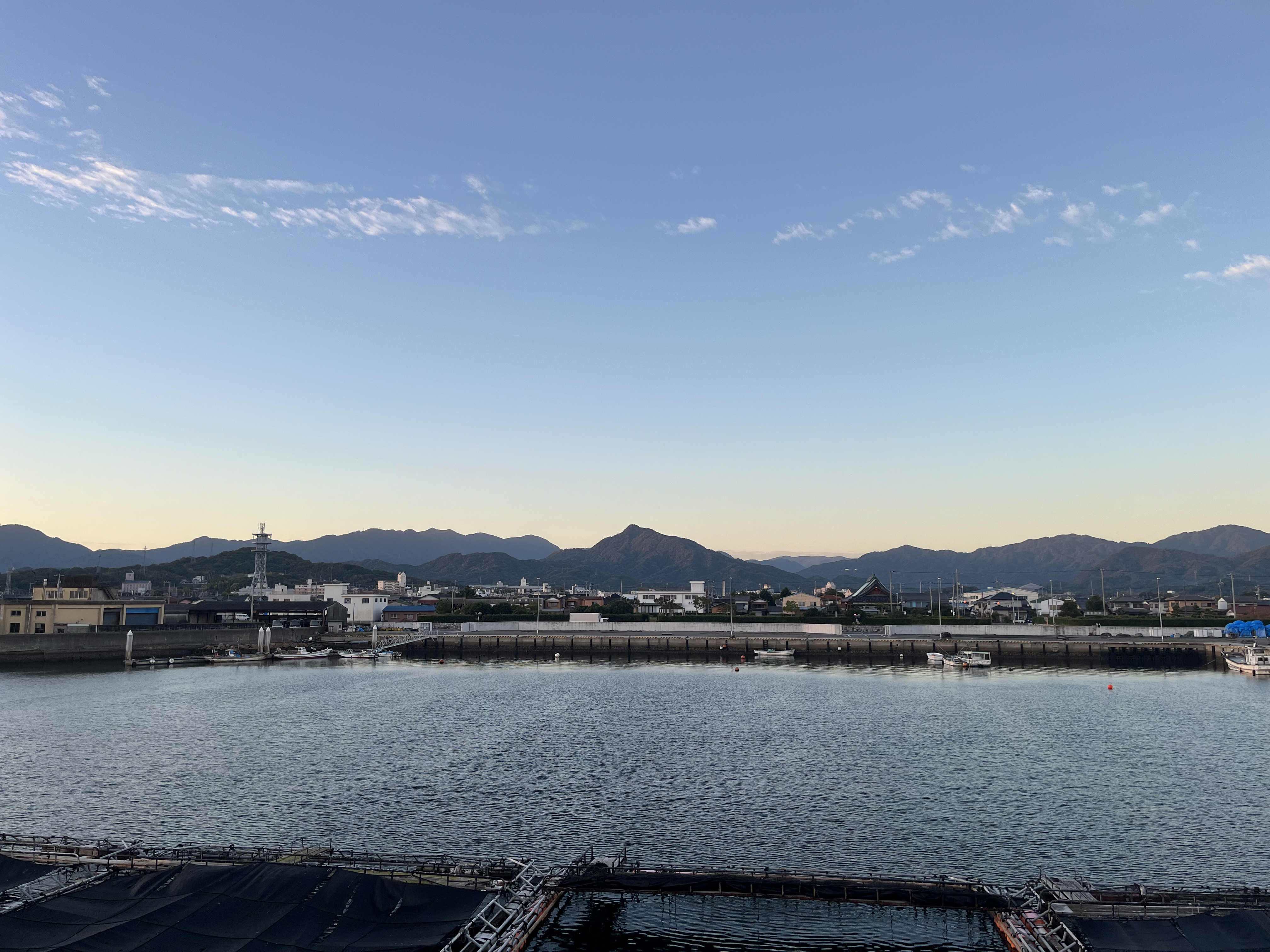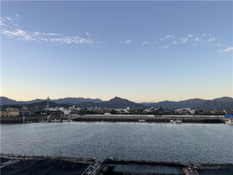 気温11℃、晴れ、少し寒い朝です。北西の風が吹き流し角度40°くらいで心地よく吹いています。夜明け前の海上をシラサギの数羽の群れが楽しそうに西に向かっています。天空の寝待月の残月が雲に見え隠れしています。伊座山山塊の向こうの雲が紅く染まり、次第に、雲の縁が金色に輝き、太陽が姿を見せました。釣り客は見えません。