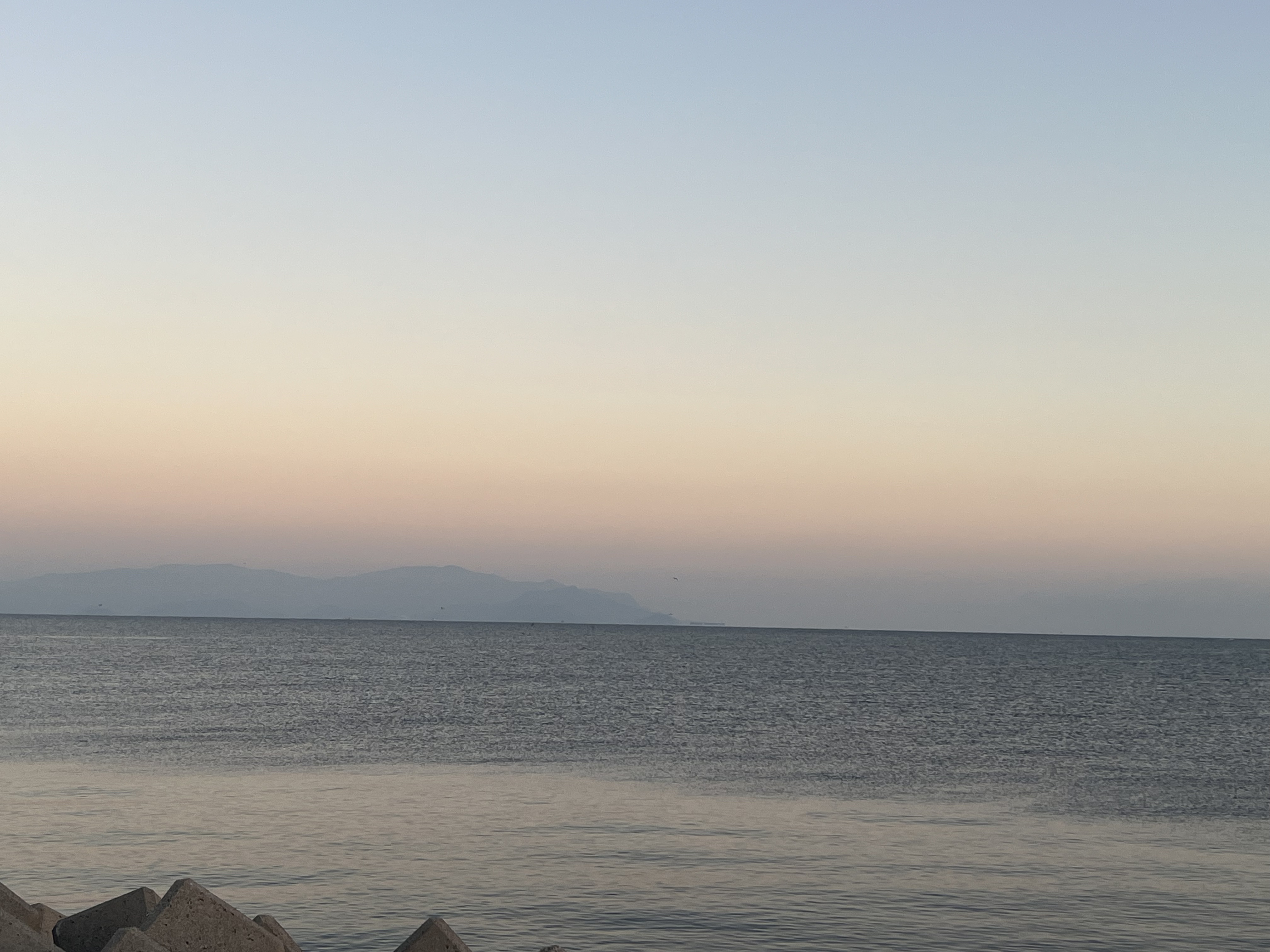 気温8℃、快晴、ぐっと冷え込んで手がかじかむ寒さです。北西の風が穏やかに吹いています。長い貨物船(SG DAWN全長299m 船幅50m,20.9万t)が小豆島航路の大角の鼻灯台に東から差し掛かっています。日曜日の所為か釣り客は多く、東波止に2人、赤灯台に7人、この波止に3人、テトラに4~5人です。この波止でも60㎝くらいのサゴシが釣れた様です。オレンジ色の空に太陽が姿を見せました。
