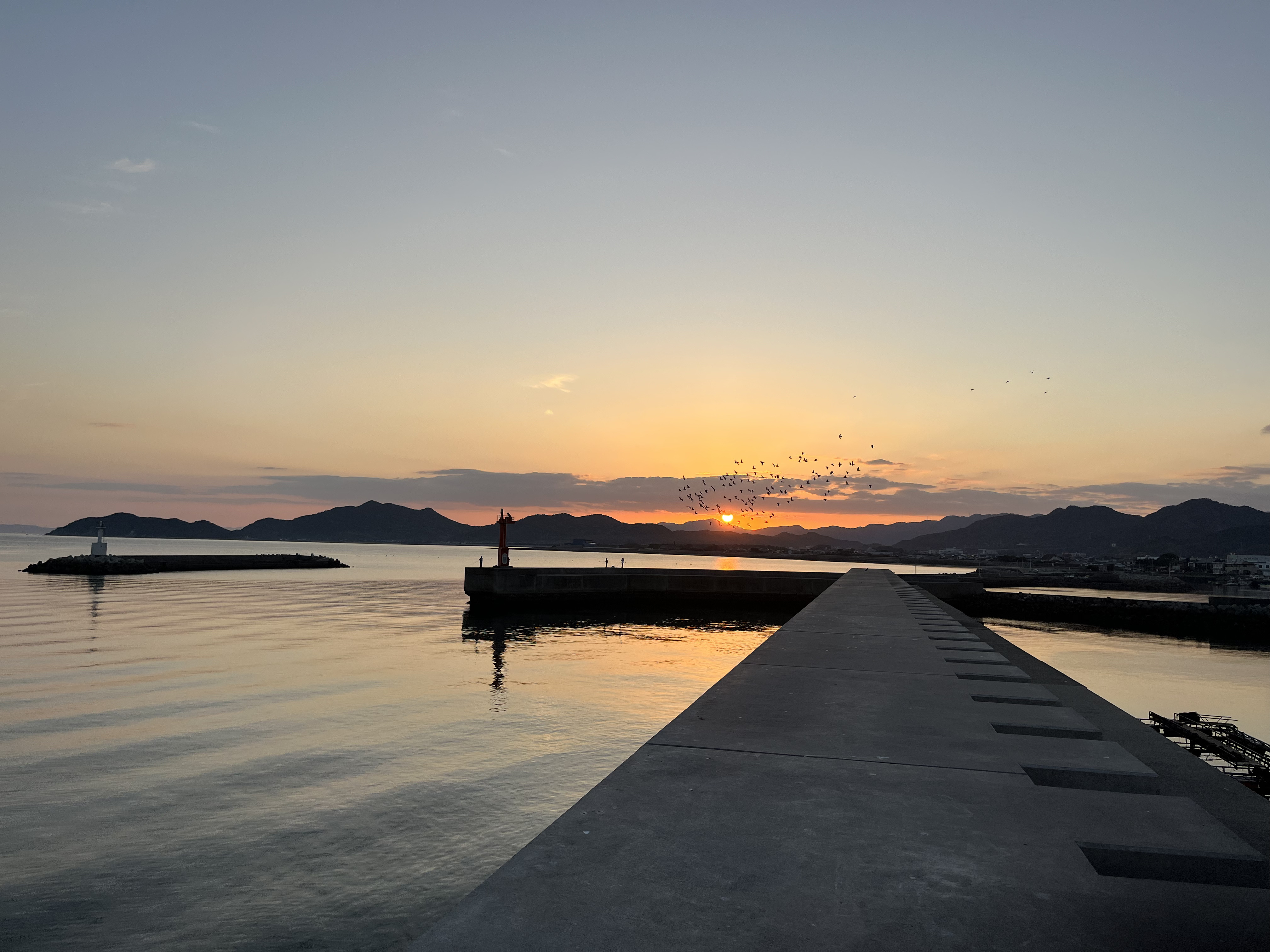気温11℃、晴れ、風はほとんどなく海も穏やかです。西の空には細くなった十七日の月が残っています。東の空は茜色に染まって、阿讃山脈から飛行機が関空か伊丹空港へ向かって高度を下げています。釣り客はこの波止に2人、テトラに2人です。太陽が大麻山の南の斜面に姿を見せました。そのあと直ぐに鳩が一斉に飛び立ちました。