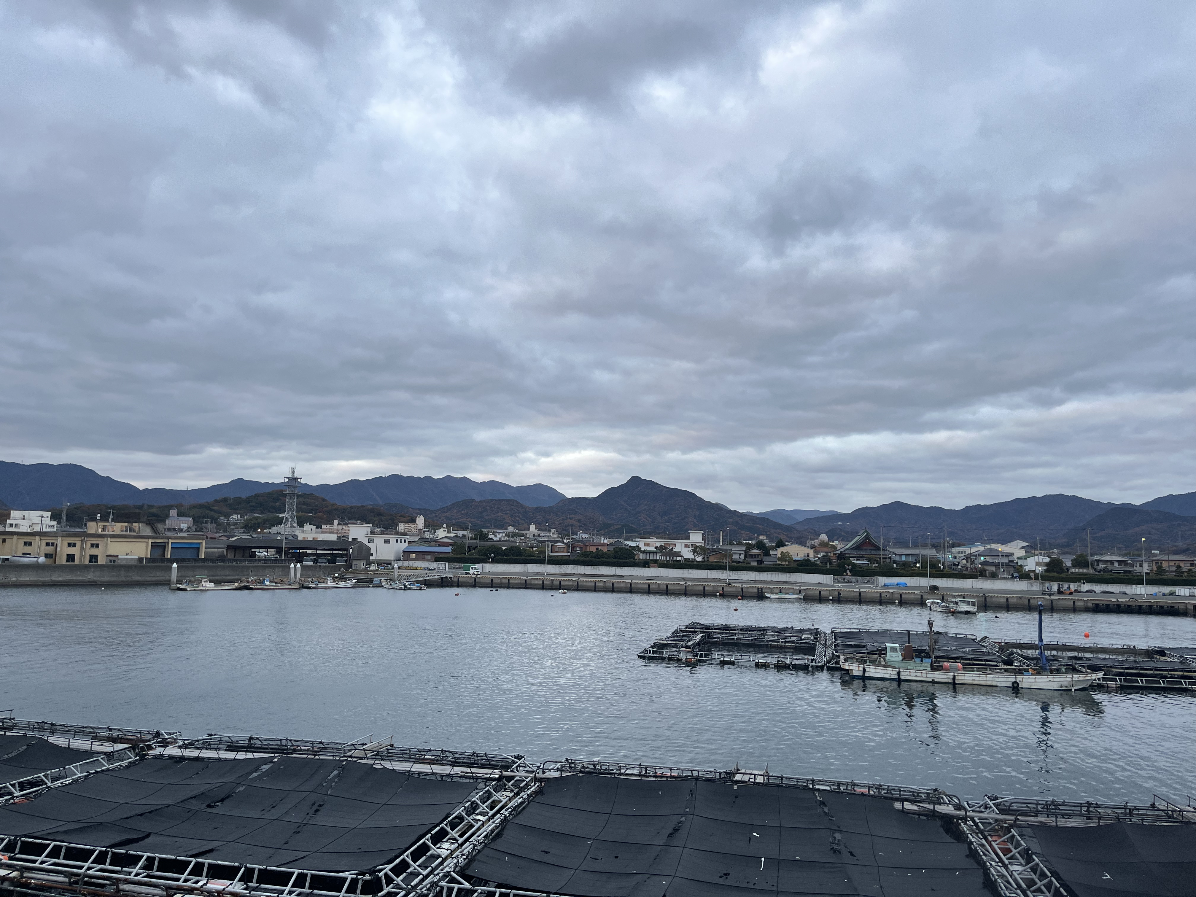 気温6℃、港の入り口でオカリナの音が聞こえて来ました。風に流されてきたのでしょうか。北風が少しきつく吹いています。曇り空。大麻山にも雲が懸って、その雲がほんのり紅く染まっています。釣り客は赤灯台に1人、テトラに2人です。太陽が雲の合間に姿を見せました。茶色い羽根の鳥の群れがすぐ沖合で小魚狙いか、着水を繰り返しています。