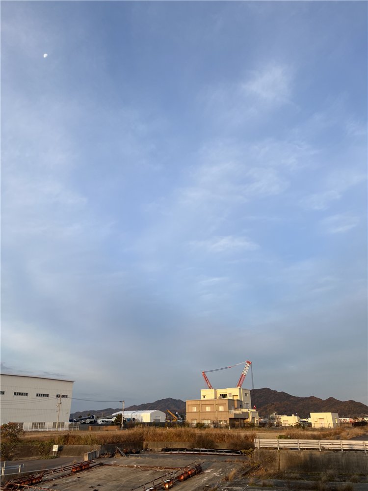 気温8℃、北風が強く吹いて、海は荒れ模様、岸壁に波飛沫が立っています。空全体にやや厚い雲が懸り、東の空の、雲と大麻山の合間に朝焼けが広がっています。太陽が雲に見え隠れしながら出て来ました。釣り客は赤灯台に1人です。港ではフグの生簀の作業が始まっています。