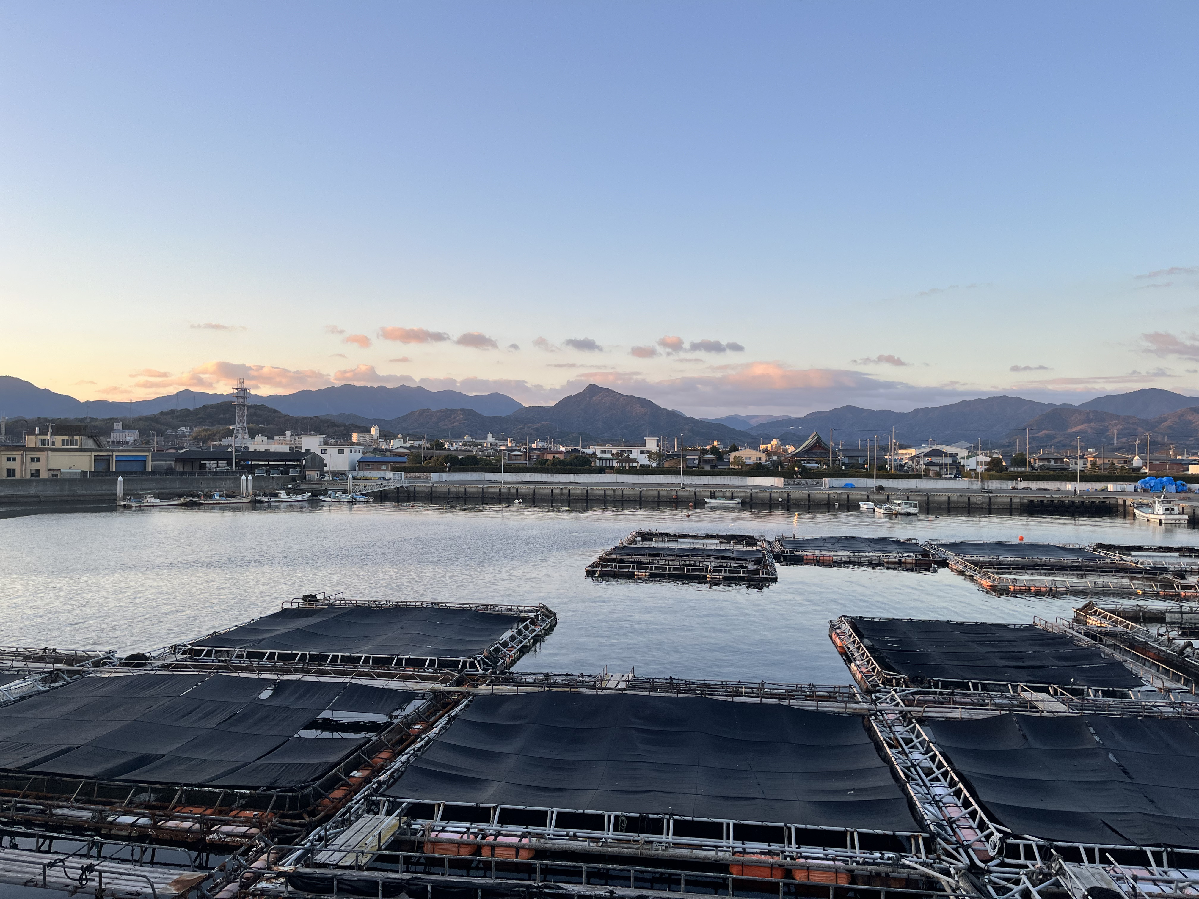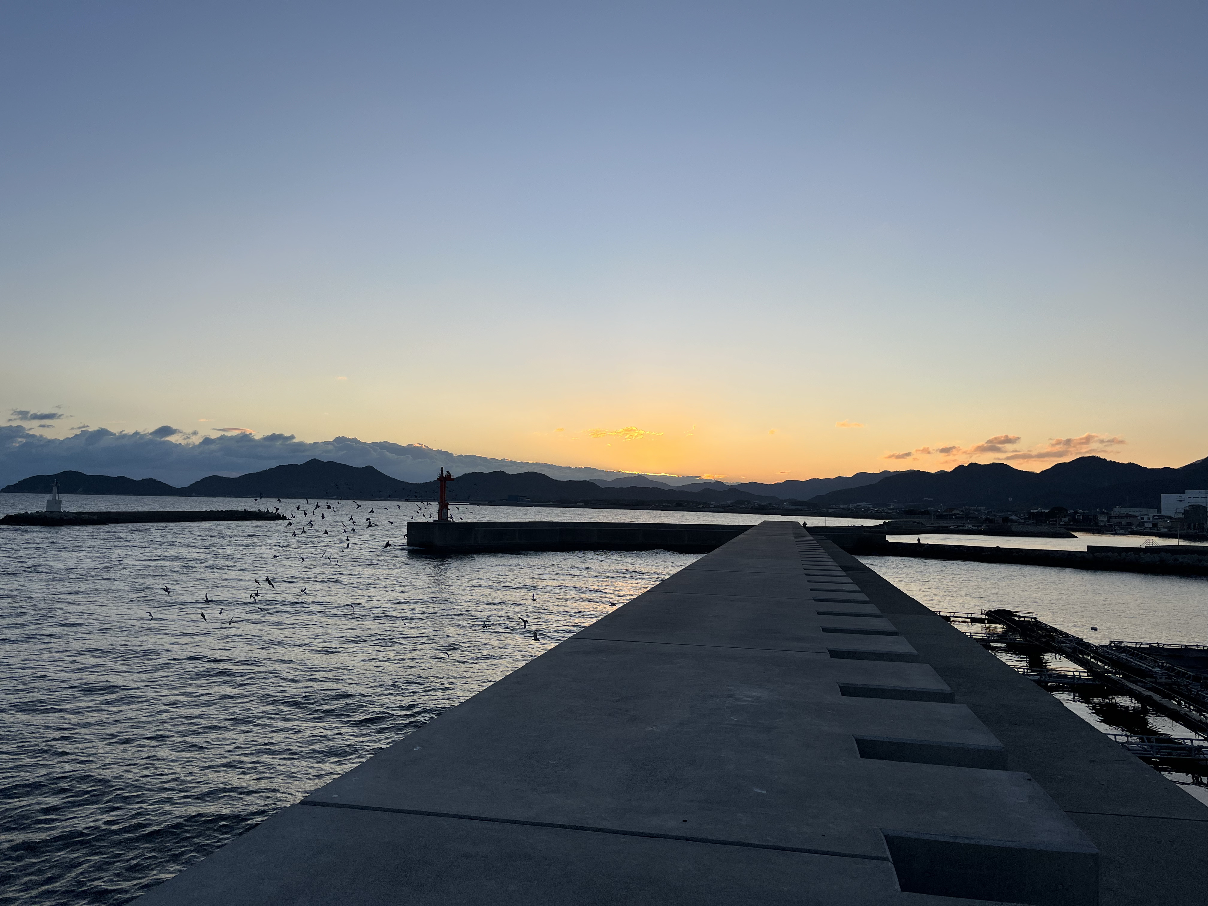 気温3℃、晴れ、冷たい北風が吹き海には所々に白波が見えます。小豆島はくっきり、淡路島、六甲山、中国山地の山々も微かに見えています。虎丸山も変わらず容姿を誇っています。この波止の東端から鳩の群れが飛び立ち、暫くして、太陽が大麻山の向こうの雲の上から姿を見せました。飛行機が青空の広がる上空を軽く爆音を響かせながら3機、時間を空けて、通り過ぎて行きました。釣り客はテトラに2人です。大型貨物船Azul Brisa(300m、船幅50m)の赤い船体が東に向かっています。