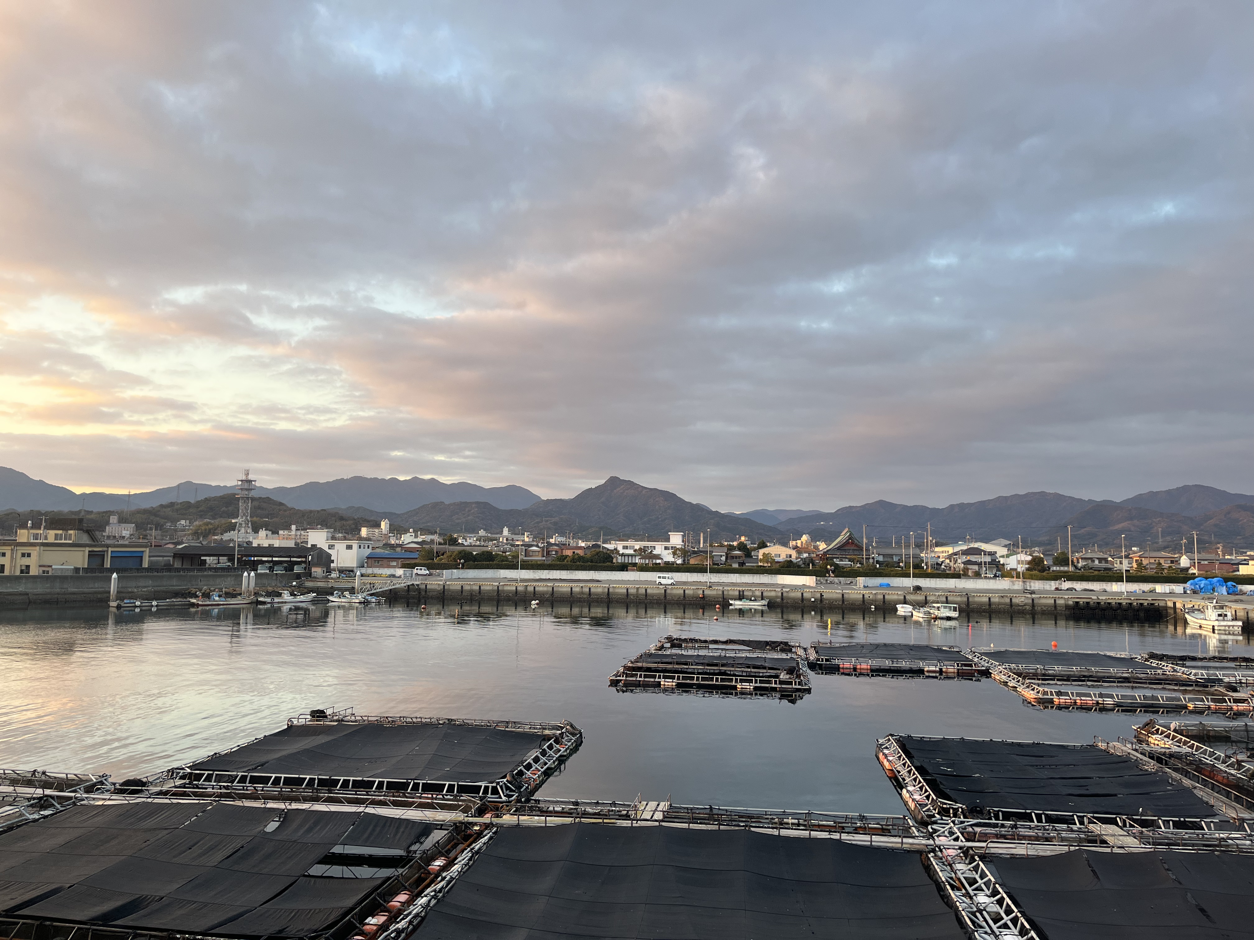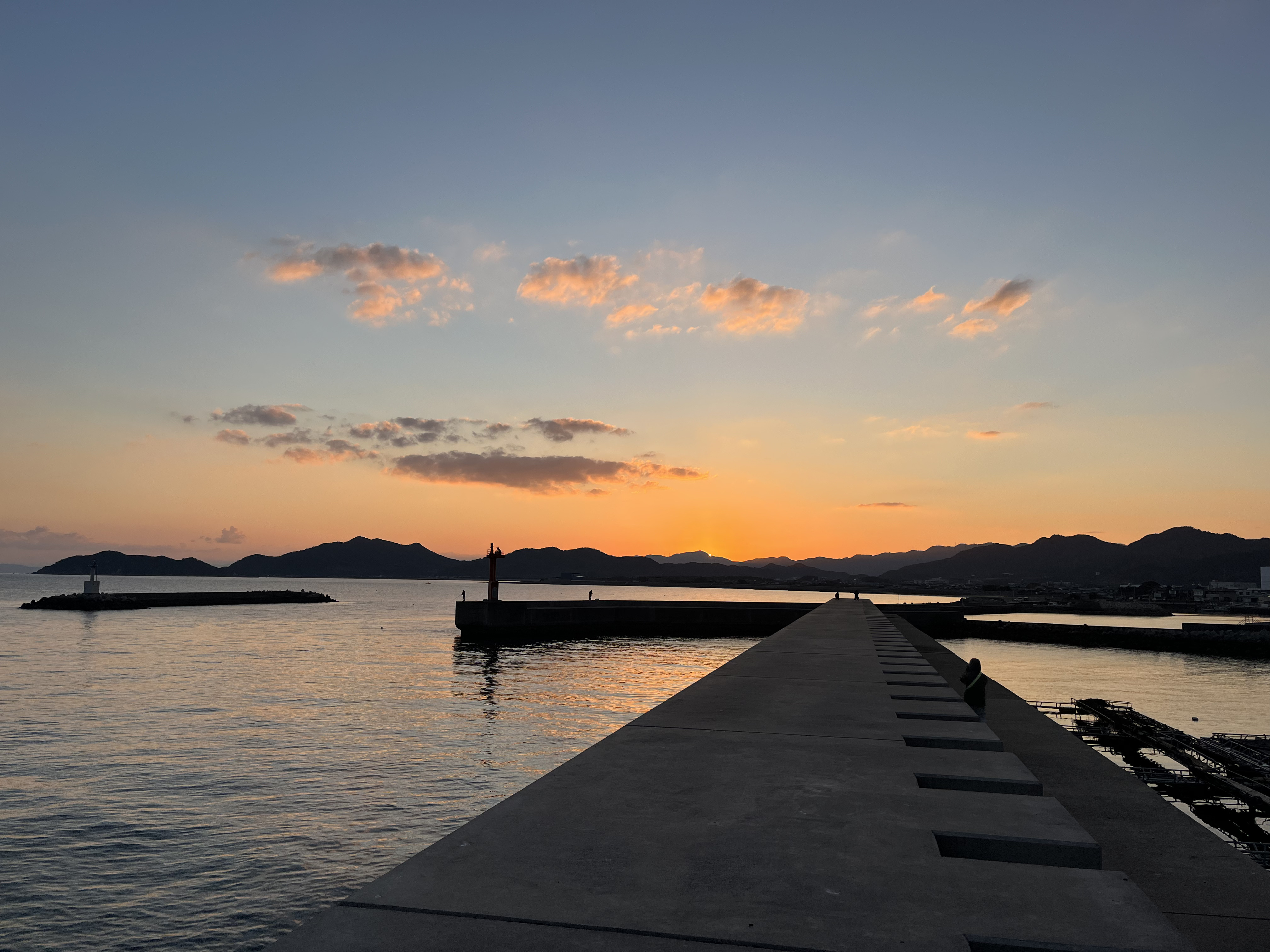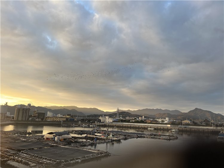気温4℃、くもり、雲がやや厚く西から南の空に拡がっています。十五夜の月の入りが見られませんでした。東から北の空は晴れ、7時19分12秒、太陽が大麻山の南の斜面に姿を見せました。日の出位置は冬至の最南端から北へ移動を始め。日の出時刻はまだ遅くなっています。釣り客は赤灯台に2人、テトラに2人です。港では養殖フグの初荷の準備が始まっています。