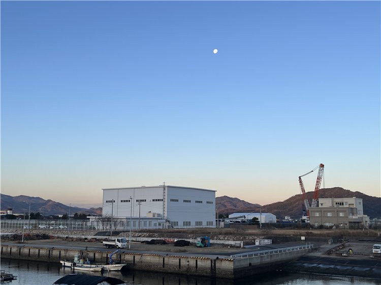 気温5℃、快晴、風は吹き流し角度70°くらいでしっぽが垂れ下っています。西の空には十六日の月が残り、東の空には雲があって、暫くして、雲が割れ、雲の縁を輝かせながら太陽が姿を見せました。釣り客はゼロ。海にはバラ積みの大型貨物船Pacific Power号(245m、船幅43m)が小豆島南の航路を西に向かい、空にはエアロK のEOK316(仁川→関空、A320)が頭上を降下中です。