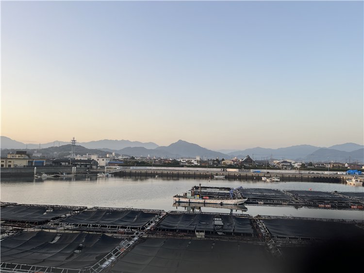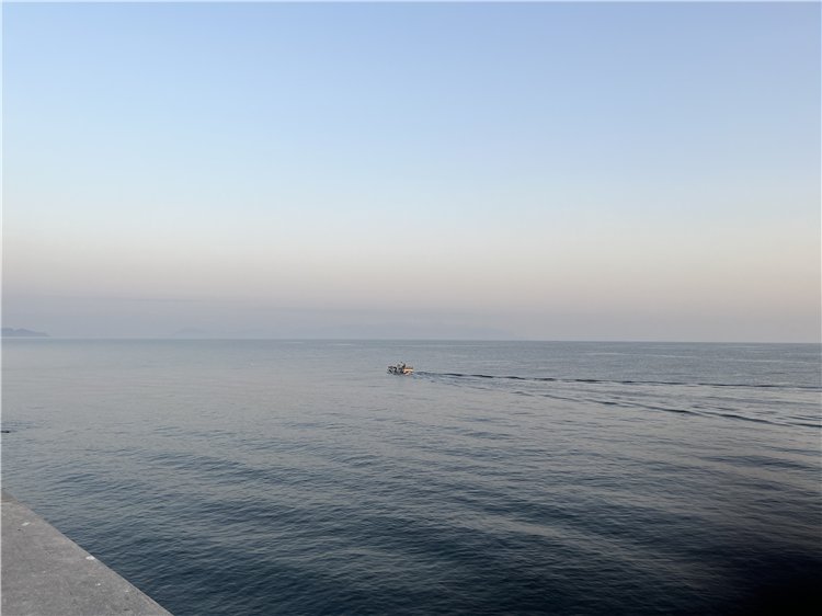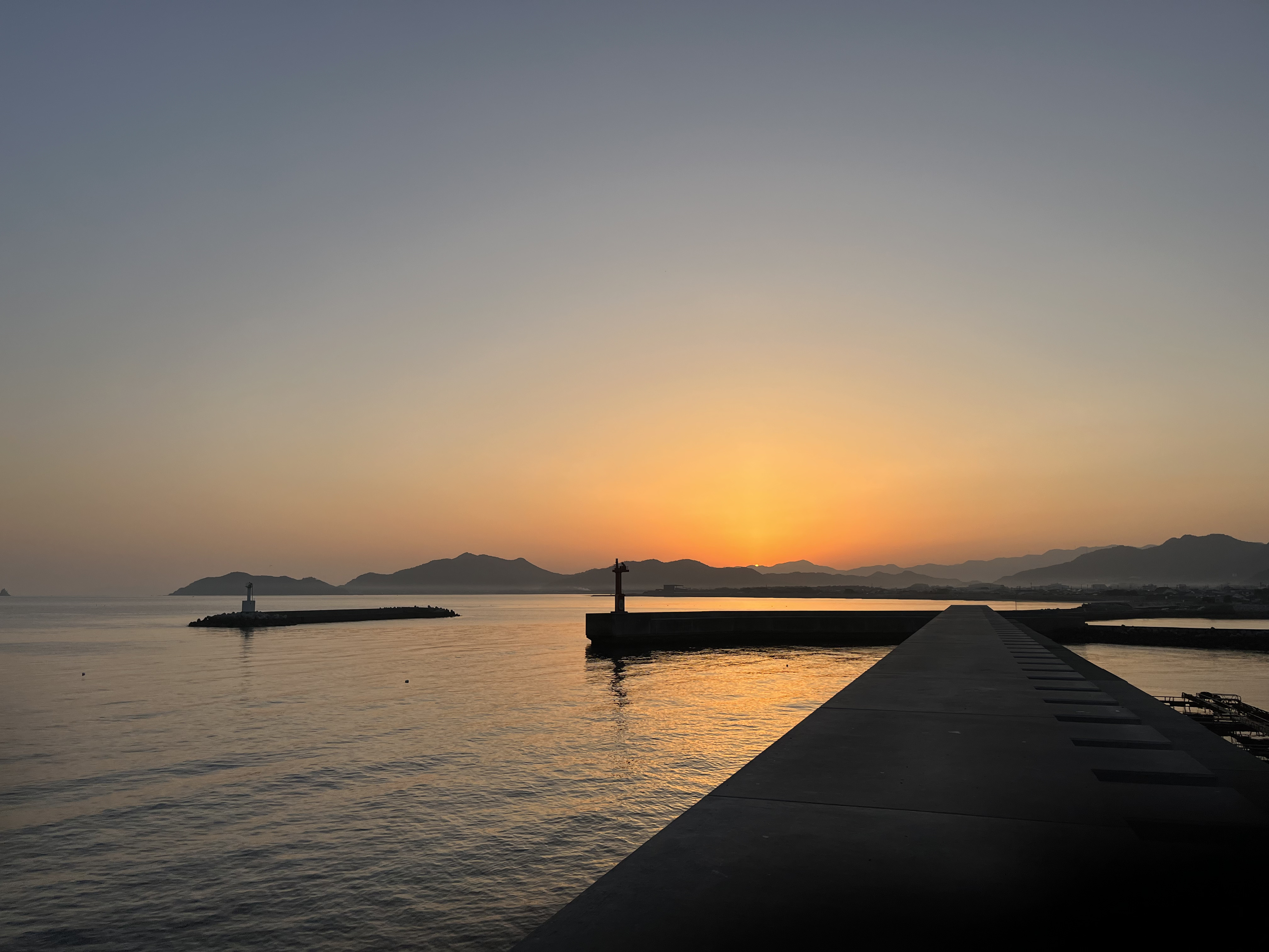 気温6℃、快晴。雲一つりません。水平線から周囲の山々には靄がかかり橙色がグラデーションでひろがり、天空は青空です。風は吹き流し角度30°くらいで穏やかに吹いています。7時16分34秒、太陽が大麻山の山の端に出て来ました。釣り客はゼロ、港ではフグの出荷の準備作業が始まっています。日の出時刻が少しずつ速くなっています。今頃は20秒、これから毎日1~2ずつ早くなり、お彼岸頃は前の日より1分20秒くらい早くなります。