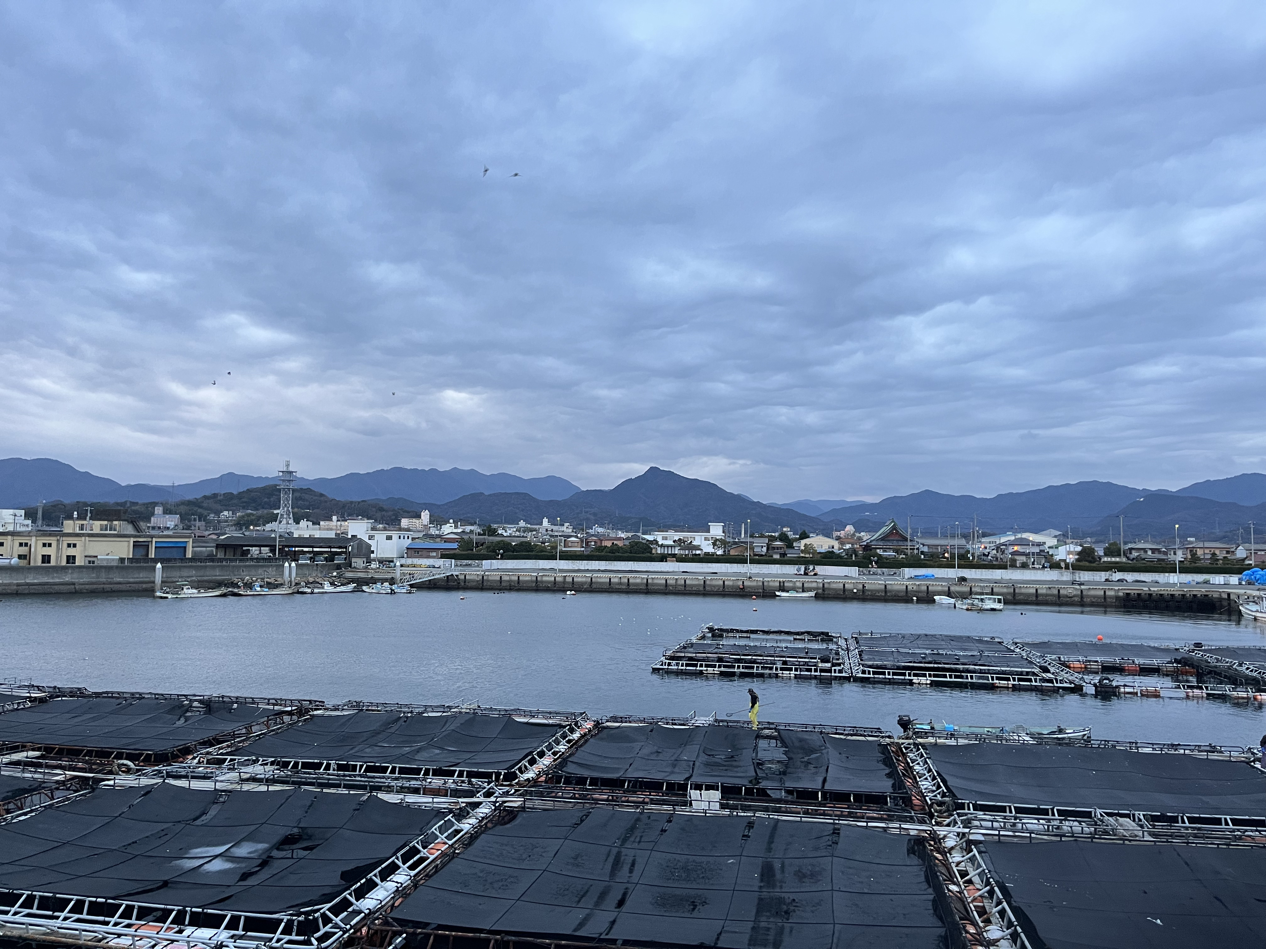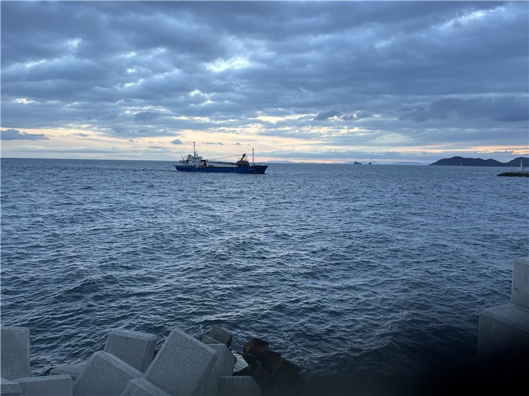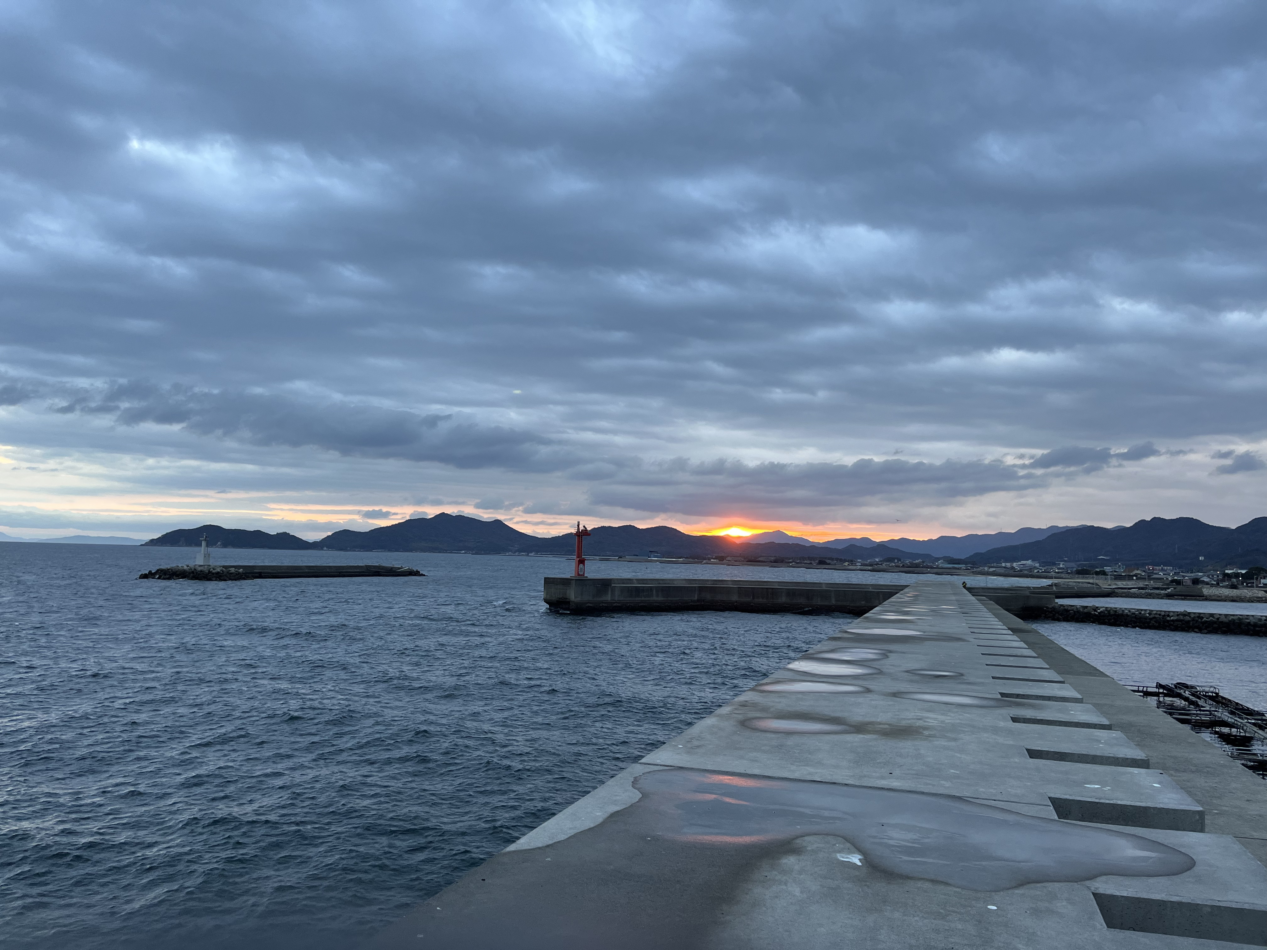 気温8℃、曇り、西の風がやや強く吹いて、白波も所々に見えています。輪郭のはっきりしない太陽が大麻山と雲の合間を紅く染めながら出て来ました。北の空は雲が薄く明るくなっています。沖合から貨物船が1艘、三本松港に近づいて来ています。釣り客はテトラに2人、波止の近くの釣り人がメバル、ガシラが釣れたと楽しそうに話してくれました。