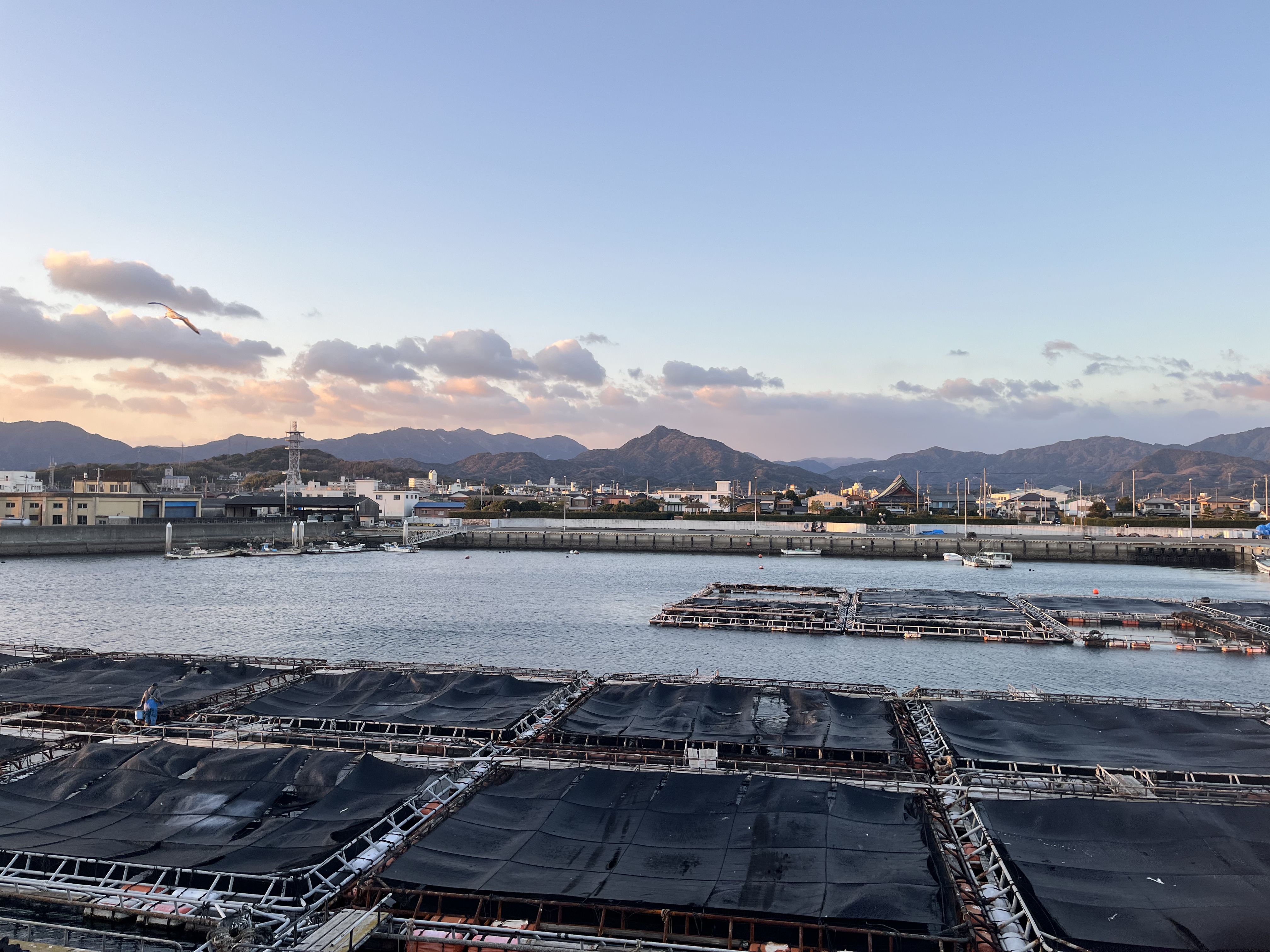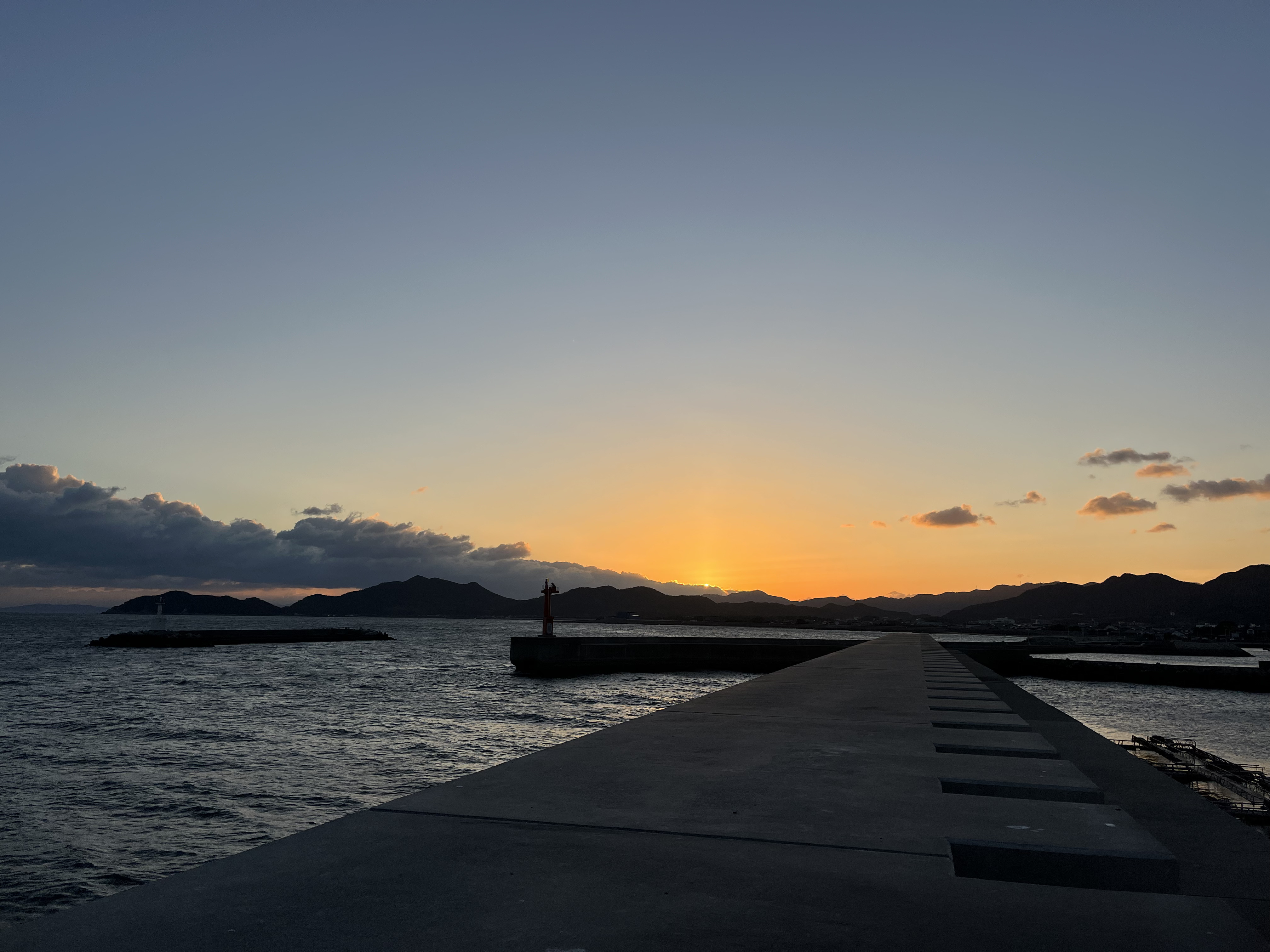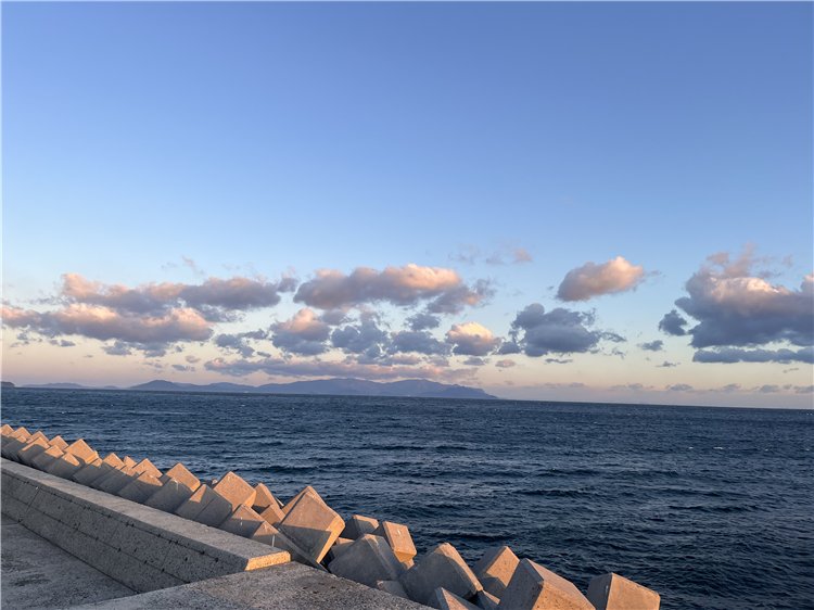 気温1℃、快晴、冷たい北西の風が吹き流し角度80°で強く吹いています。海には白波が立ち、赤灯台、白灯台、この波止にもぐいぐい押し寄せて来ています。波止の上も風が強く、吹き飛ばされそうです。輝く太陽が大麻山の向こうの雲の上から出て来ました。Asian Jewel(アジアの宝石、115m,船幅20m)という名の真っ白の貨物船が東に向かっています。釣り客はゼロ、港ではフグの生簀の作業が始まっています。