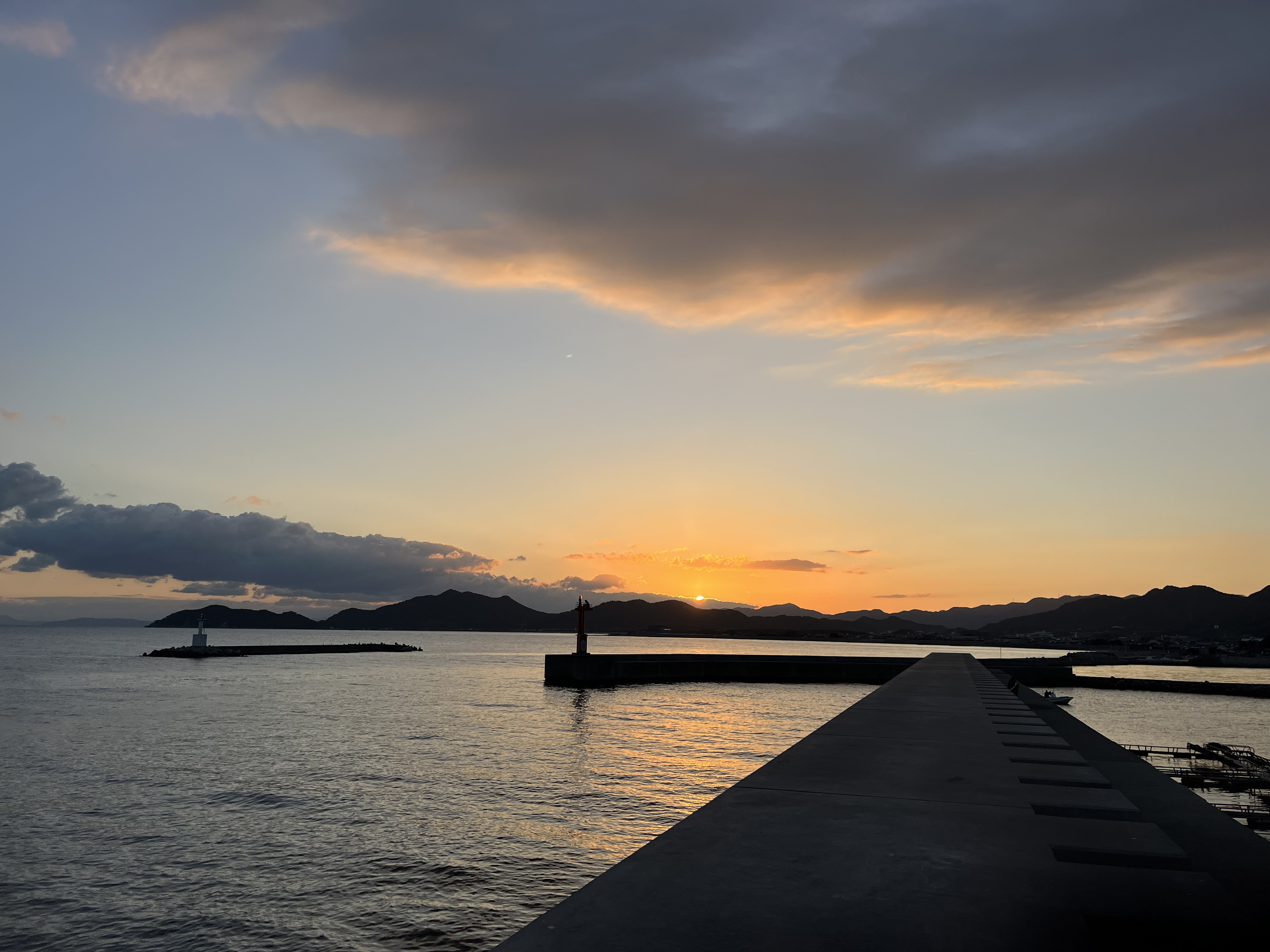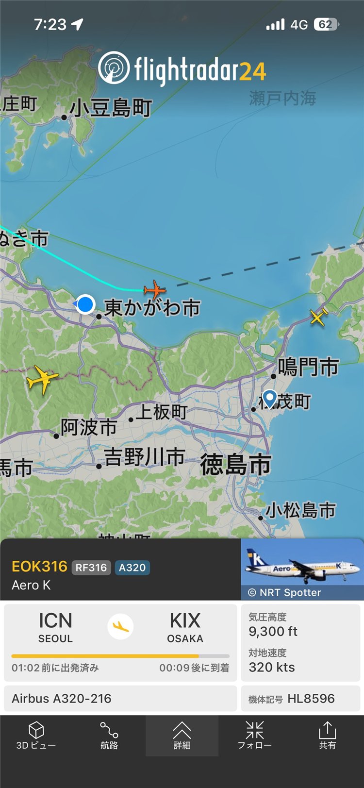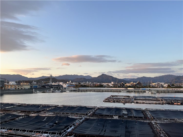 気温3℃、晴れ、雲は稜線伝いや水平線に近い所に浮かび、風は弱く吹いています。伊座山の向こうの雲の端が輝き、日矢も飛び、太陽が姿を見せました。釣り客はテトラに1人。港ではフグの生簀の作業が始まっています。沖合いをEOK316機(仁川→関空、A320、Flightradar24から)が関空に向かって方向を変え、高度を下げて行きました。