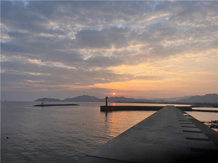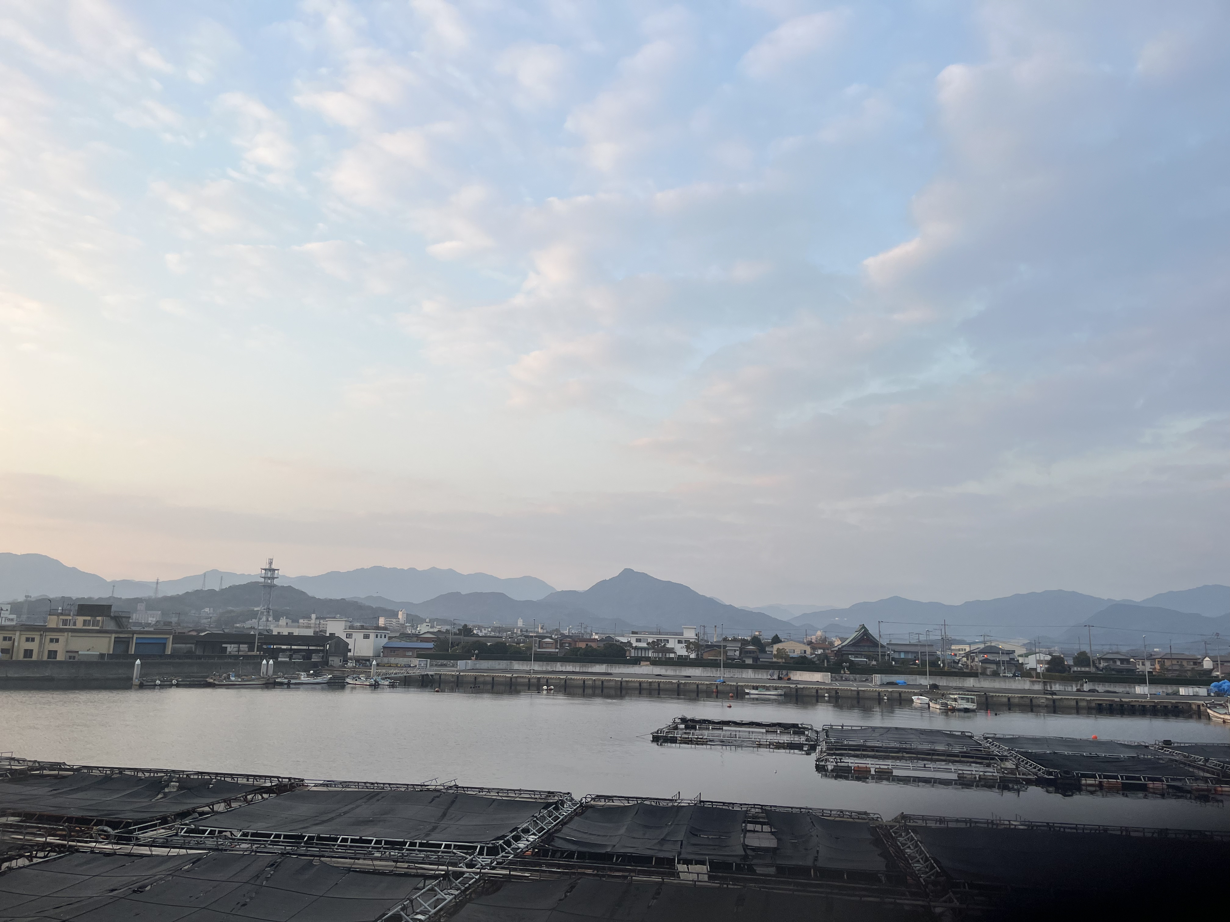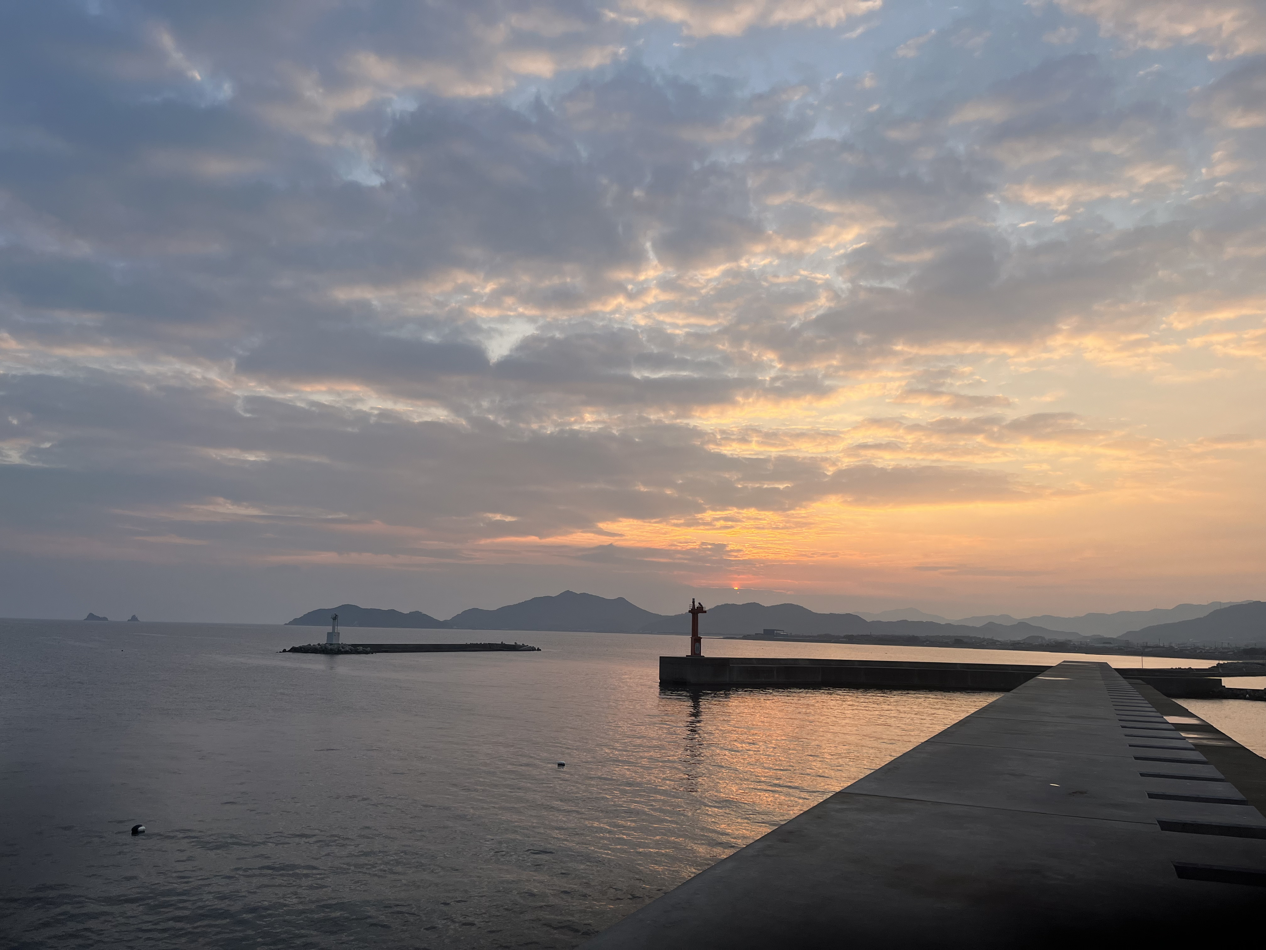 気温5℃、曇り、西の風が緩く吹いています。海には霧か霞が懸り、淡路島も小豆島も見えません。伊座山塊の上の雲の端が細く金色になっています。青空も所々に見えています。暫くして、紅い太陽が雲の上に姿を見せました。釣り客はテトラに1人、港では生簀作業が始まっています。