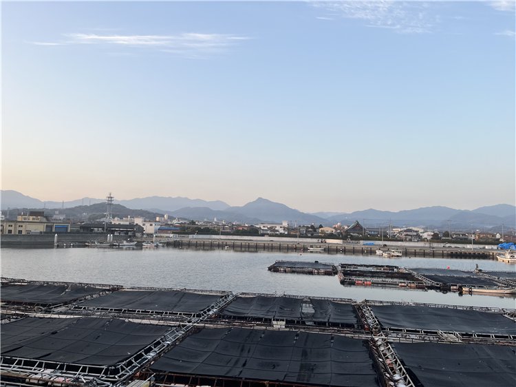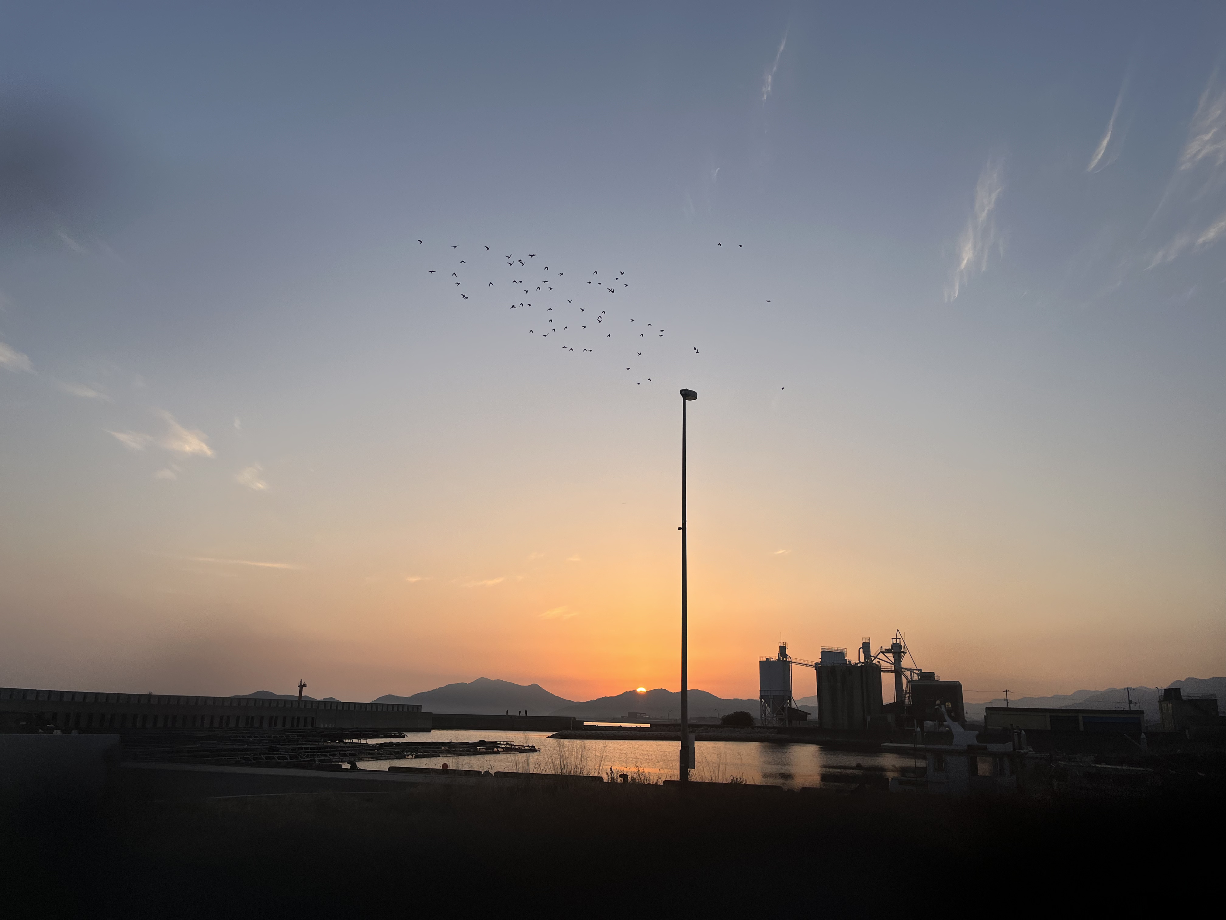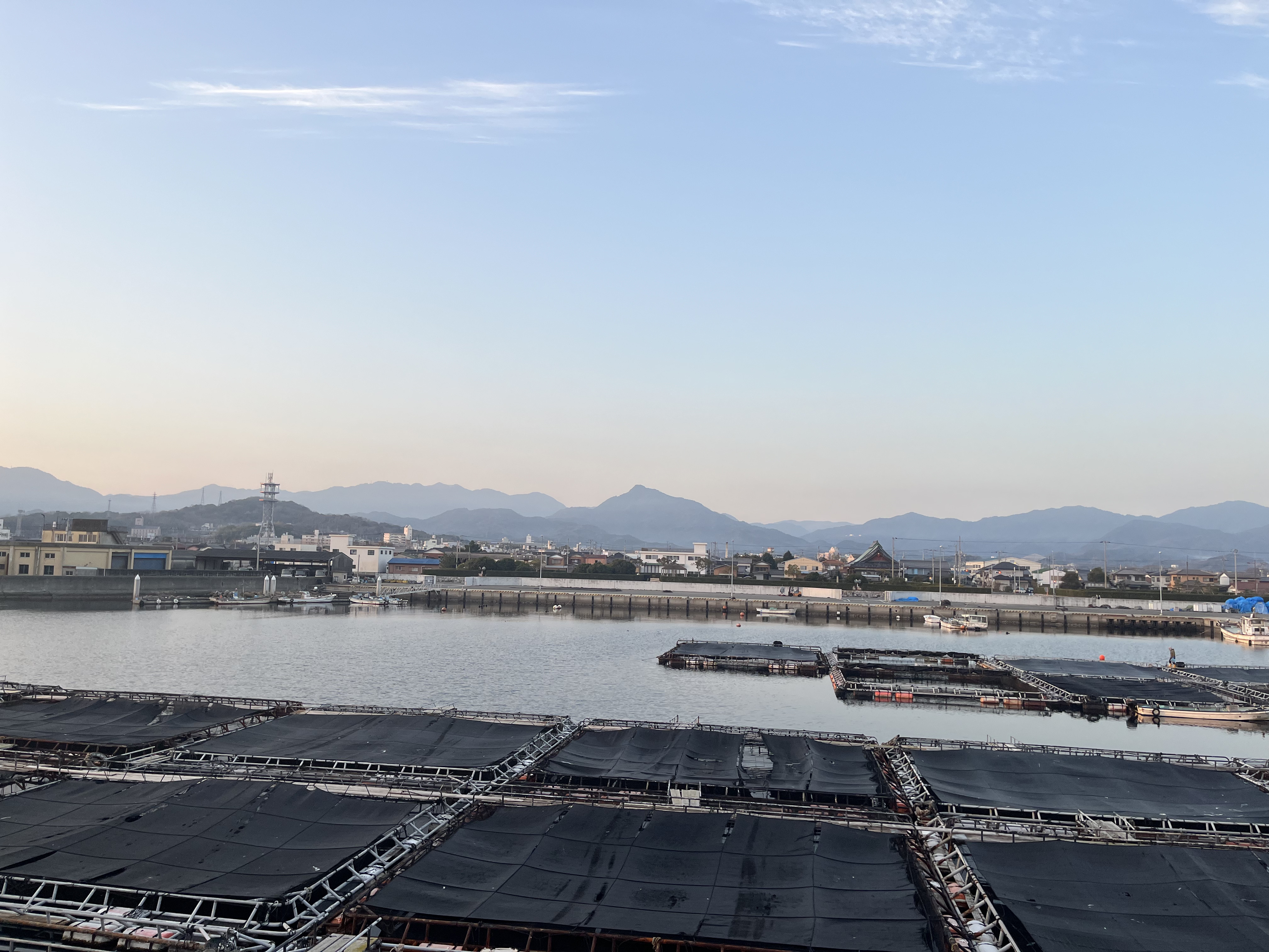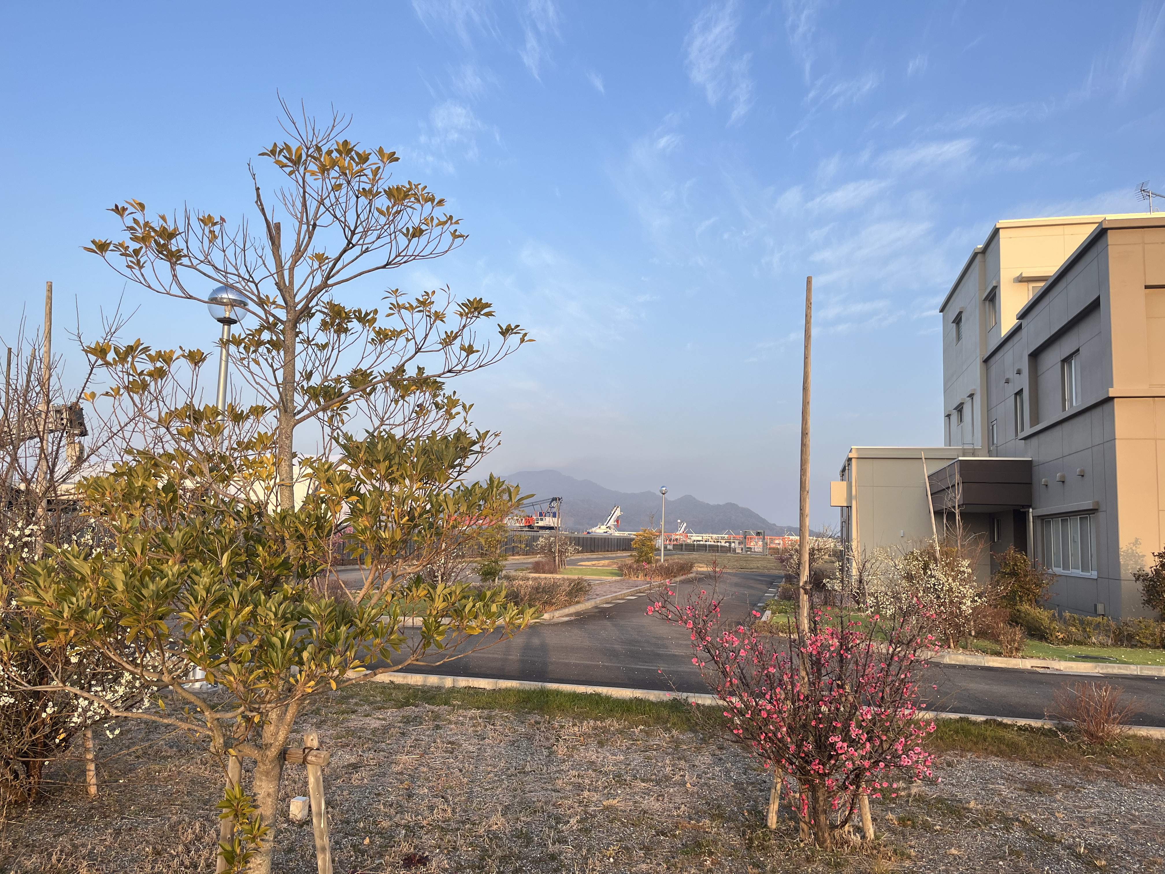 気温4℃、青空に薄く雲が懸っています。北西の風が吹き流し角度30°くらいで吹いています。撮影地点に着く前に紅い太陽が伊座山塊に出て来ました。鳩の群れが飛び立ちました。南の空に逆三日月が何とか見えています。海は穏やかです。釣り客はゼロ。浄化センターの梅の花が満開間近です。