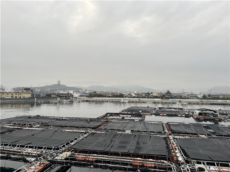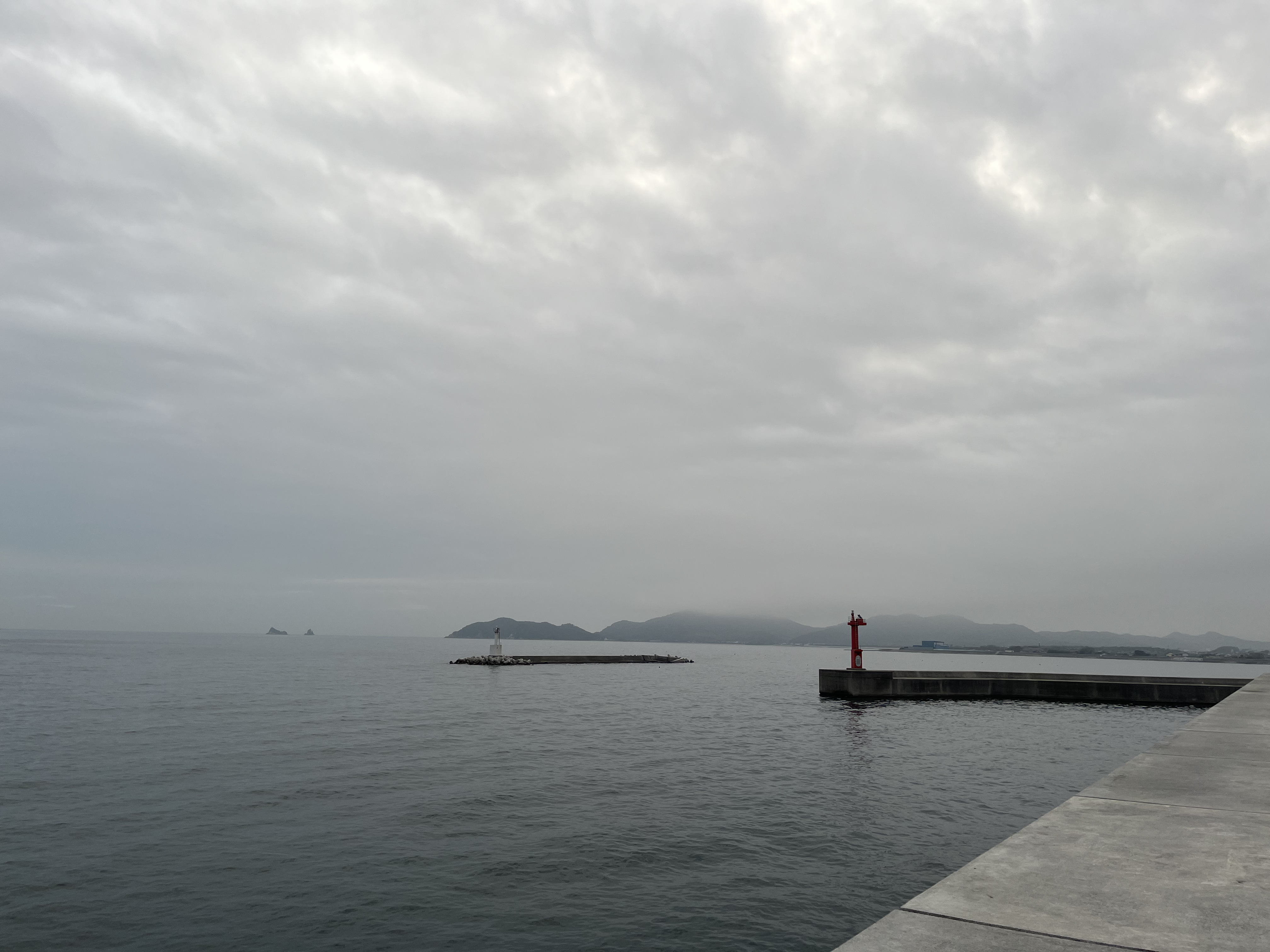 気温9℃、曇り、雲が空全体を覆い、与治山頂上付近も雲が懸っています。水平線にも霧が掛かり、里山もかすかに見えるだけ、阿讃山脈はほとんど見えません。試験場の吹き流しはだらり状態、海には少しうねりがあります。海水が港に流れ込んでいます。太陽は雲の向こう。釣り客は東波止に1人、テトラに1人です。北の空の雲に切れ間ができ、明るくなって来ました。