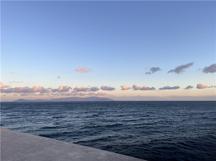 気温1℃、快晴、風が強く、吹き流しも角度80°ぐらいで暴れています。海はうねりと白波が立ち、赤灯台で波飛沫が上がっています。釣り客はゼロ。太陽が伊座山塊の真ん中の山頂付近から姿を見せました。虎丸山もほんのり白く、阿讃の峰々は雪化粧です。半分くらいになった月が虎丸山の右上空に残っていました。