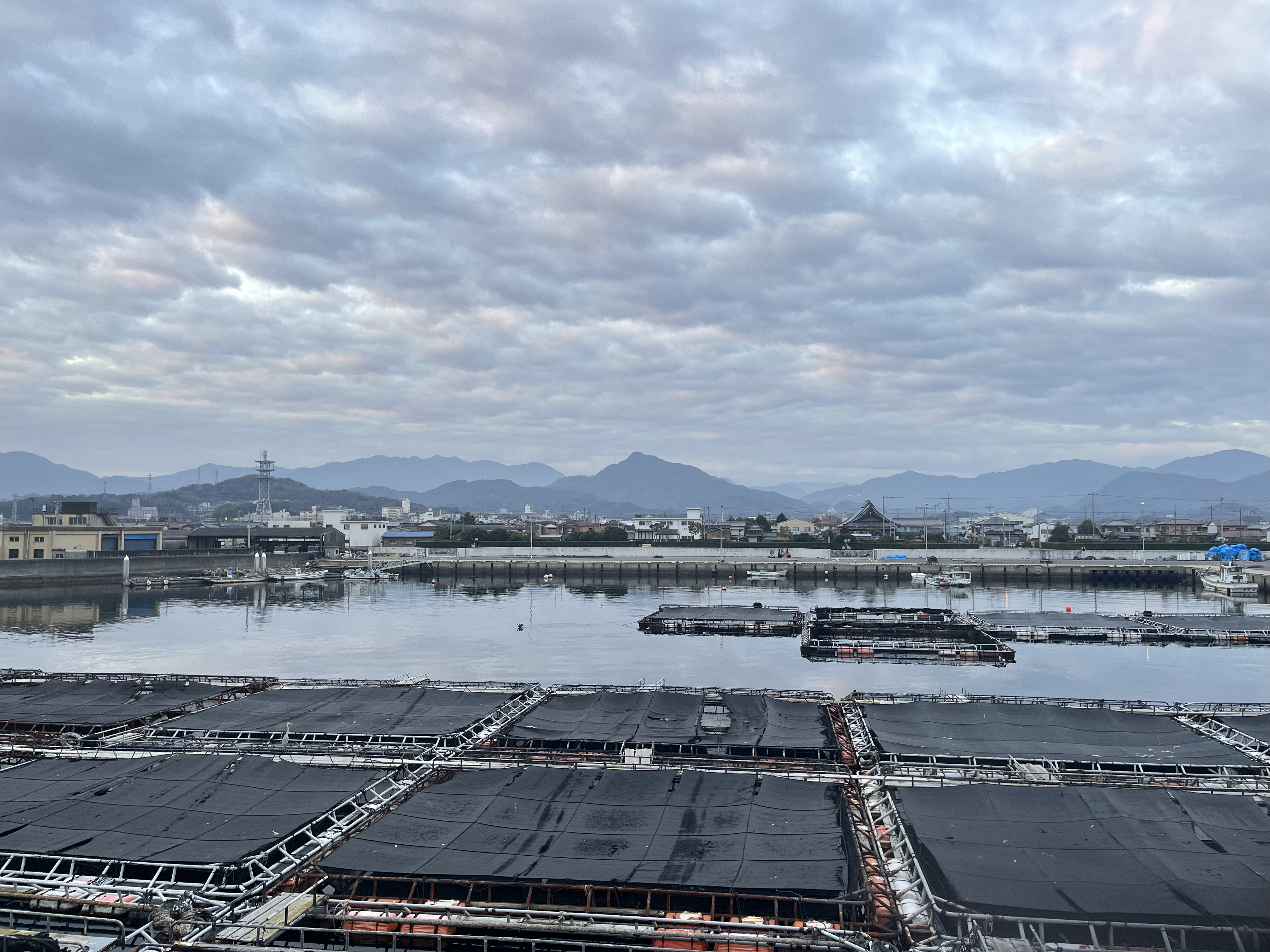 気温9℃、曇り、温かい朝です。西寄りの風が穏やかに吹いています。所々青空も見えています。海は穏やか、テトラの沖合いに2艘の漁船が作業をしています。太陽が伊座山塊と与治山塊のくぼみの南側のスロープに一瞬姿を見せました。釣り客はテトラ1人、向こうの港に1人です。港では、大型のトラックが横付けされ出荷の準備が始まっています。帰り際、雲の上に太陽が出て来ました。
