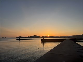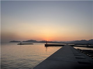 気温3℃、快晴、東の空が橙色に染まり、一条の白いジェット雲が東に向かっています。風はほとんどなく海も鏡面のごとく穏やかです。西の空に丸い月が残っています。7時8分、太陽が伊座山塊の北の斜面に姿を見せました。釣り客はゼロ、港のフグの出荷準備作業は一段落で、トラックの到着を待つばかりのようです。釜山と大阪を繋ぐ旅客船パンスターミラクル号が東に向かっています。