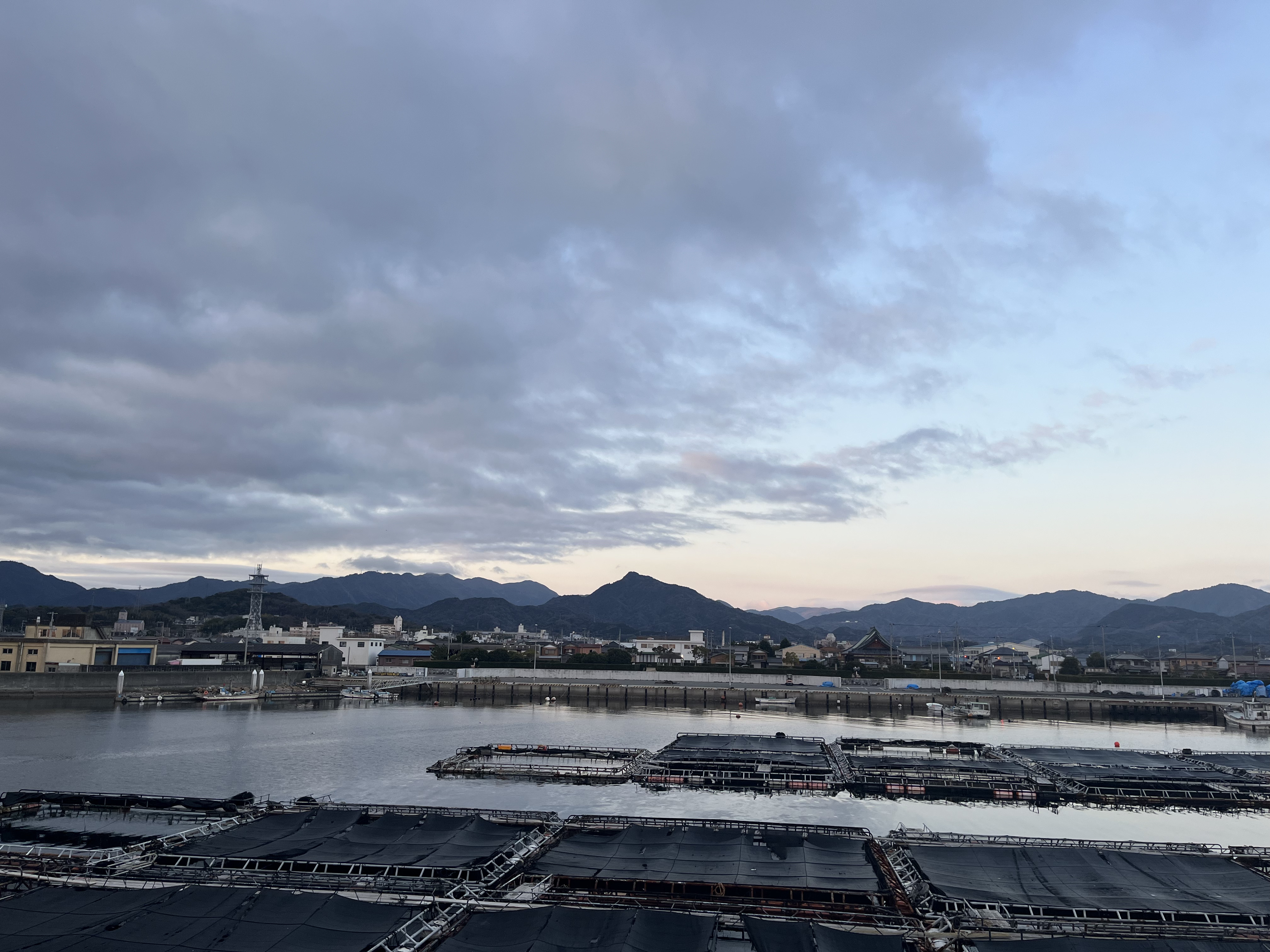 気温5℃、曇り、北西の風が緩く吹き、雲も西の方から晴れて来ています。東の空には少し厚い雲が懸り、太陽は与治山の北の斜面に一瞬姿を見せ、斜面に沿って雲に隠れて行きました。一子島の向こうの航路を黒い貨物船が2艘(152mと82m.FindShipより)が鳴門海峡の方に向かっています。釣り客はゼロ。くちばしだけが白い黒いカモ(オオバン?)が2羽、港のスロープ付近で遊んでいます。