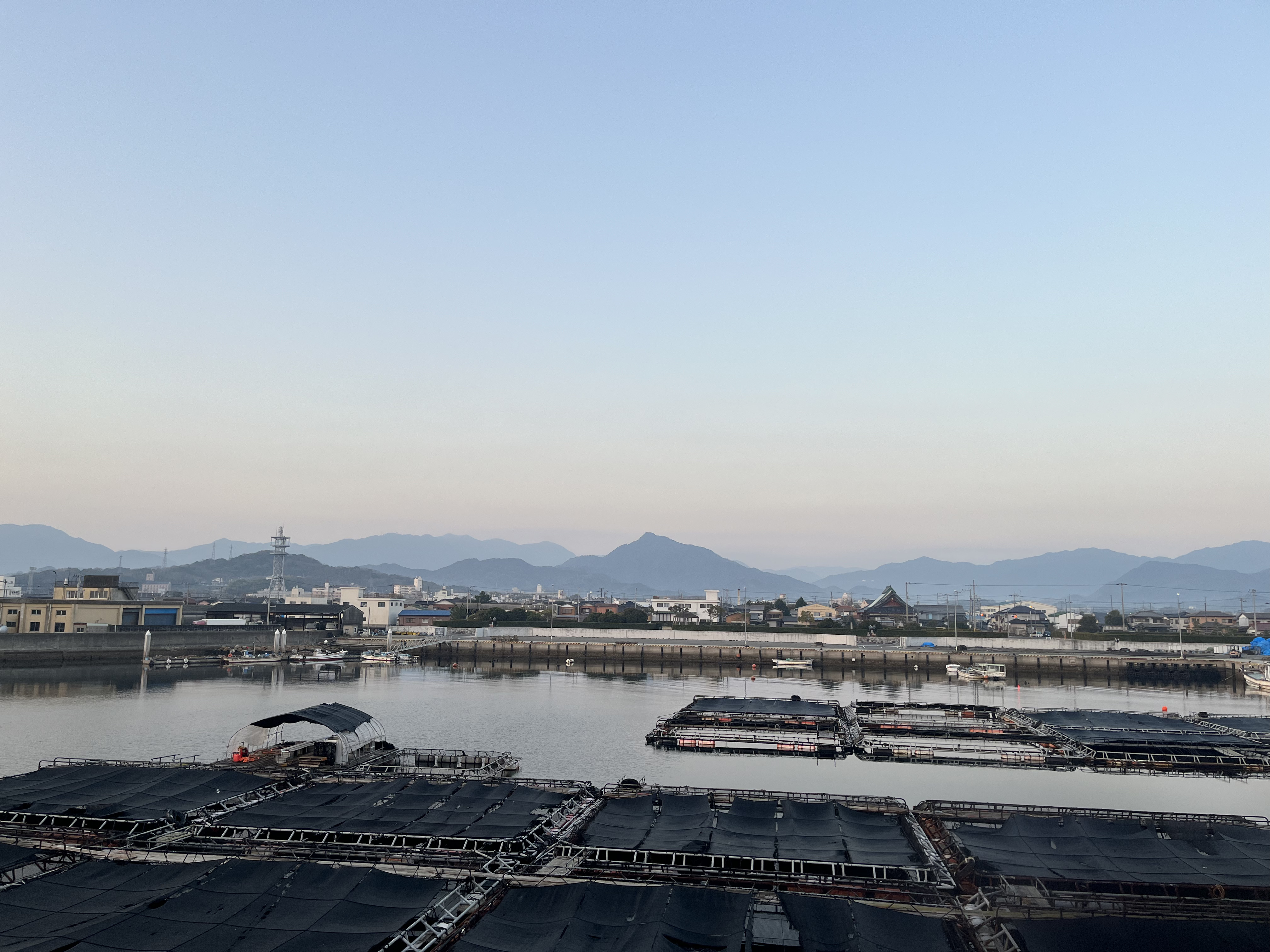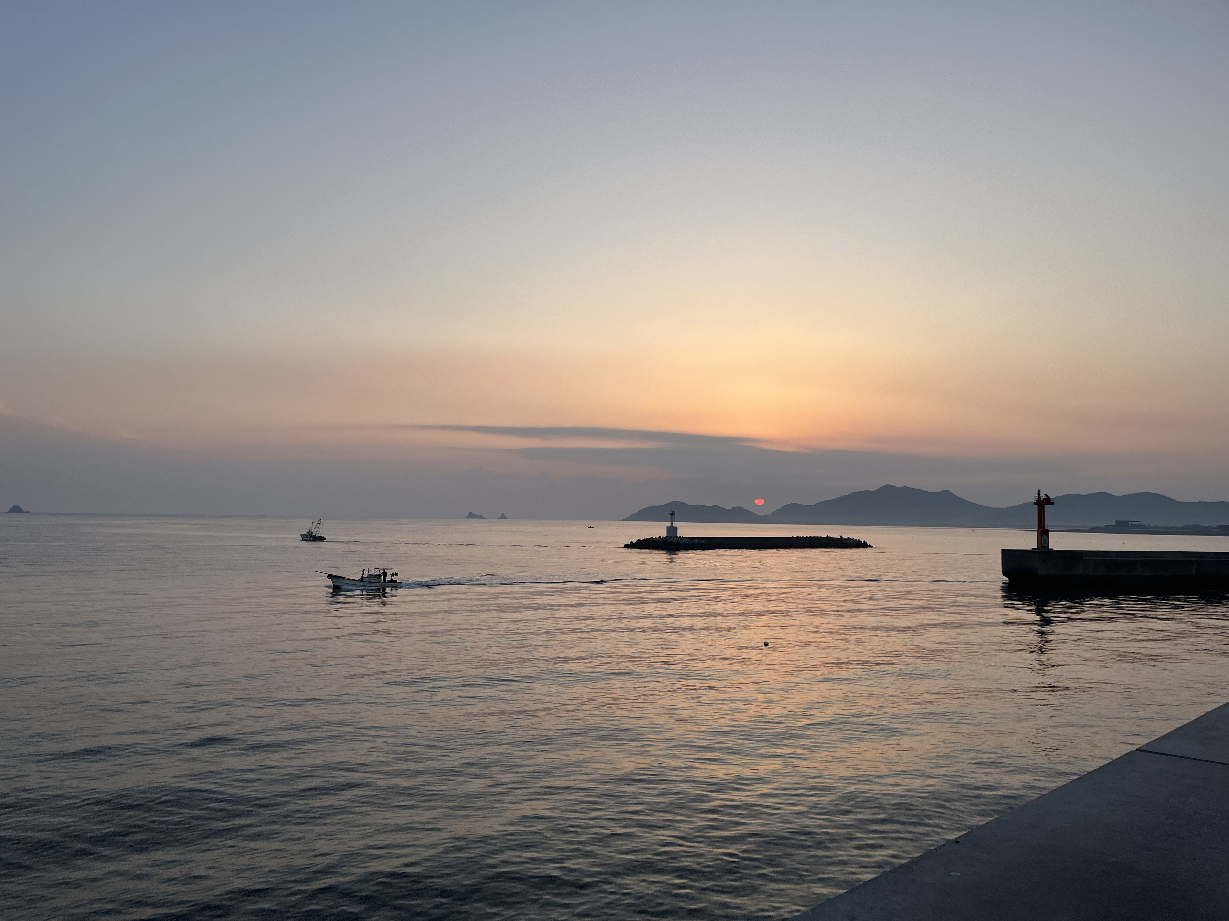 ◀ 春分の日です。気温5℃、晴れ、北西の風が吹き流し角度30°くらいで穏やかです。春霞で淡路島も小豆島も見えません。霞の中から紅い太陽が浮き上がって来ました。いつもの漁船が2艘、出漁です。釣り客はゼロ。散歩客がちらほらです。