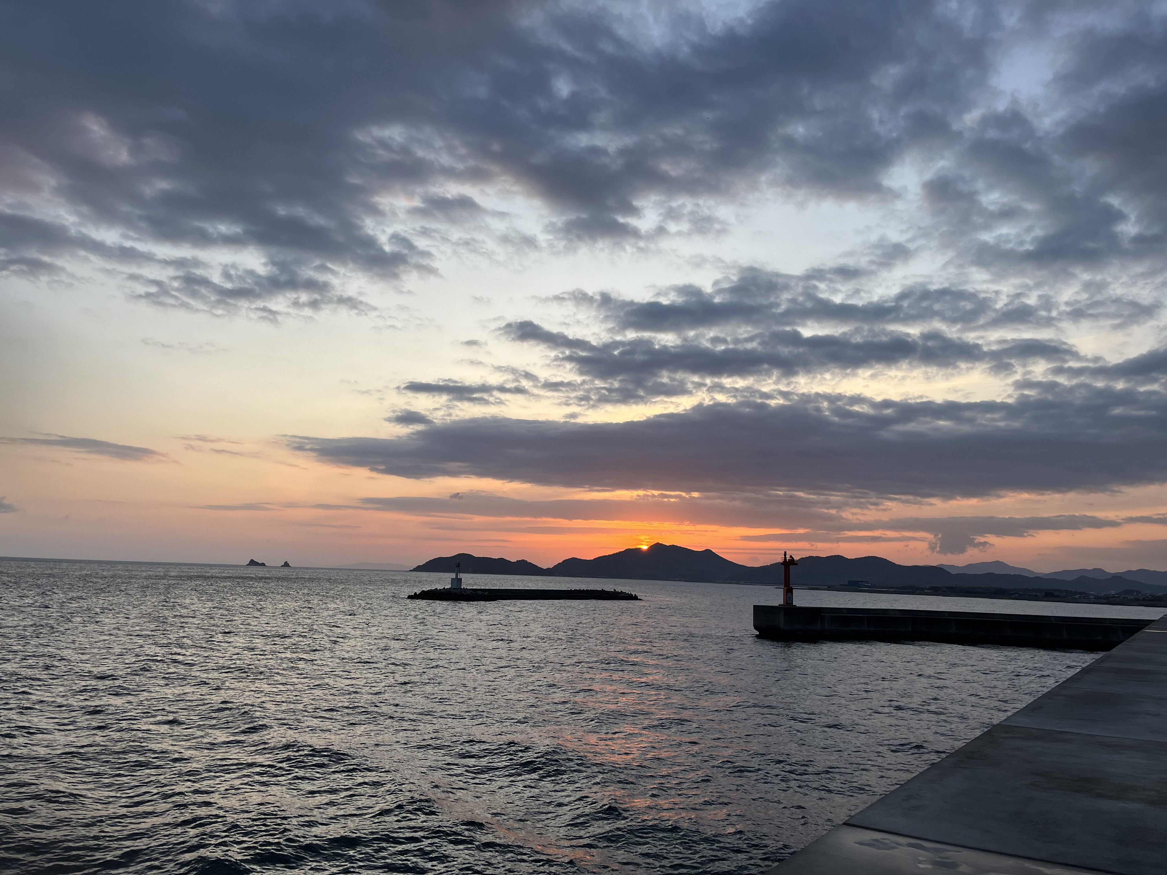 気温5℃、曇り、風はややきつく、海には所々に白波が立っています。東の空は晴れ、西の空に先ほどまで見えていた立待ち月の残月が雲に隠れてしまいました。6時35分03秒、太陽が与治山山頂から北寄りの谷筋から姿を見せました。これから日の出位置が与治山の北の斜面に移り、日の出時刻はどんどん早くなっていきそうです。釣り客はテトラに1人、港の作業も始まっています。